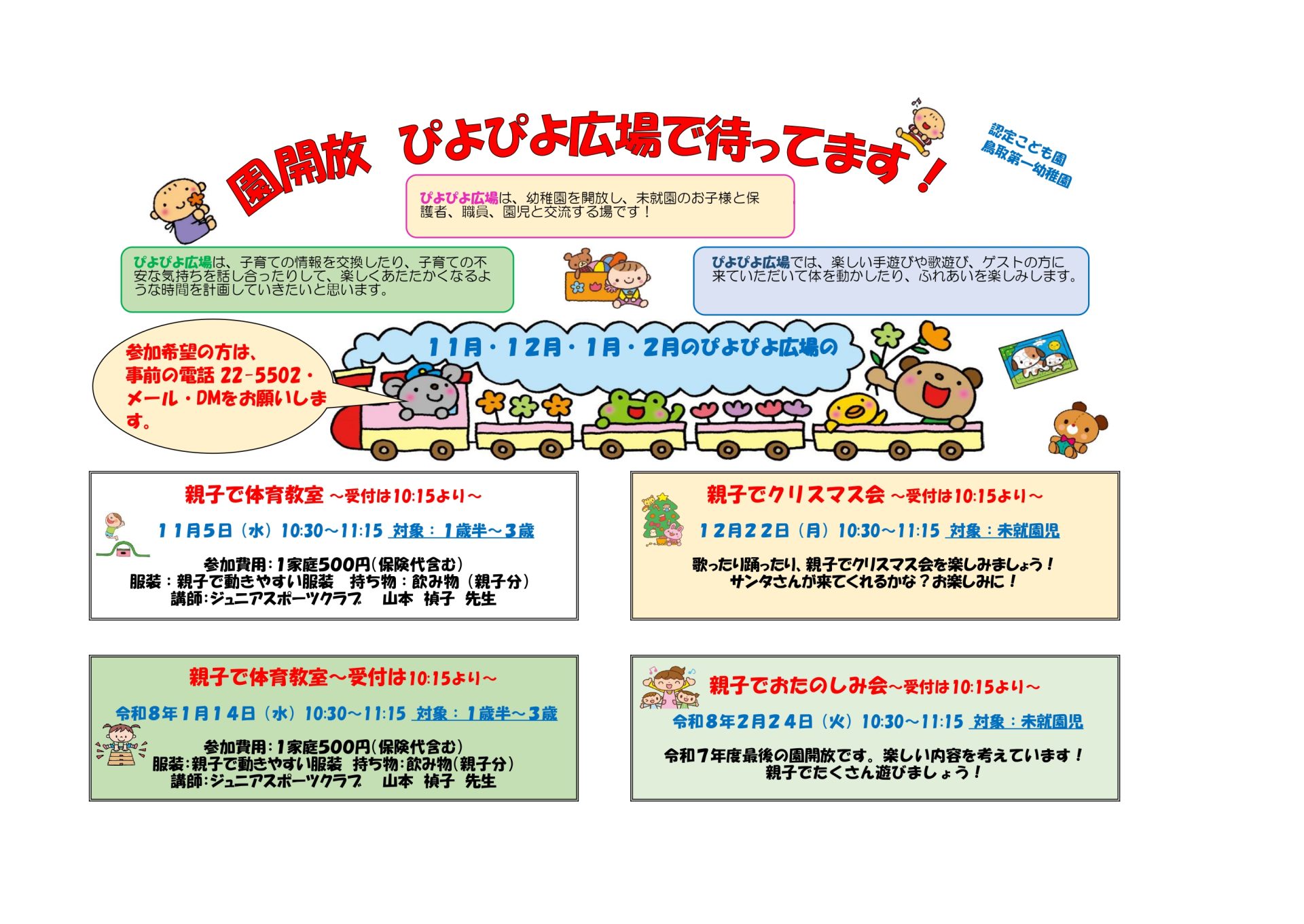 令和7年度11月・12月・1月・2月に園開放を開催します。詳しくは、画像掲示板「園開放」をご覧ください。参加希望の方は、幼稚園にお電話をいただくか、メールにてお申し込みください。
