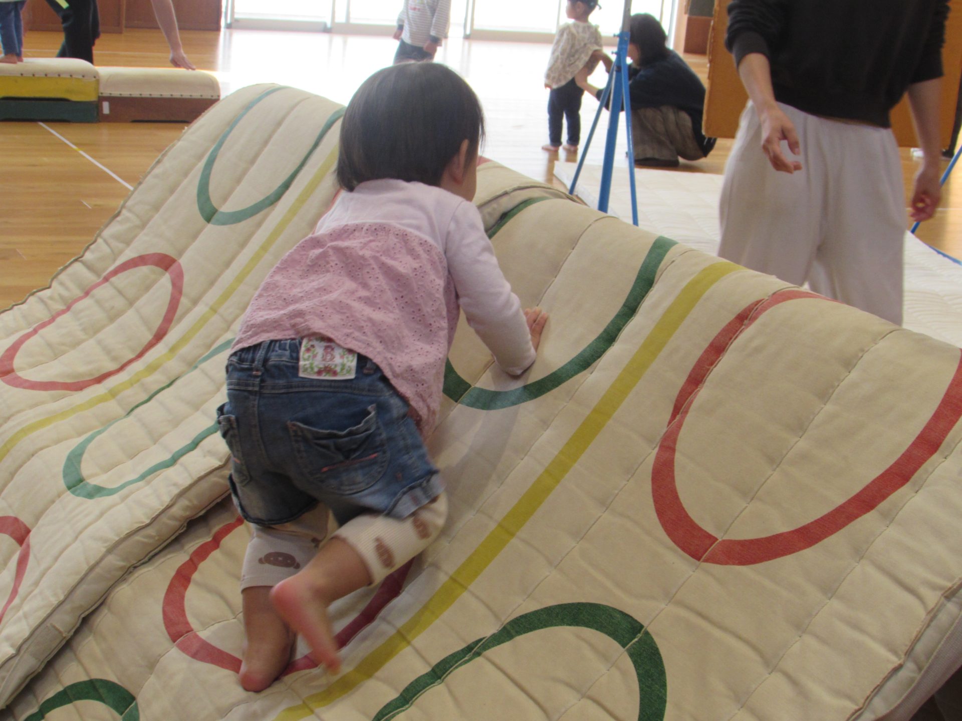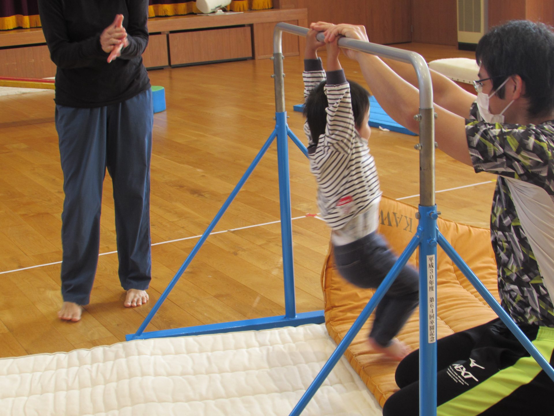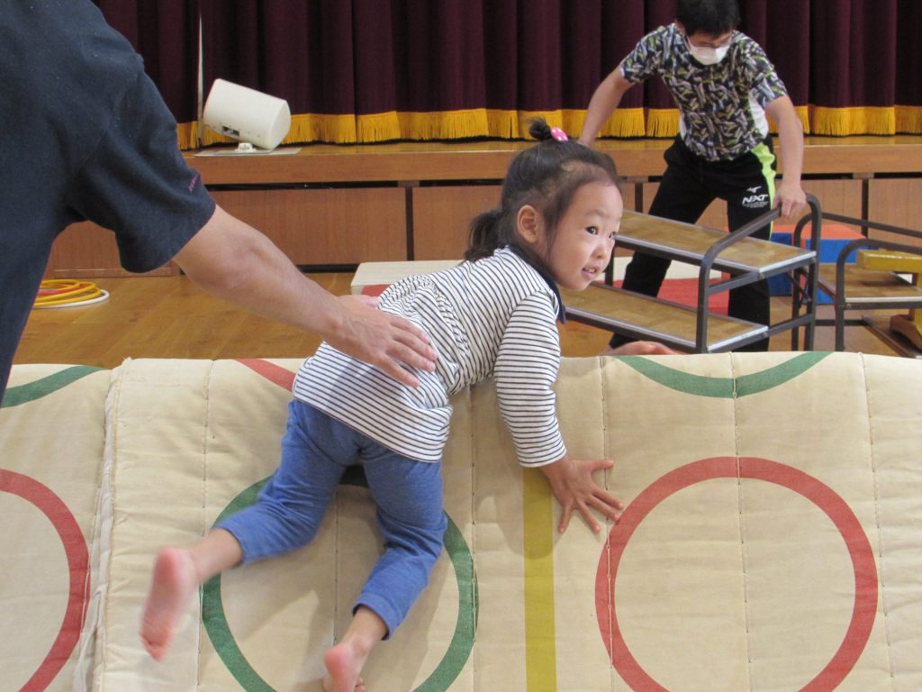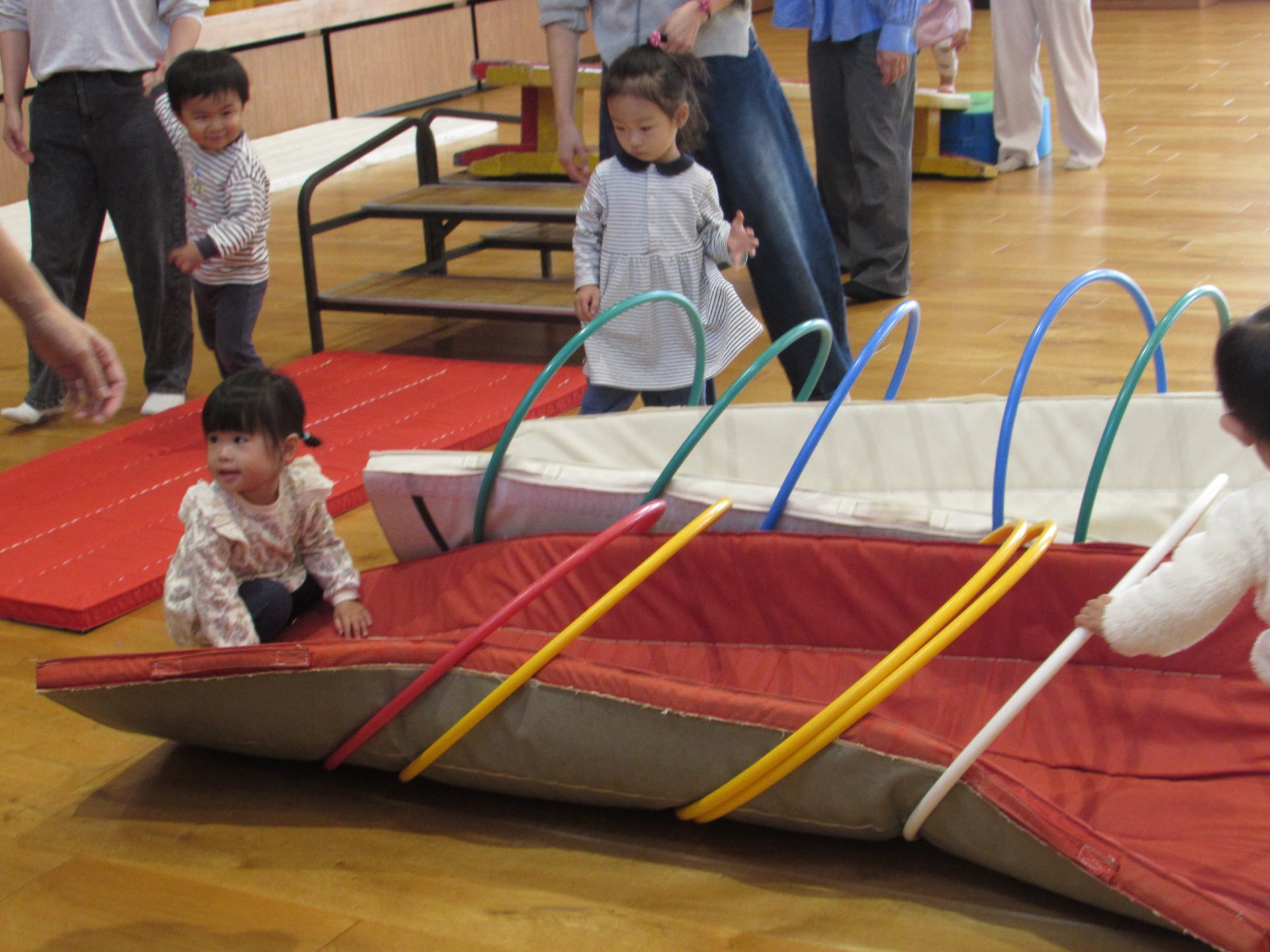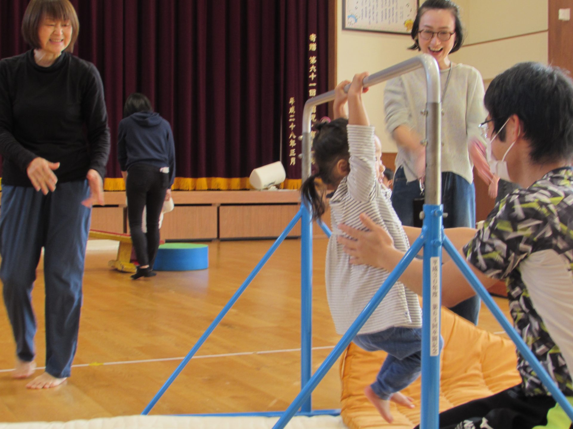 前回より少し難しいフープのトンネルに挑戦したり、鉄棒に自分の力でぶら下がったりして子ども達も楽しそうに参加していました!回数を重ね、平均台を使った一本橋やマットで作ったお山にも少しずつ慣れてきて、安心して渡ったり、登ったりする姿が見られるようになりました☆