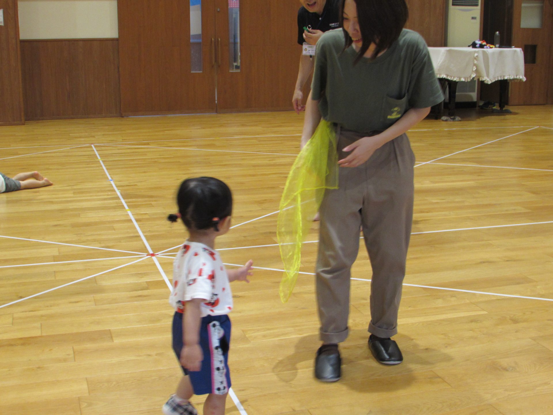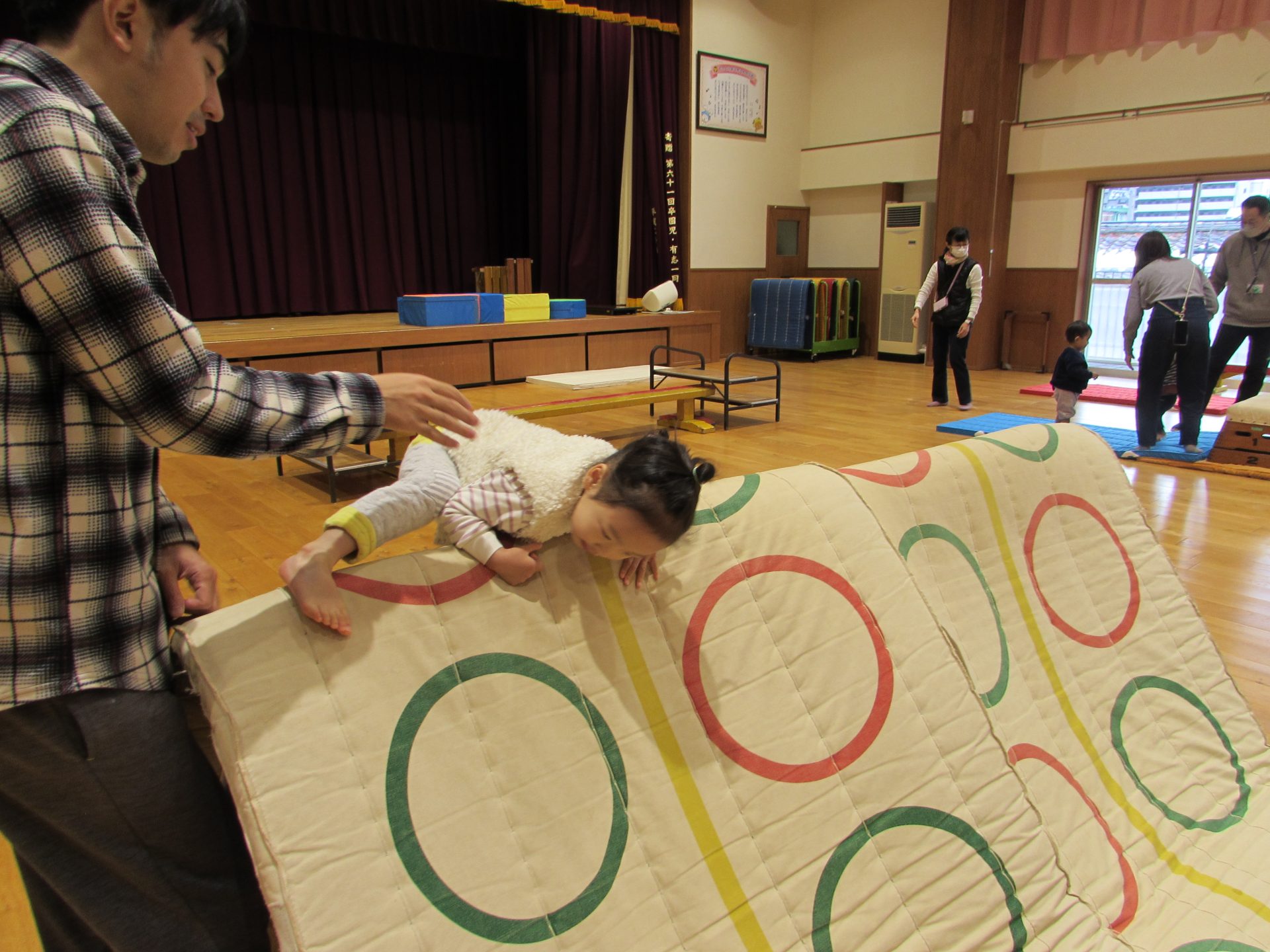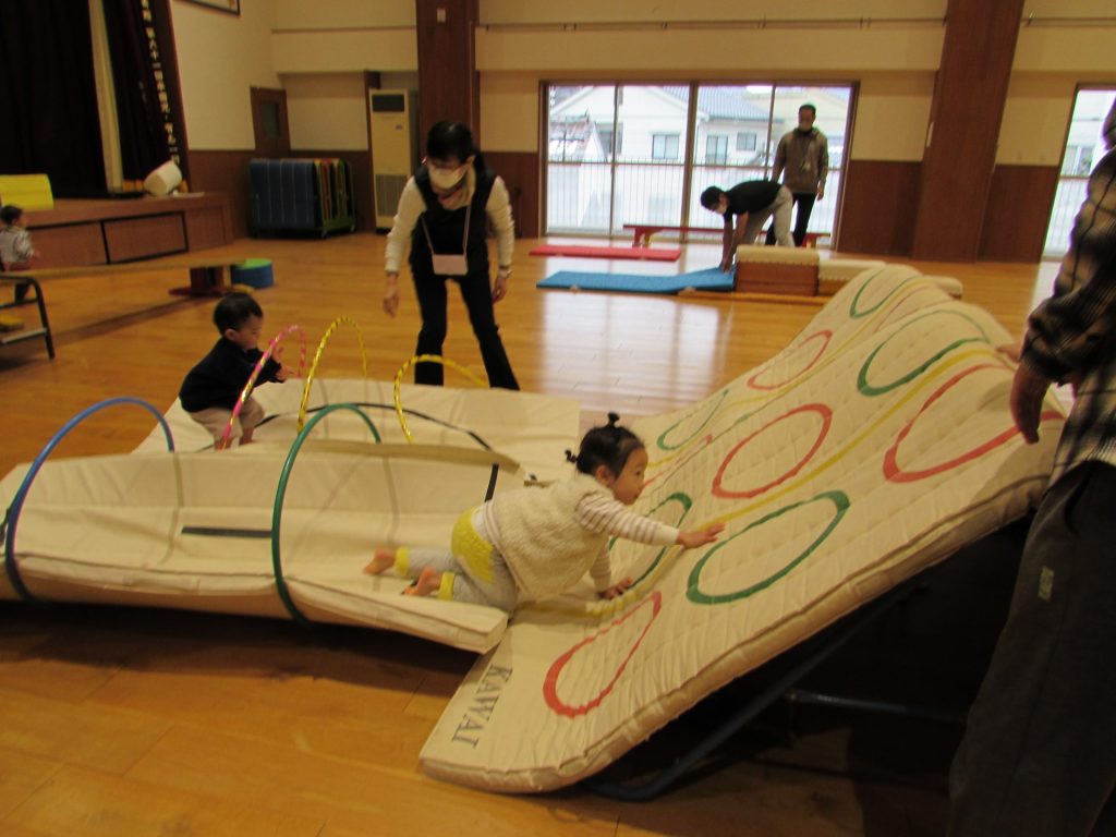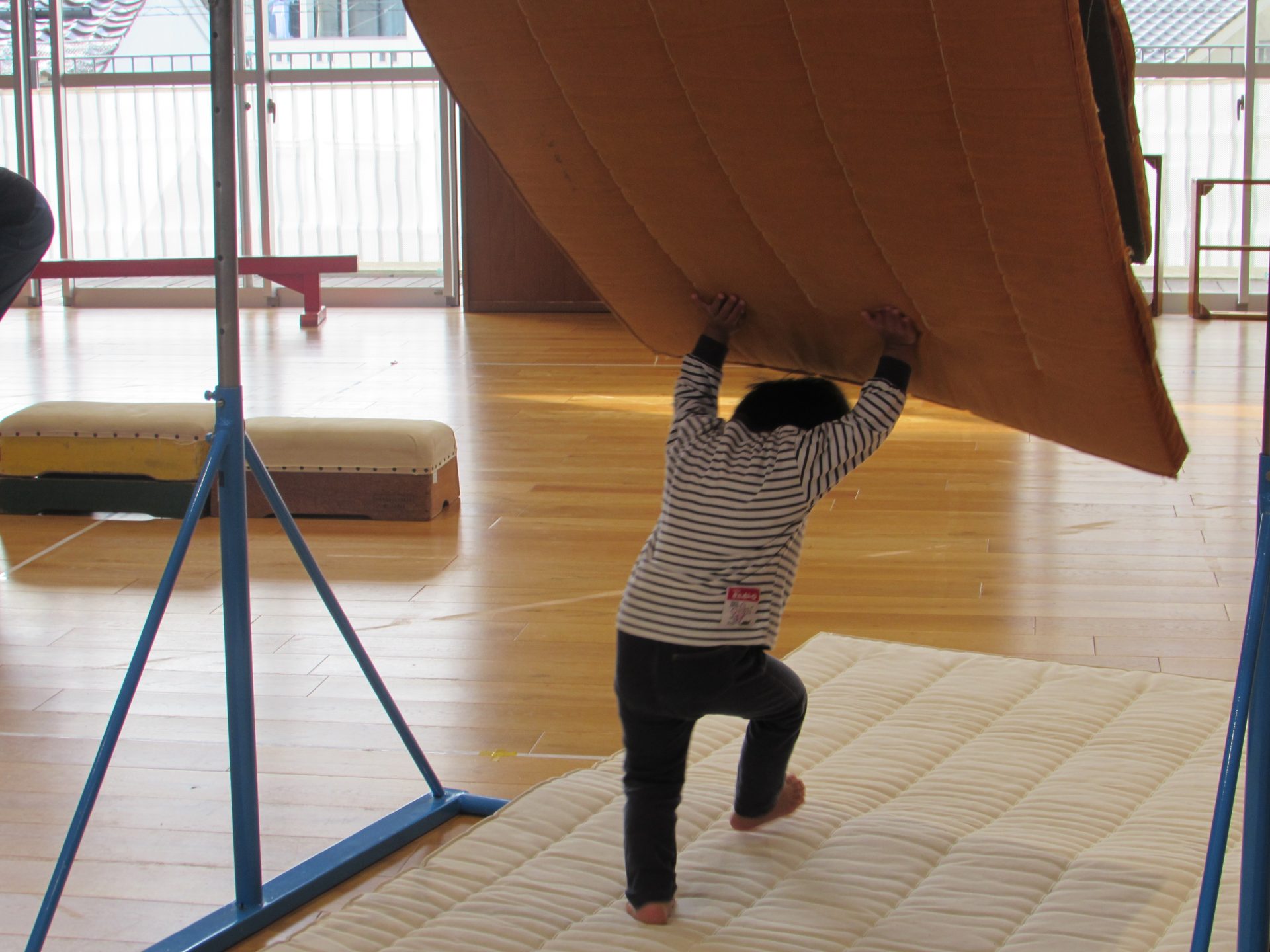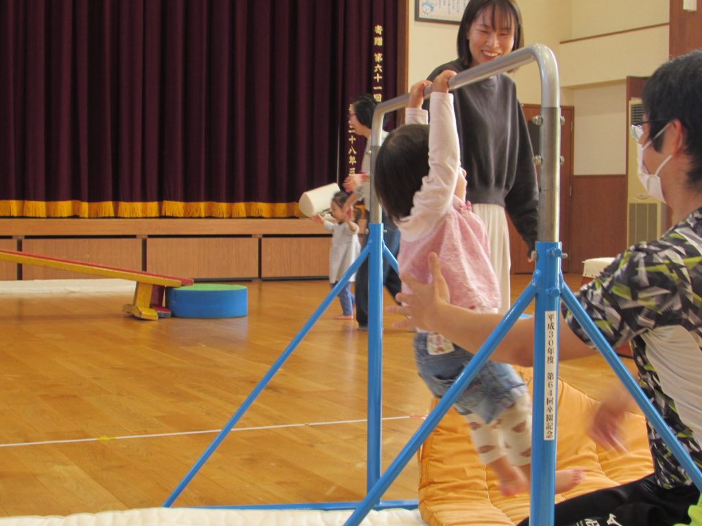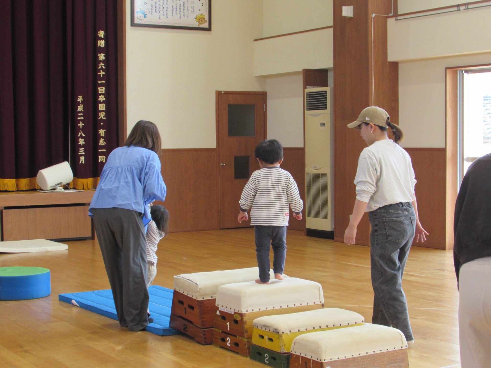 前回より少し難しいフープのトンネルに挑戦したり、鉄棒に自分の力でぶら下がったりして子ども達も楽しそうに参加していました!回数を重ね、平均台を使った一本橋やマットで作ったお山にも少しずつ慣れてきて、安心して渡ったり、登ったりする姿が見られるようになりました☆