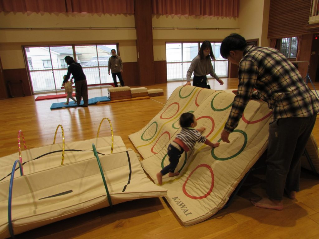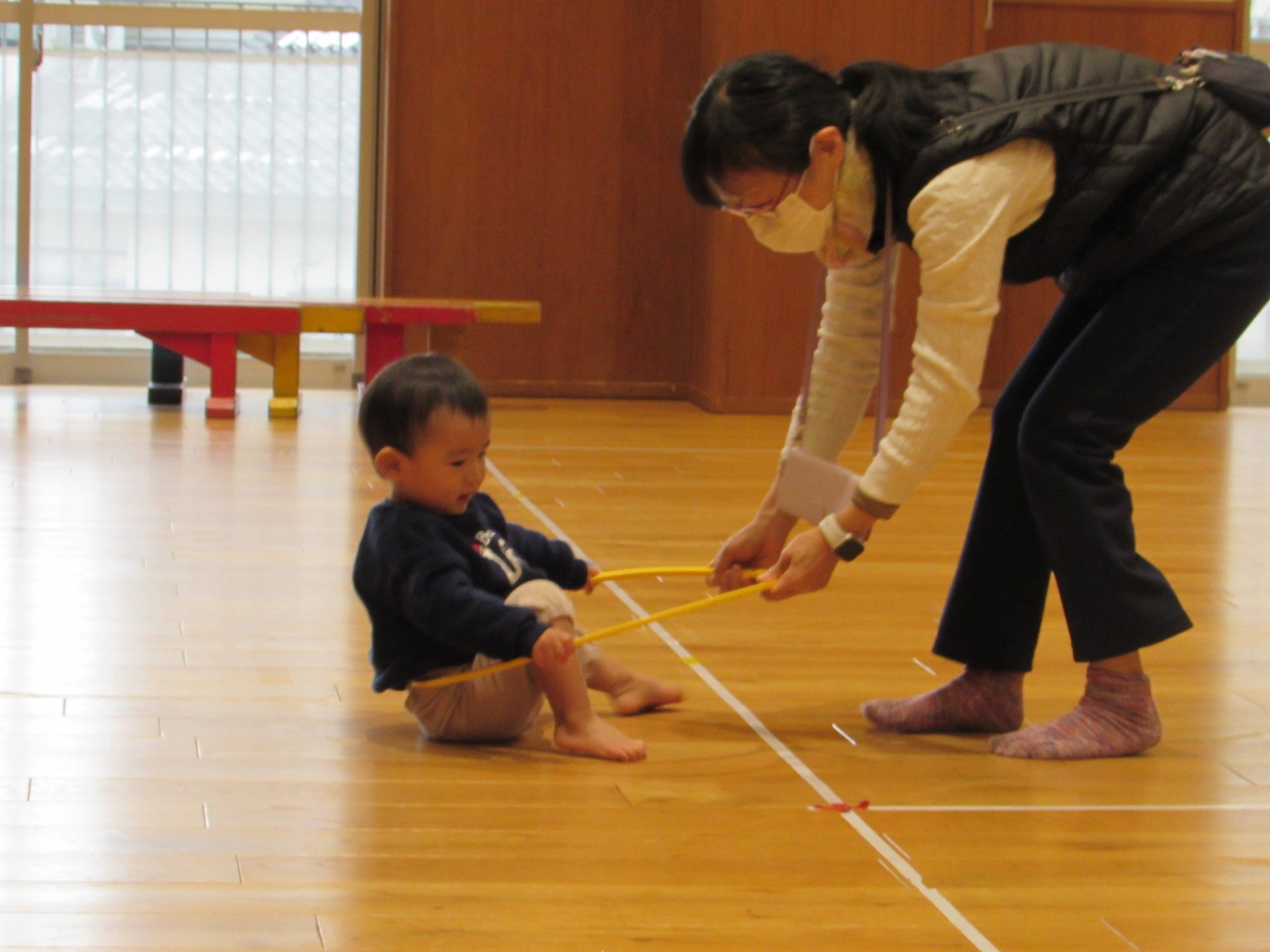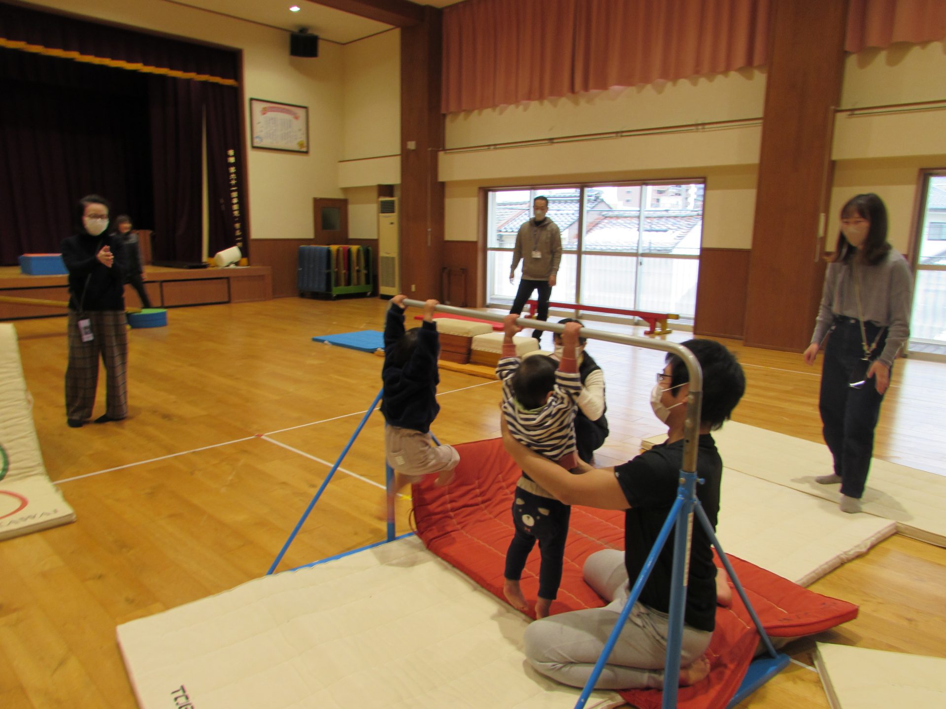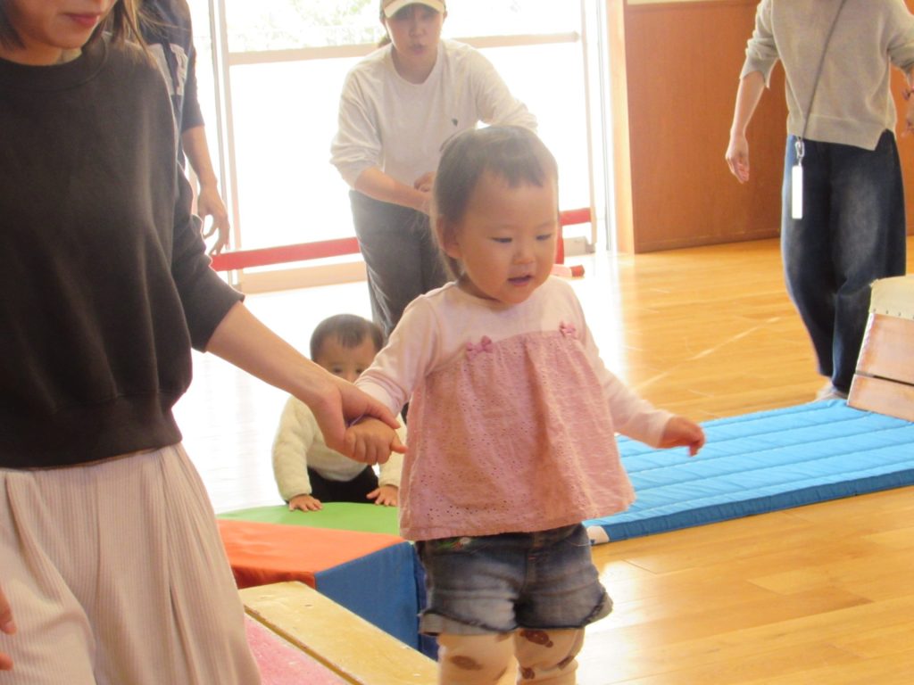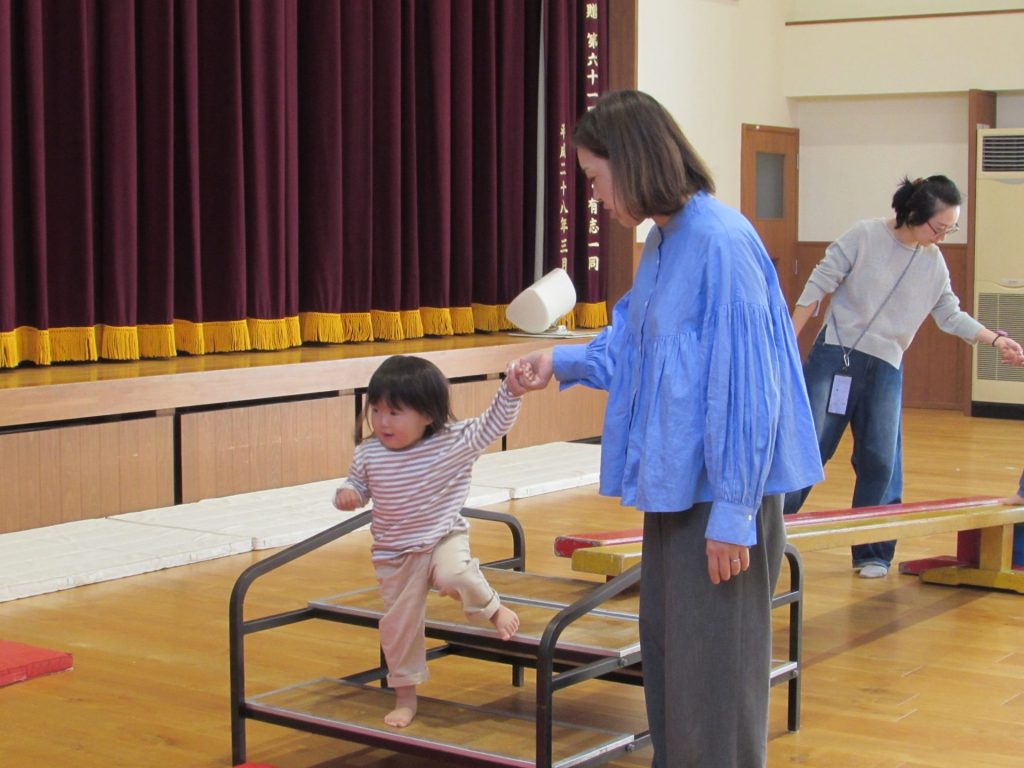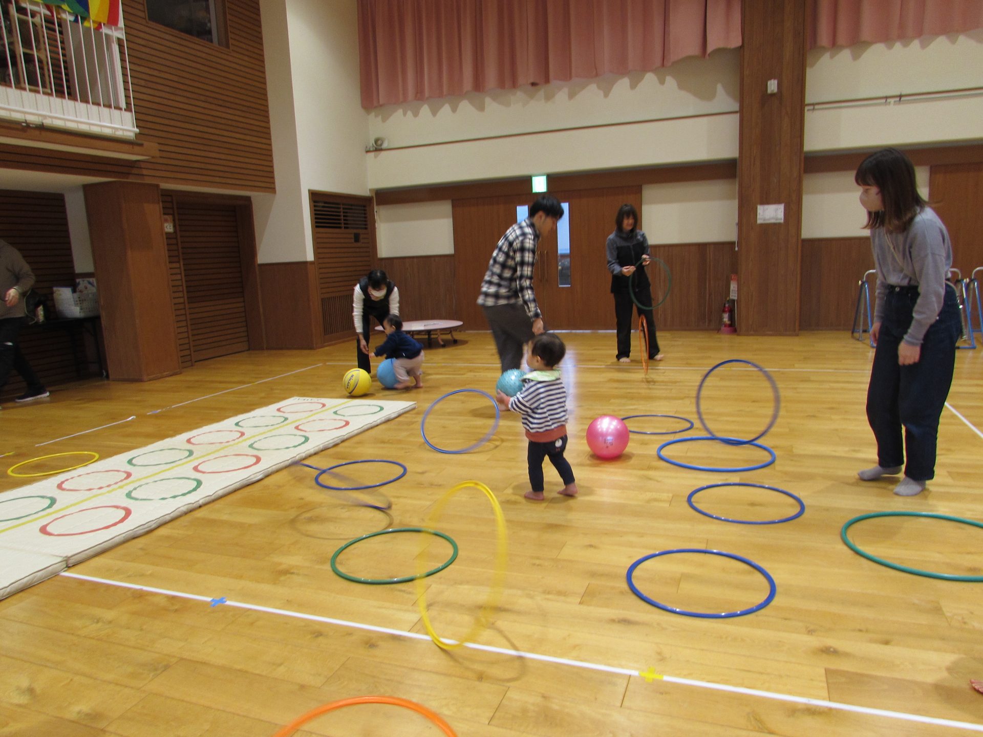 前回より少し難しいフープのトンネルに挑戦したり、鉄棒に自分の力でぶら下がったりして子ども達も楽しそうに参加していました!回数を重ね、平均台を使った一本橋やマットで作ったお山にも少しずつ慣れてきて、安心して渡ったり、登ったりする姿が見られるようになりました☆