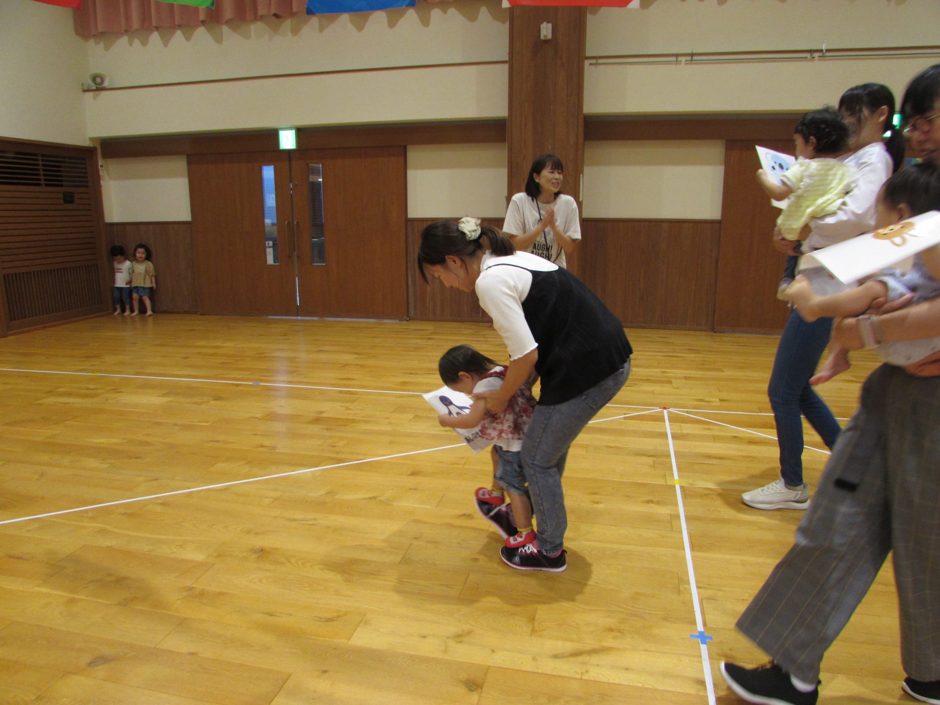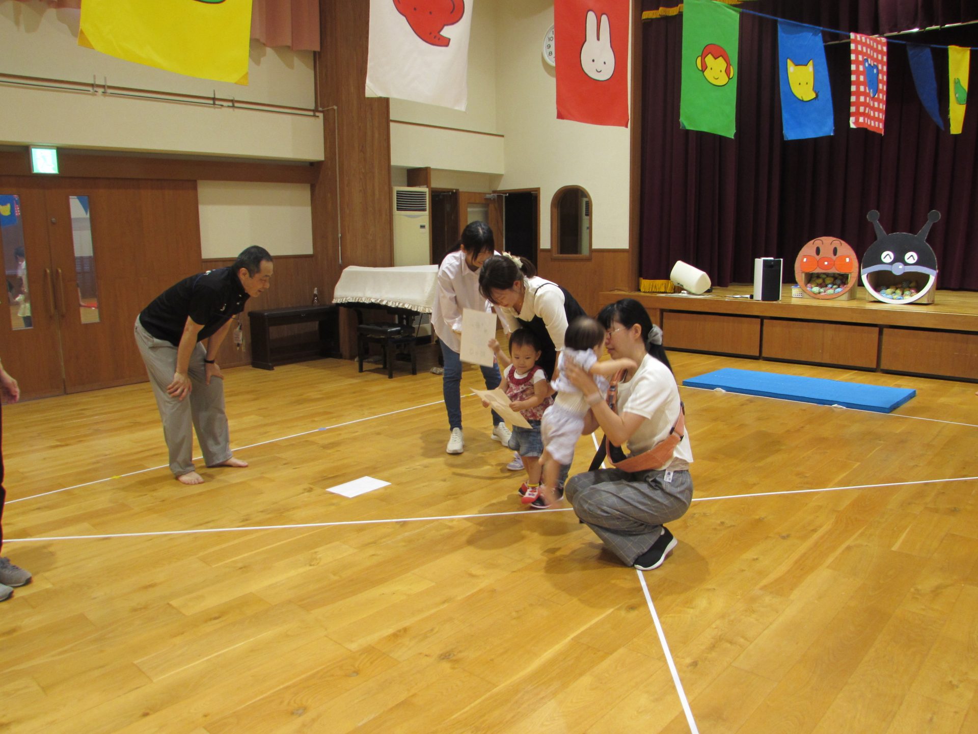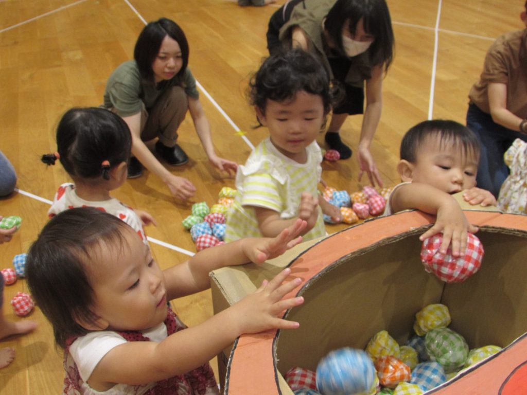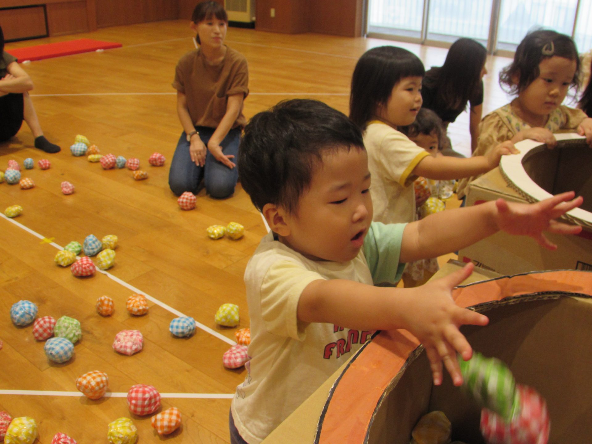 第7回の園開放は、『親子で運動会』を開催しました!!はじめに体操をしたあと、おうちの人と一緒にかけっこをしました。元気いっぱいに走る子どもたちの姿がとても印象的でした☆その他にも、玉入れやなりきりレースなど、さまざまな運動遊びに挑戦しました!最後にはおたからゲット競争を行い子どもたちのキラキラした笑顔があふれる、親子での楽しい運動会の時間となりました。