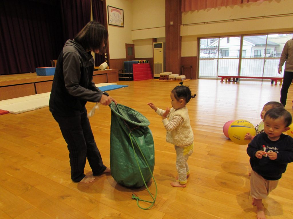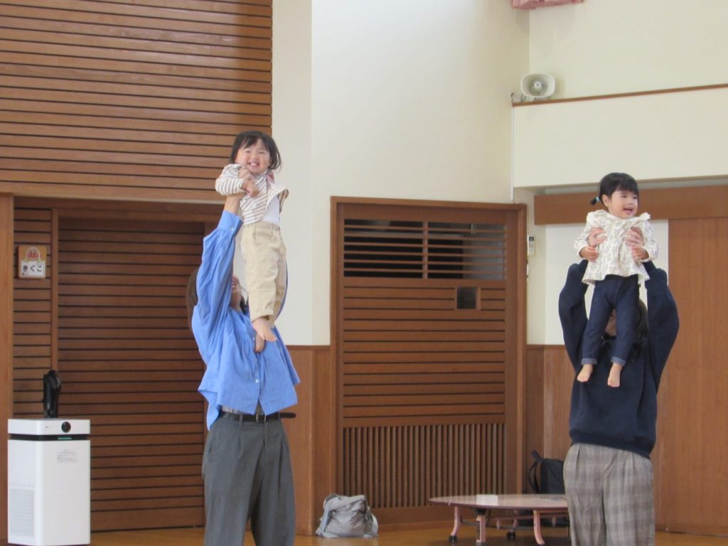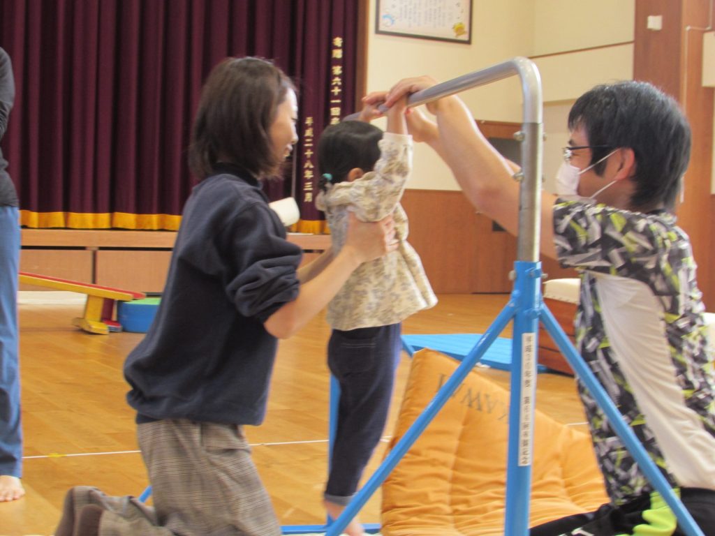 第10回の園開放は、在園している子どもたちもお世話になっている、体育教室の山本先生に来ていただき「親子で体育教室」を行いました。親子で簡単な体操をしてから、かけっこをしました!そのあと、いろいろな器具が出てきて、みんなが初めて見るものばかりで、目がキラキラ輝いていました☆山登りをしたり鉄棒にぶら下がったり…みんな元気でとても上手でした(^^♪
