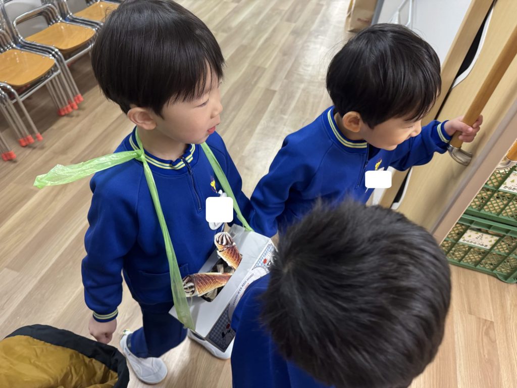 自由時間に「アイス屋さん」セットを作ったお友達を発見!!作ったアイスを持って、大好きなゆり組のお友達のところや先生たちにアイスを売りに行きました☆買ってもらえてとってもうれしそうでした!