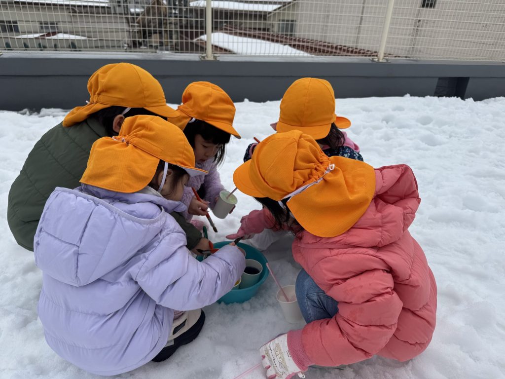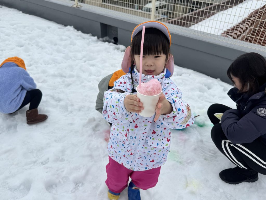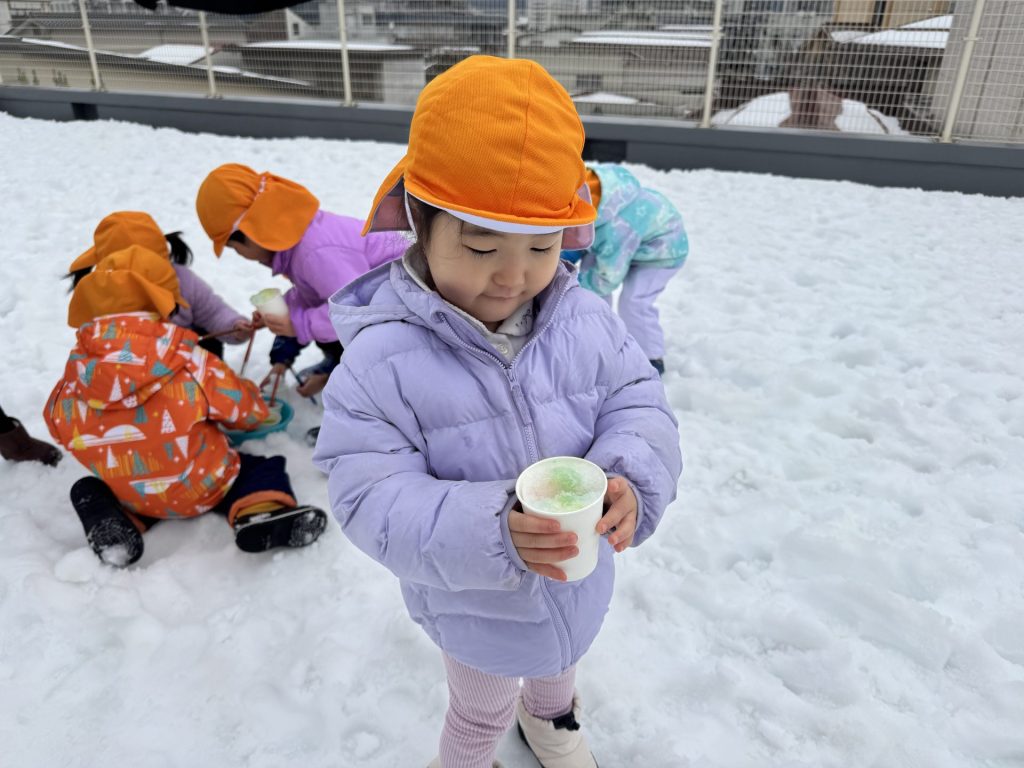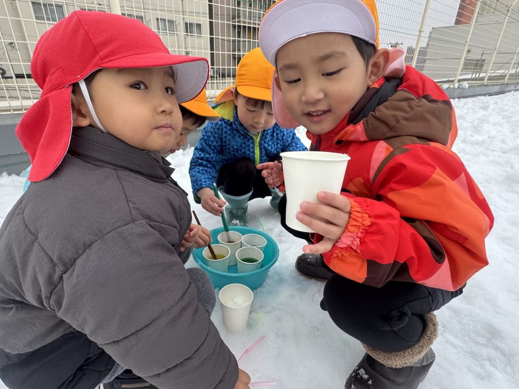 昨日は雨が降りましたが、幼稚園の屋上にはまだ雪がいっぱい残っています!少しずつ溶けかかった雪がしゃりしゃりとかき氷のような氷に変身しており、今日はみんなで色水を使ってかき氷屋さんごっこをして遊びました☆