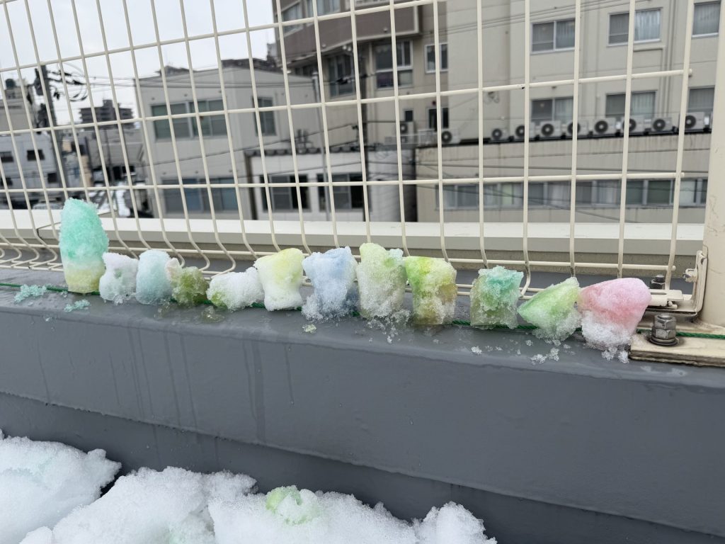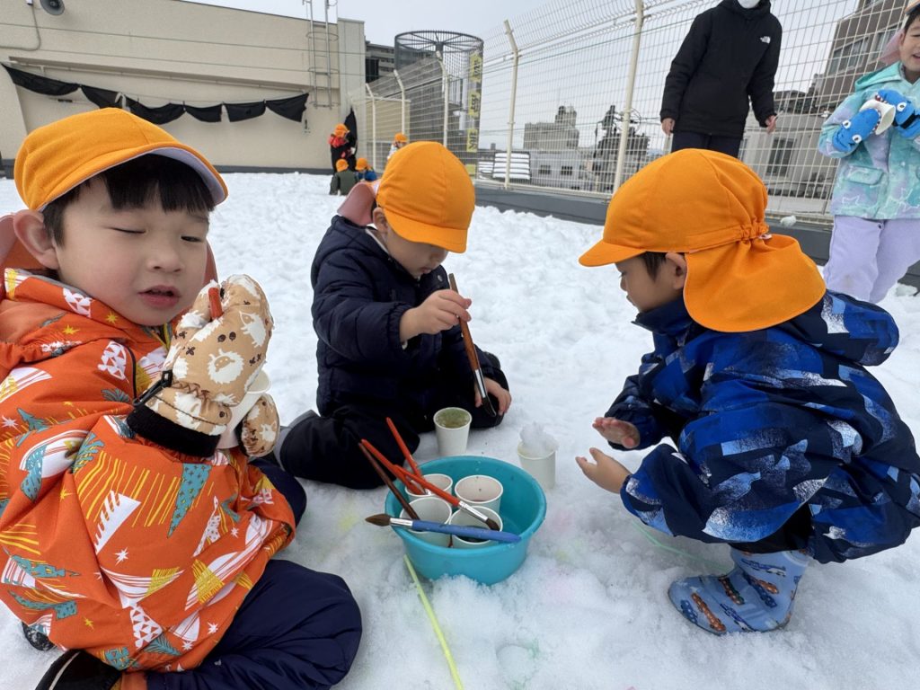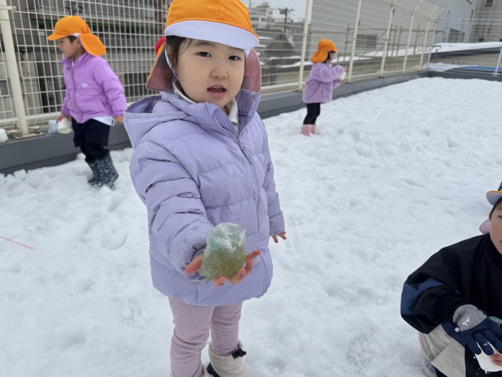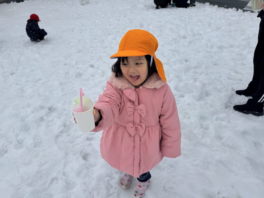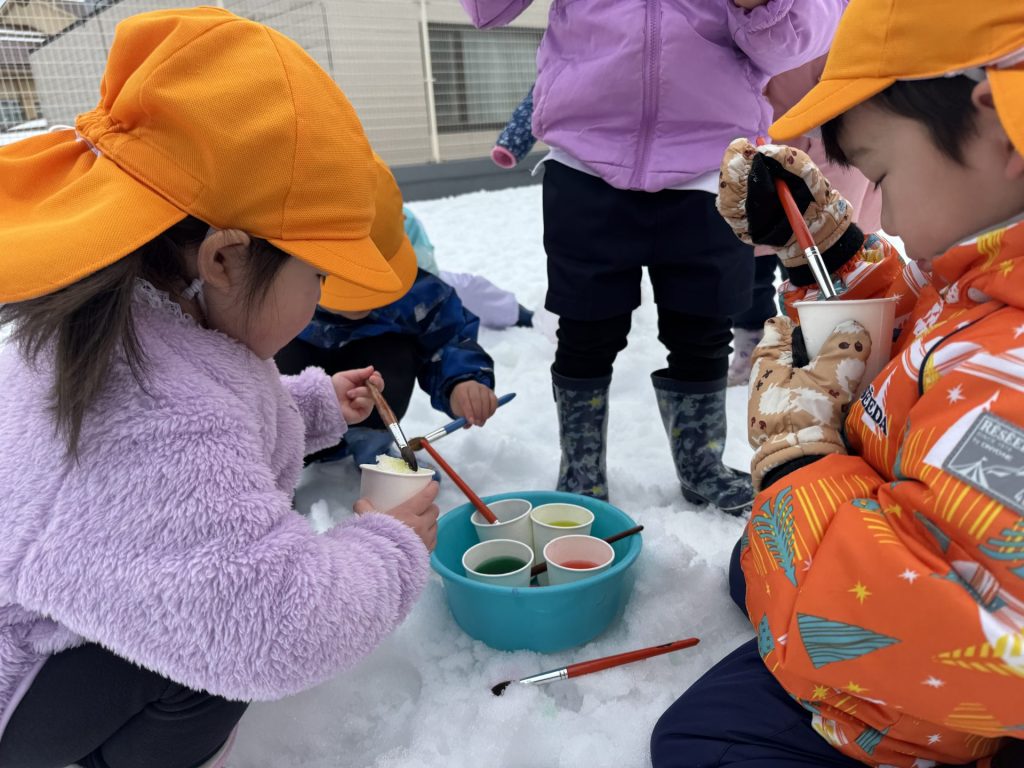 昨日は雨が降りましたが、幼稚園の屋上にはまだ雪がいっぱい残っています!少しずつ溶けかかった雪がしゃりしゃりとかき氷のような氷に変身しており、今日はみんなで色水を使ってかき氷屋さんごっこをして遊びました☆