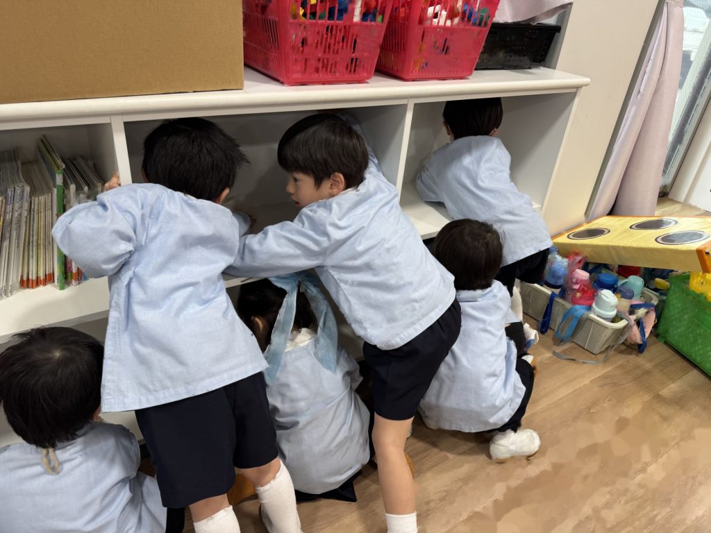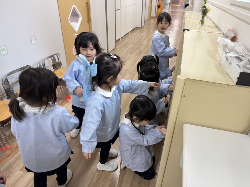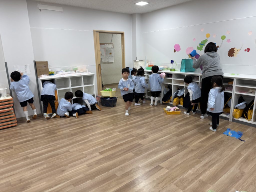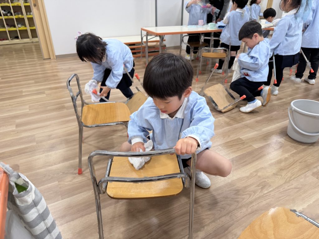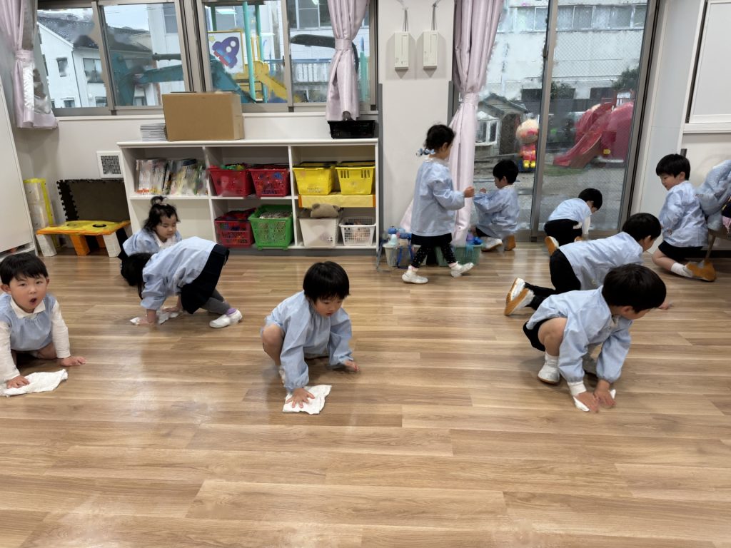 ☆来年度、次のりんご組のお友達がお部屋を使うことができるようにみんなでピカピカ大掃除をしました!いろいろなところに貼っていたマークを外したり、棚や椅子の拭き掃除、最後は床までピカピカに磨きました!