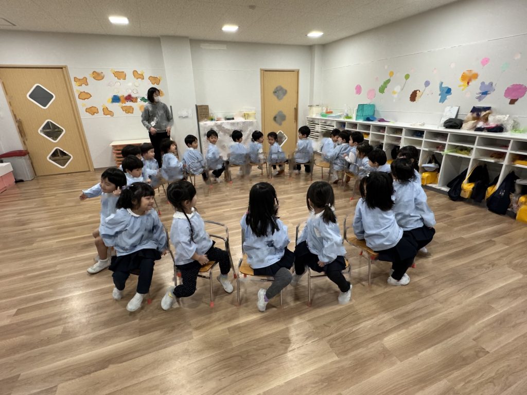 いよいよ年少組最終日を迎えました。いつものように元気に挨拶をして登園され、たくさん遊んで、笑って、食べて、賑やかく過ごした最終日でした(^^♪今日1日の様子を少しご紹介します☆まずはいつものように朝の会スタート!最後のお当番は・・・ひこうきグループさんでした!