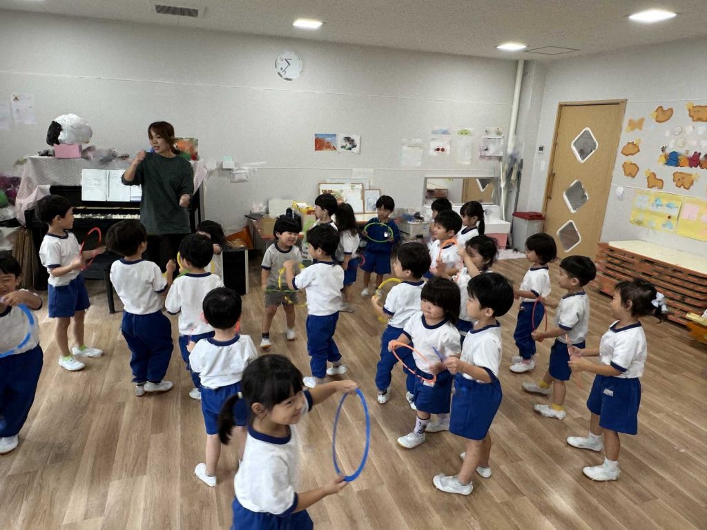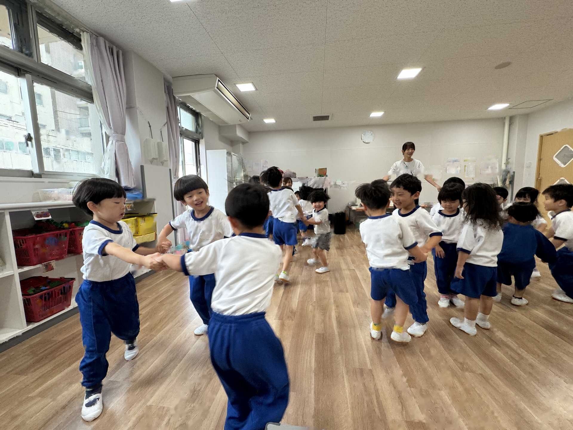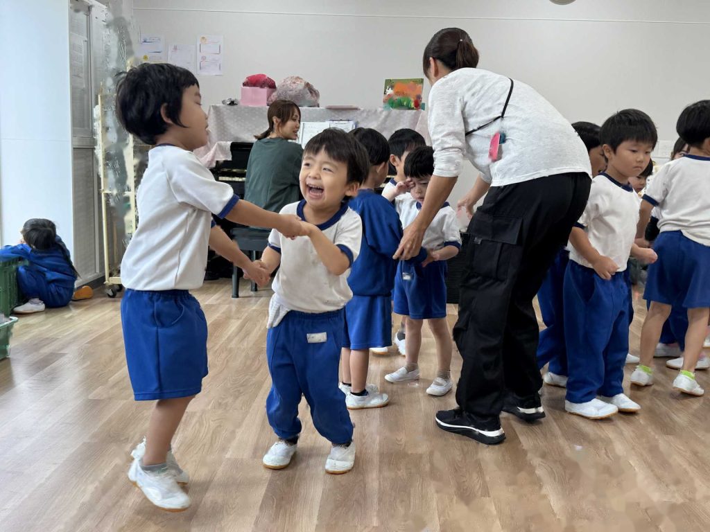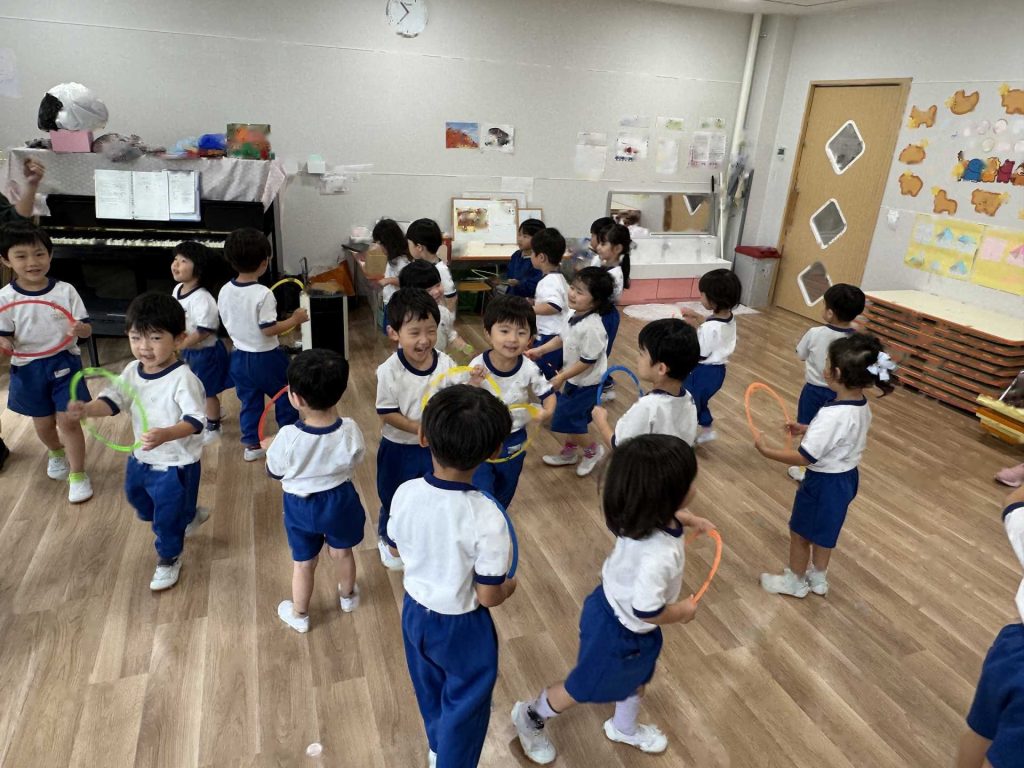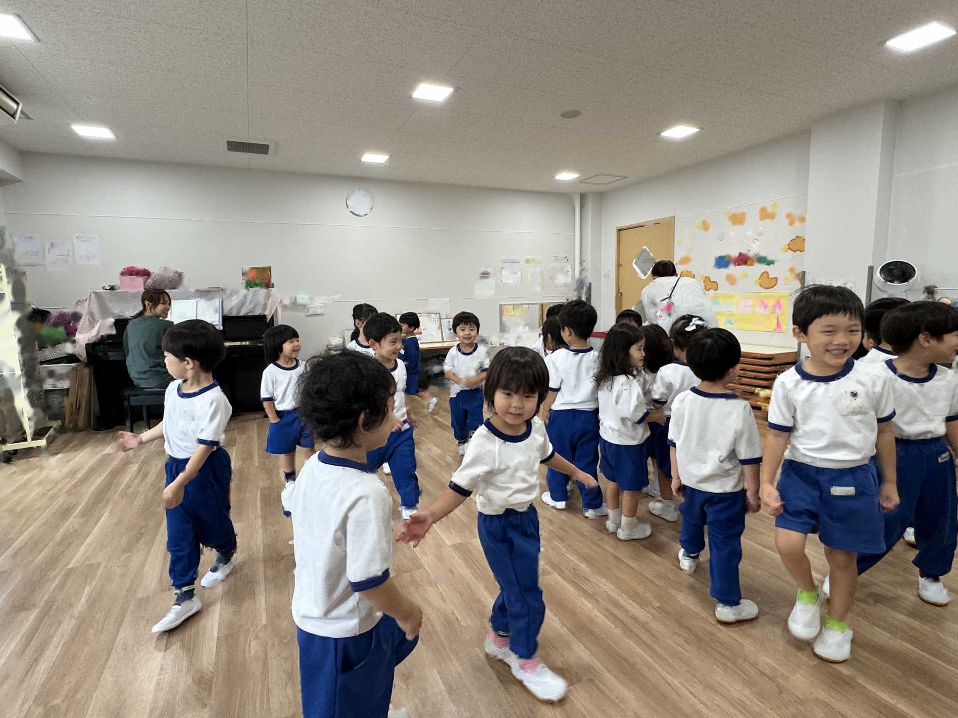 最後はバスごっこの曲に合わせてハンドルを持って運転して幼稚園に帰ります!活動の最初から最後までニコニコで楽しんで参加していたたんぽぽ組の子ども達でした♪