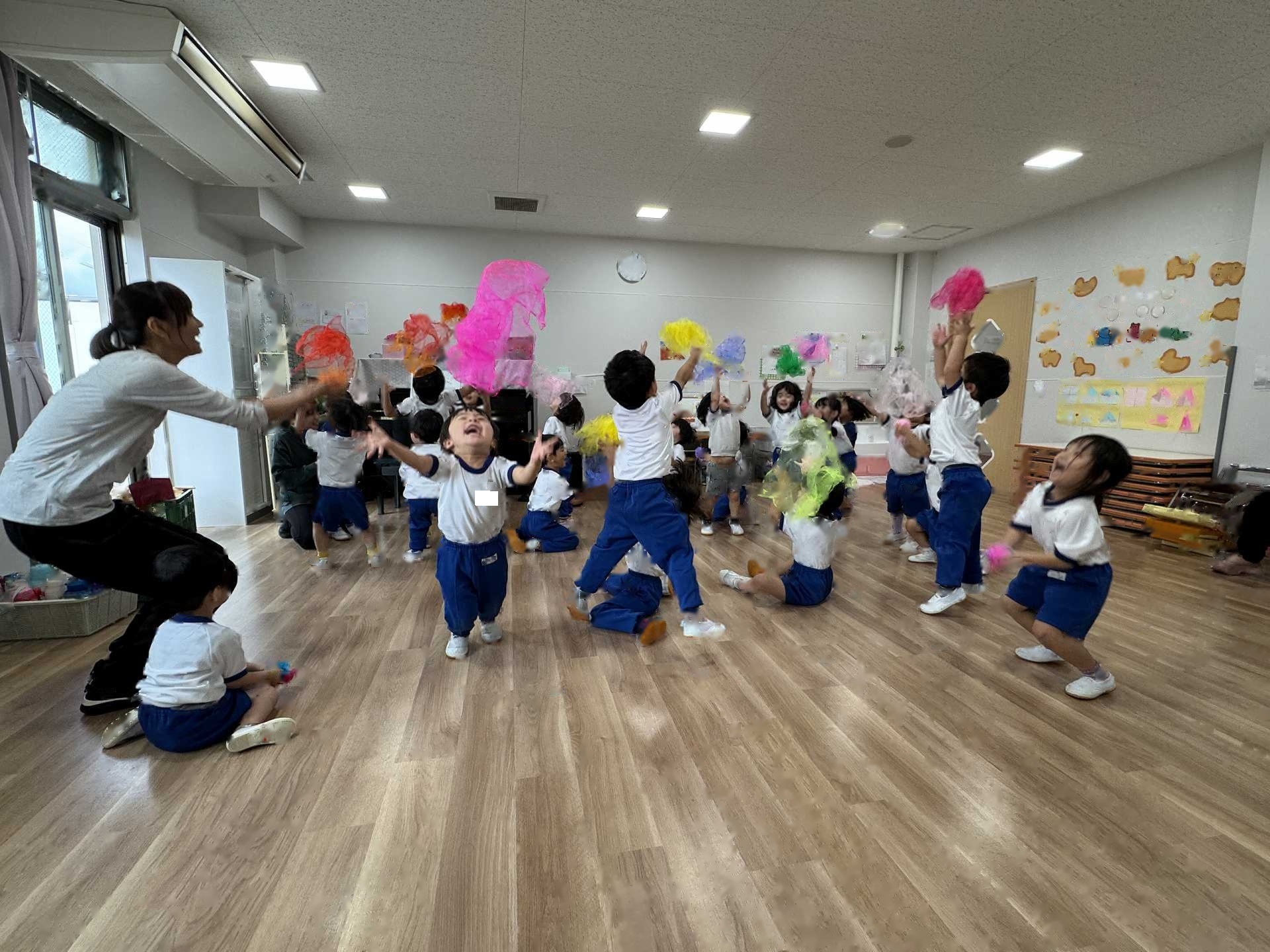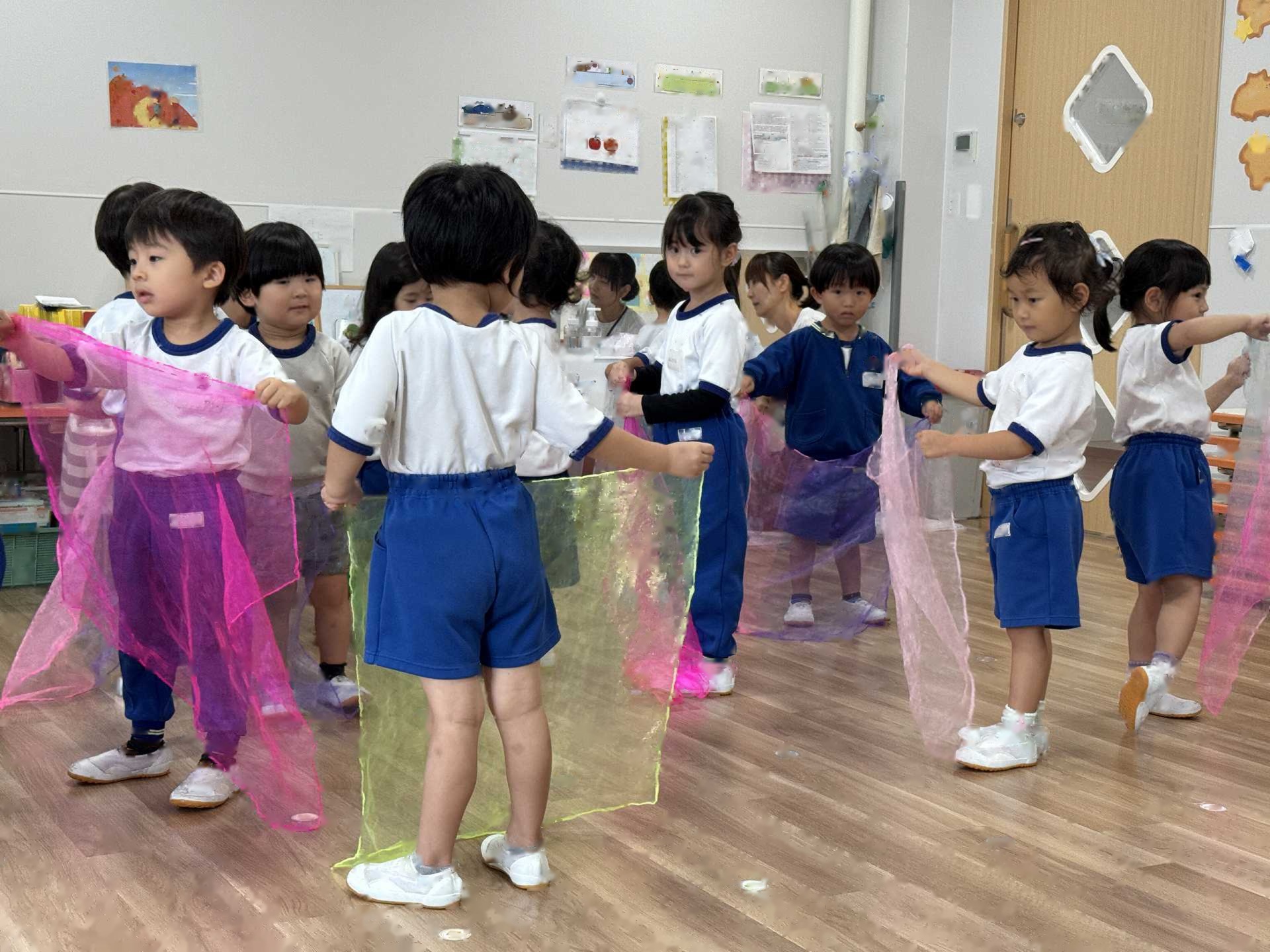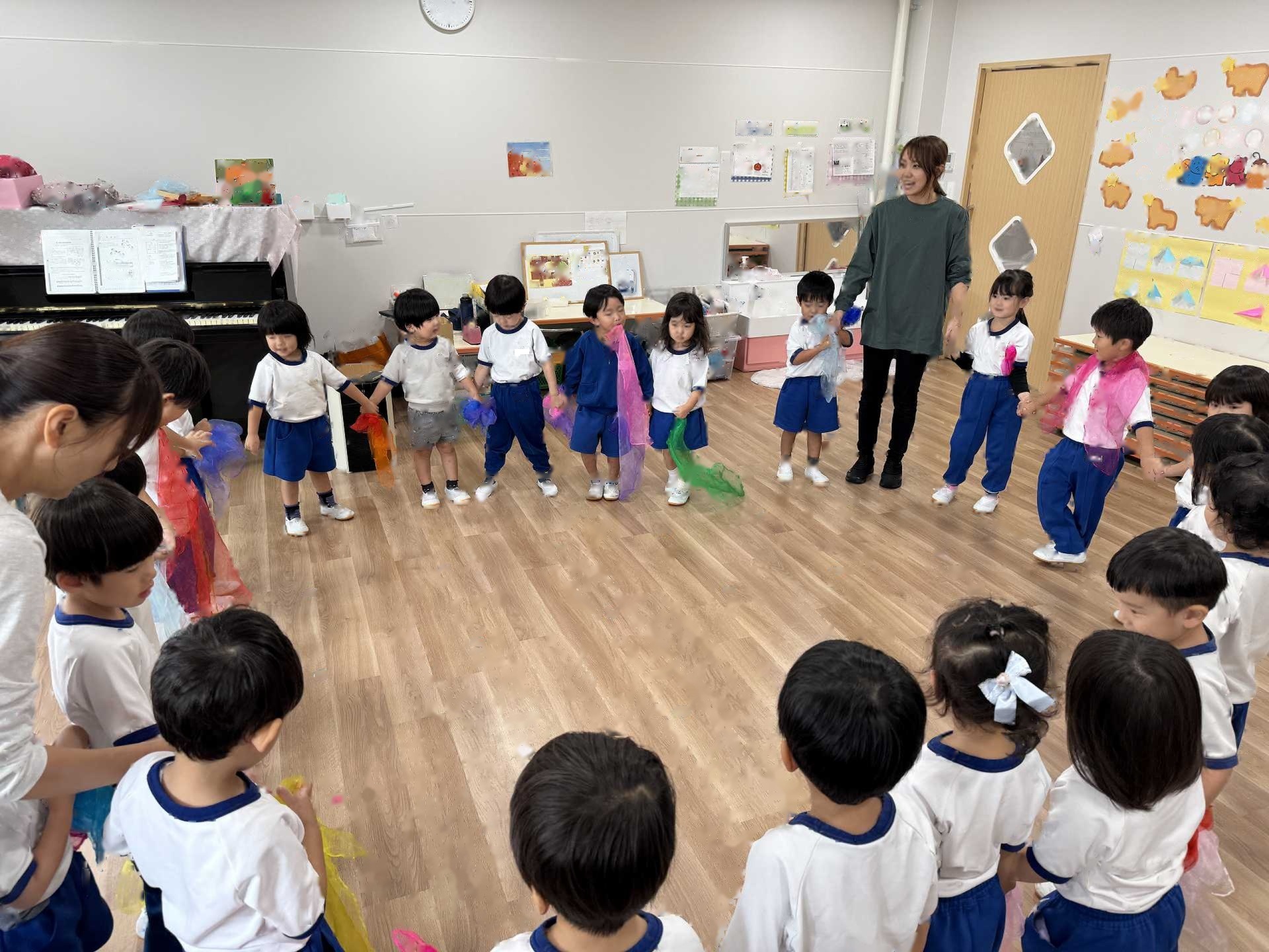リトミックスカーフを使ってゆらゆらと落ちてくる葉っぱを表現しました。