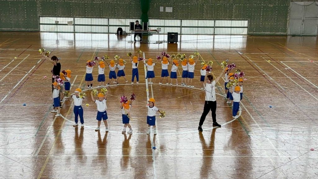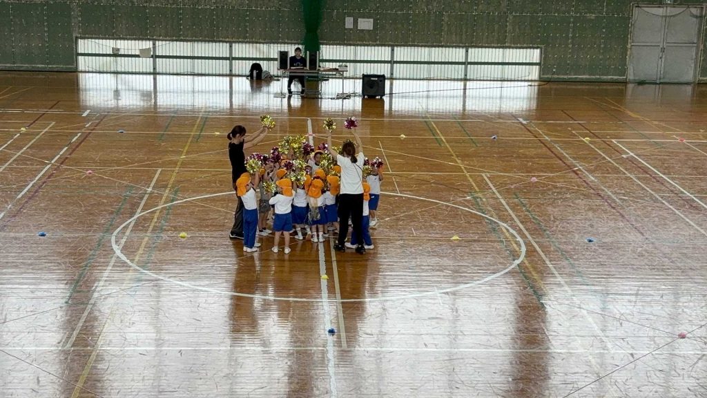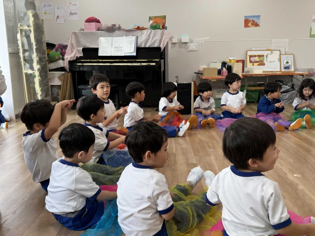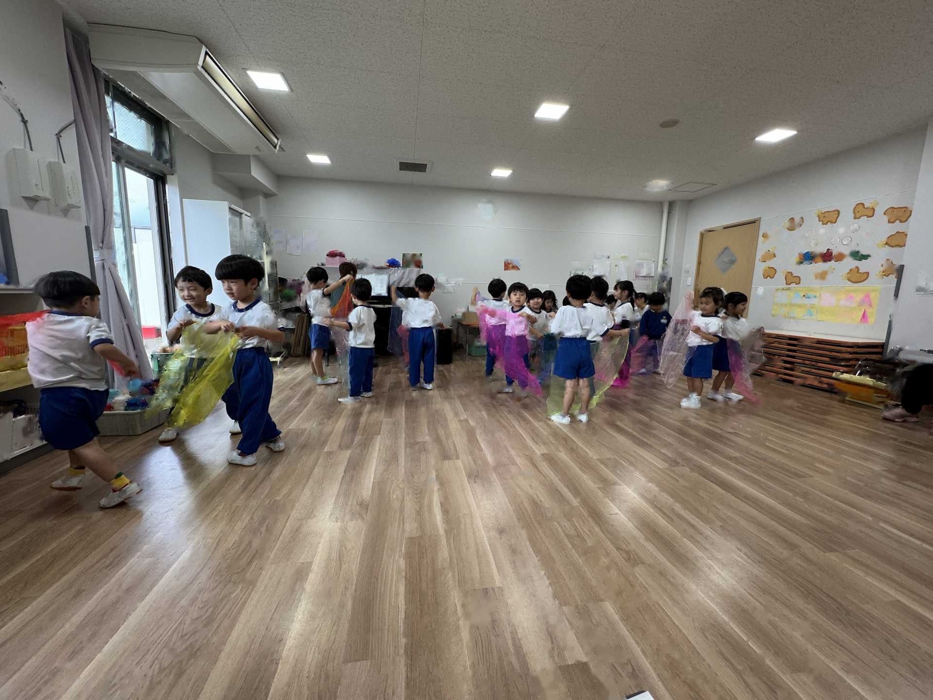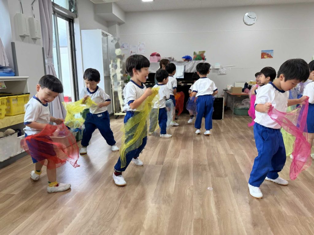 リトミックスカーフを使ってゆらゆらと落ちてくる葉っぱを表現しました。
