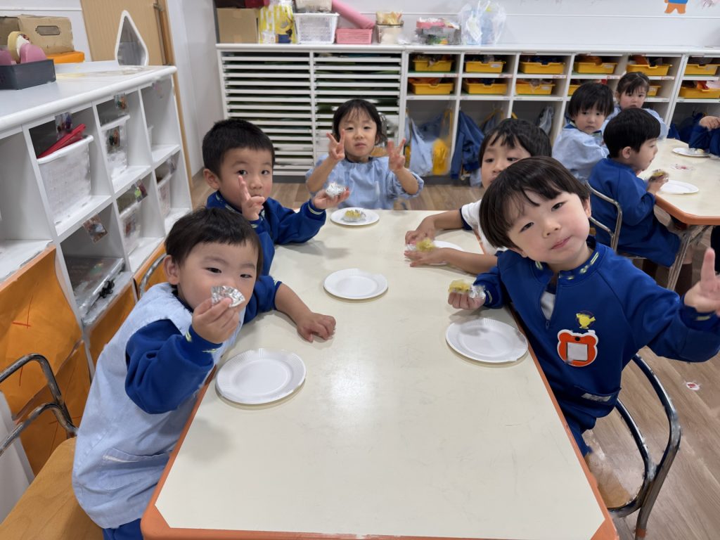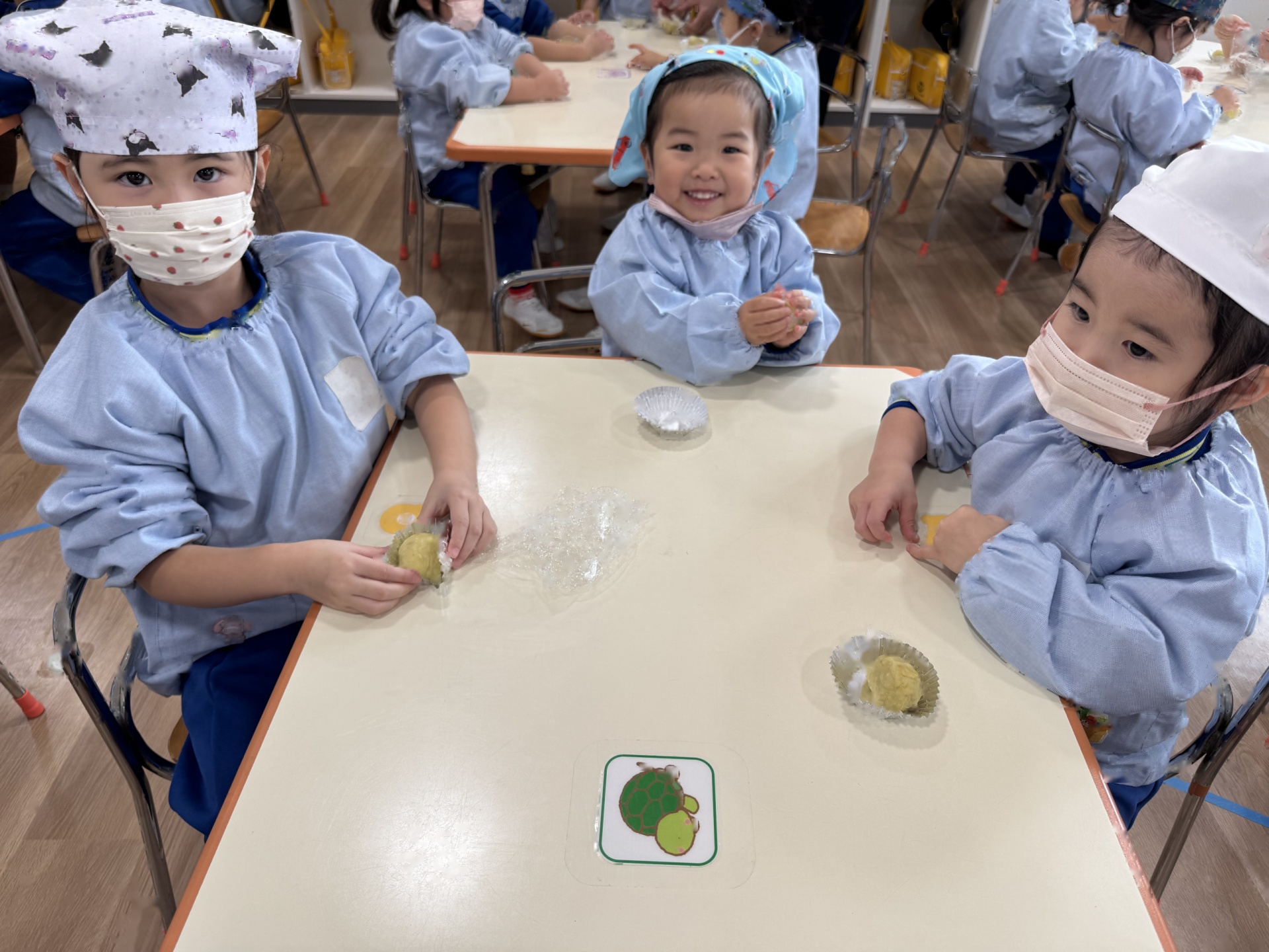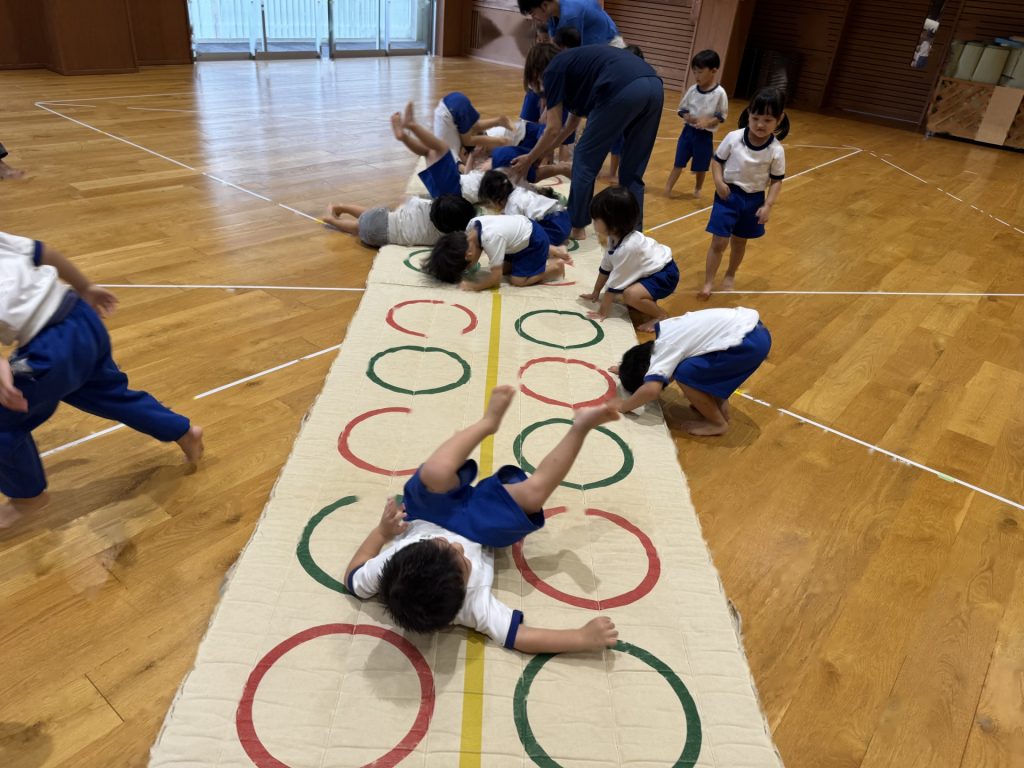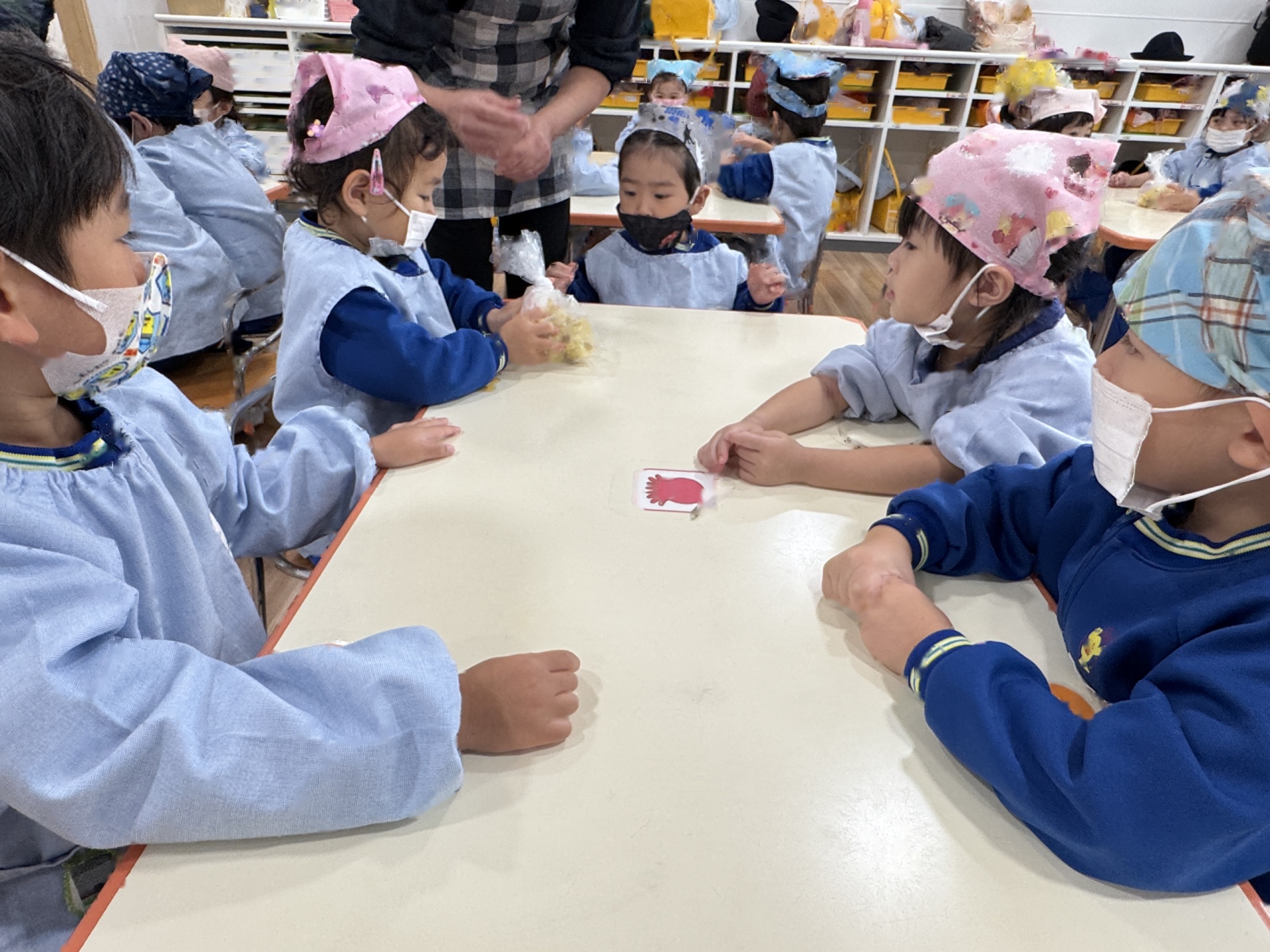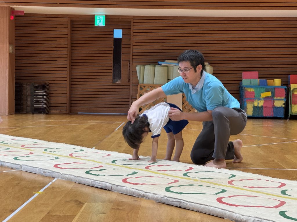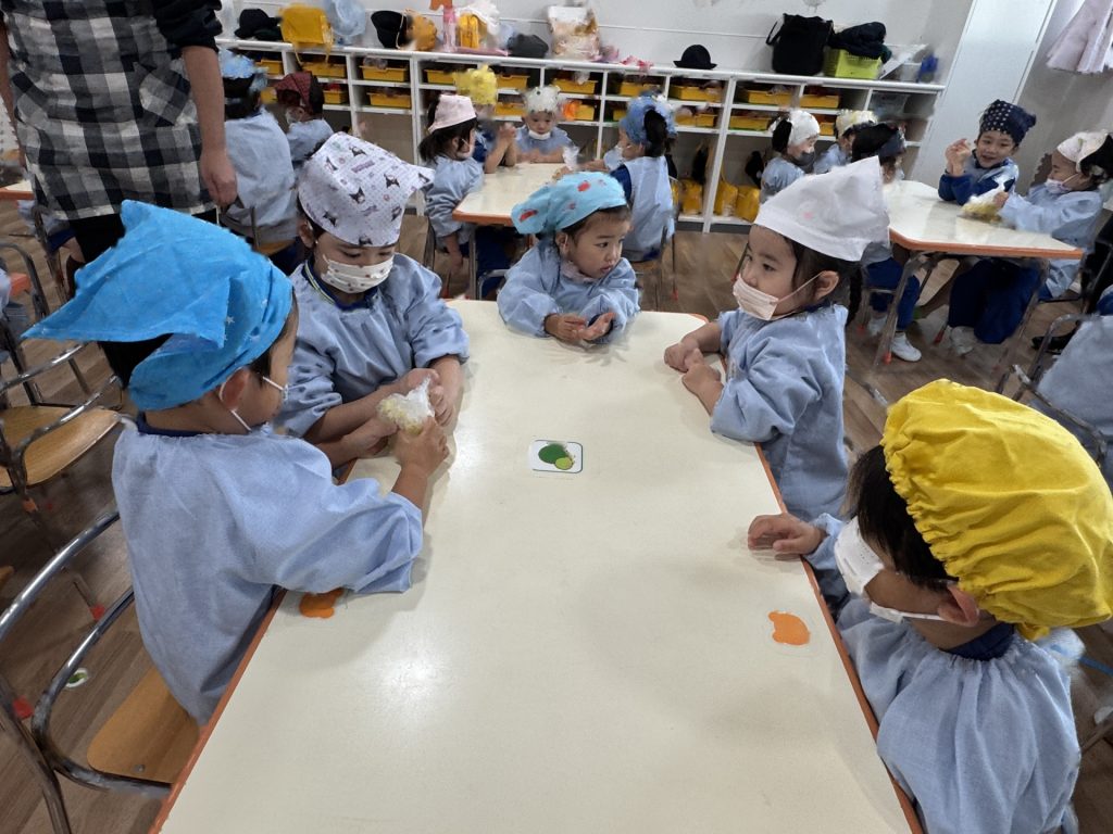 山に着いたらご飯タイム♪スカーフを丸めておにぎりを作りました。ピアノの音に合わせてにぎゅっぎゅっぎゅっと握って、最後はみんなで大きなおにぎりして完成!おにぎりの中には鮭や梅ぼしなどをリズム打ちしながら入れて・・・「パク・パク・パク・パク・はい・どーぞ」の4拍子のリズムに合わせて順番におにぎりを食べてお隣のお友達に渡しました。