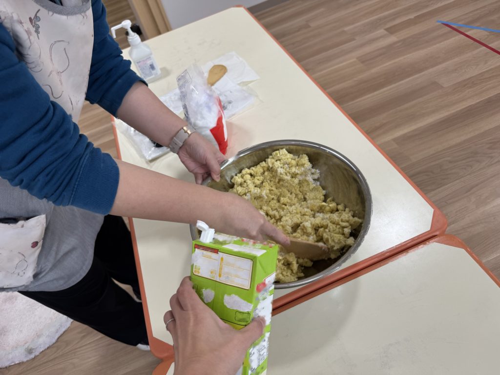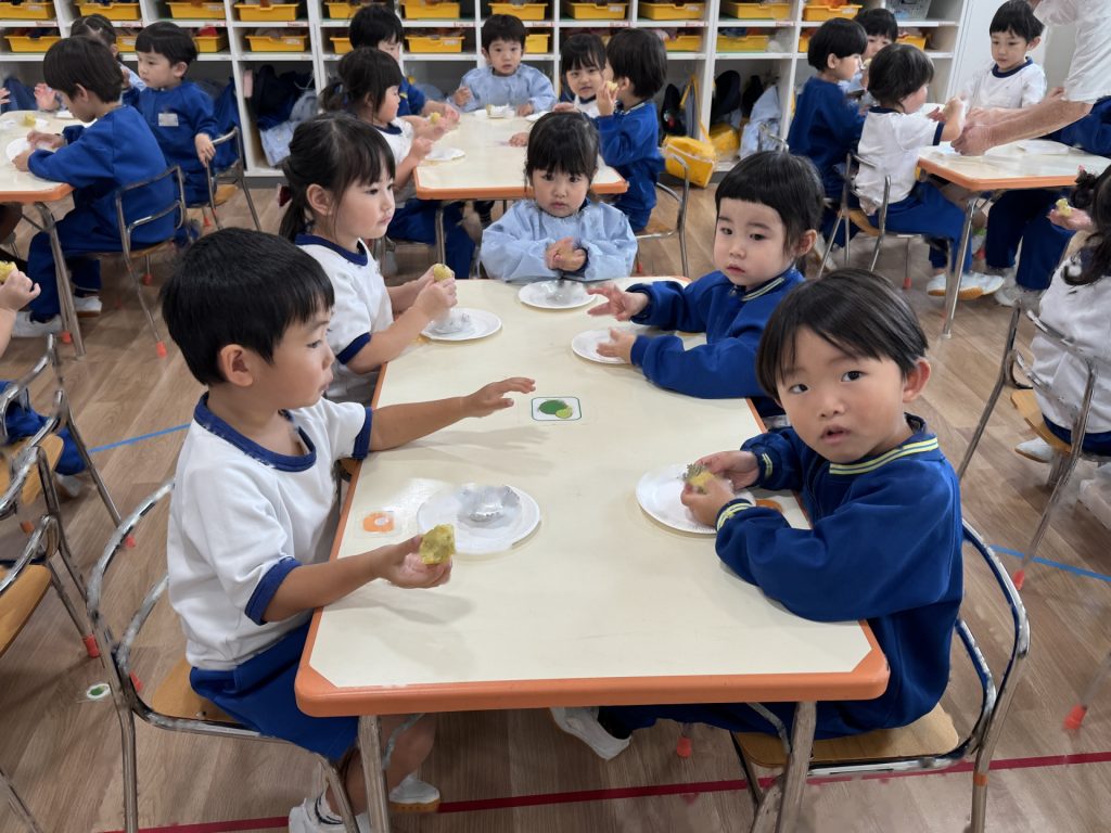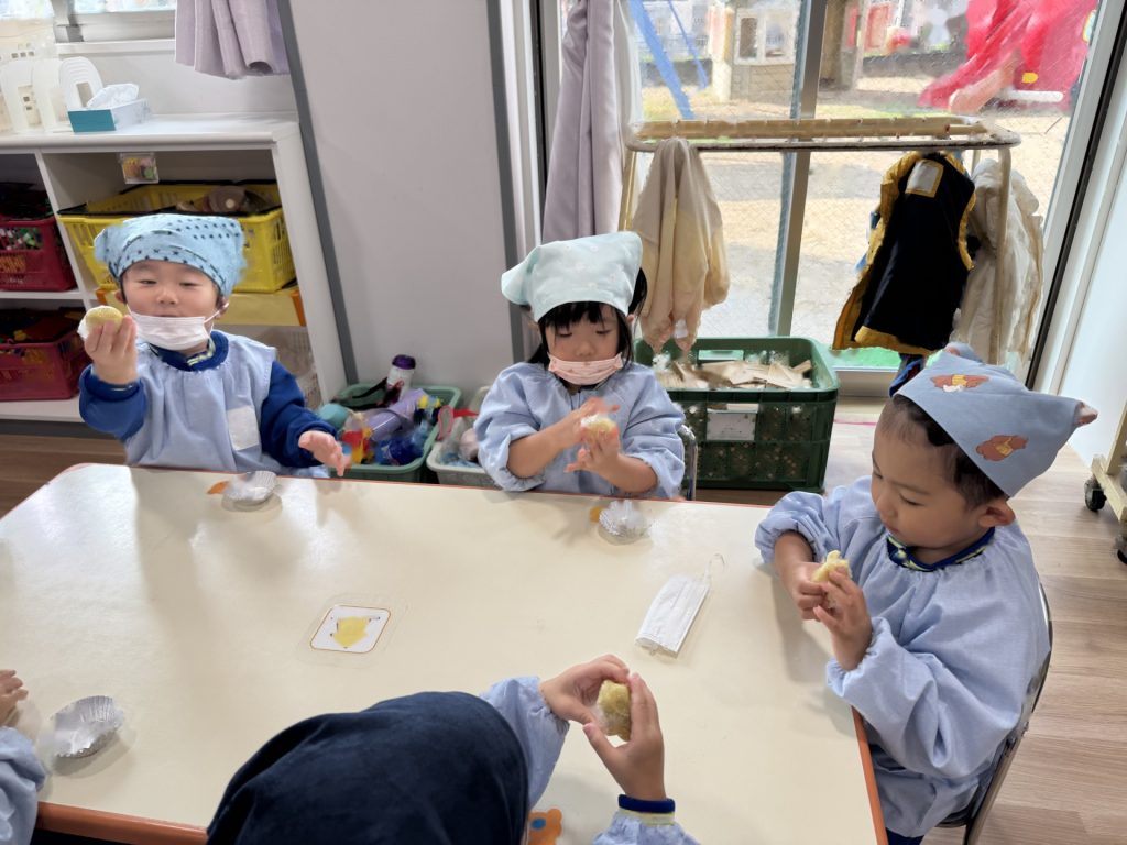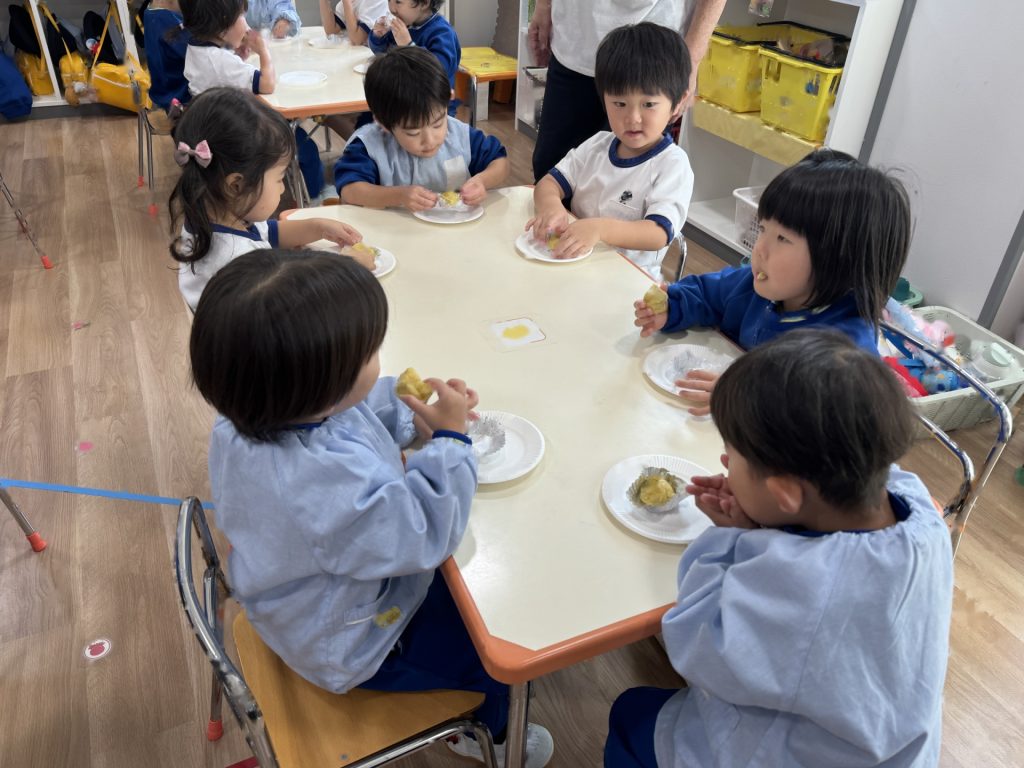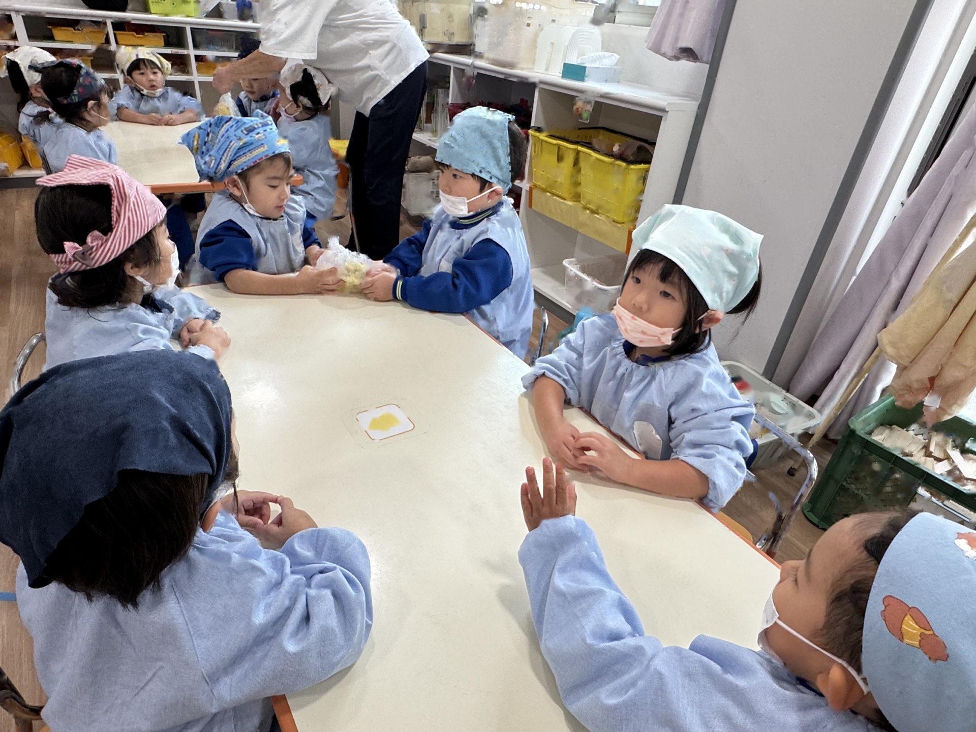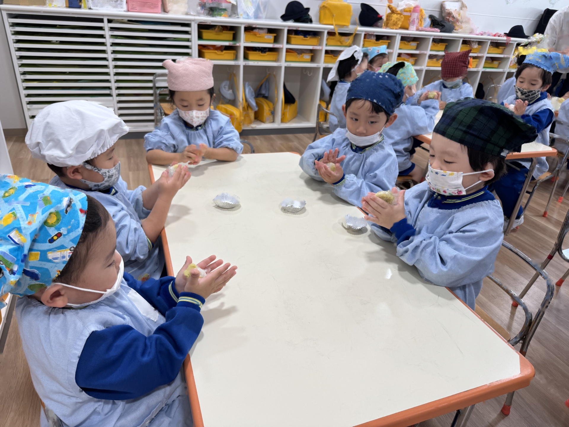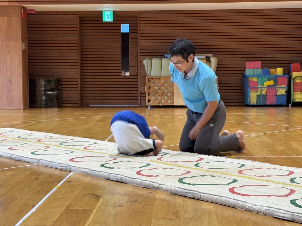 山に着いたらご飯タイム♪スカーフを丸めておにぎりを作りました。ピアノの音に合わせてにぎゅっぎゅっぎゅっと握って、最後はみんなで大きなおにぎりして完成!おにぎりの中には鮭や梅ぼしなどをリズム打ちしながら入れて・・・「パク・パク・パク・パク・はい・どーぞ」の4拍子のリズムに合わせて順番におにぎりを食べてお隣のお友達に渡しました。