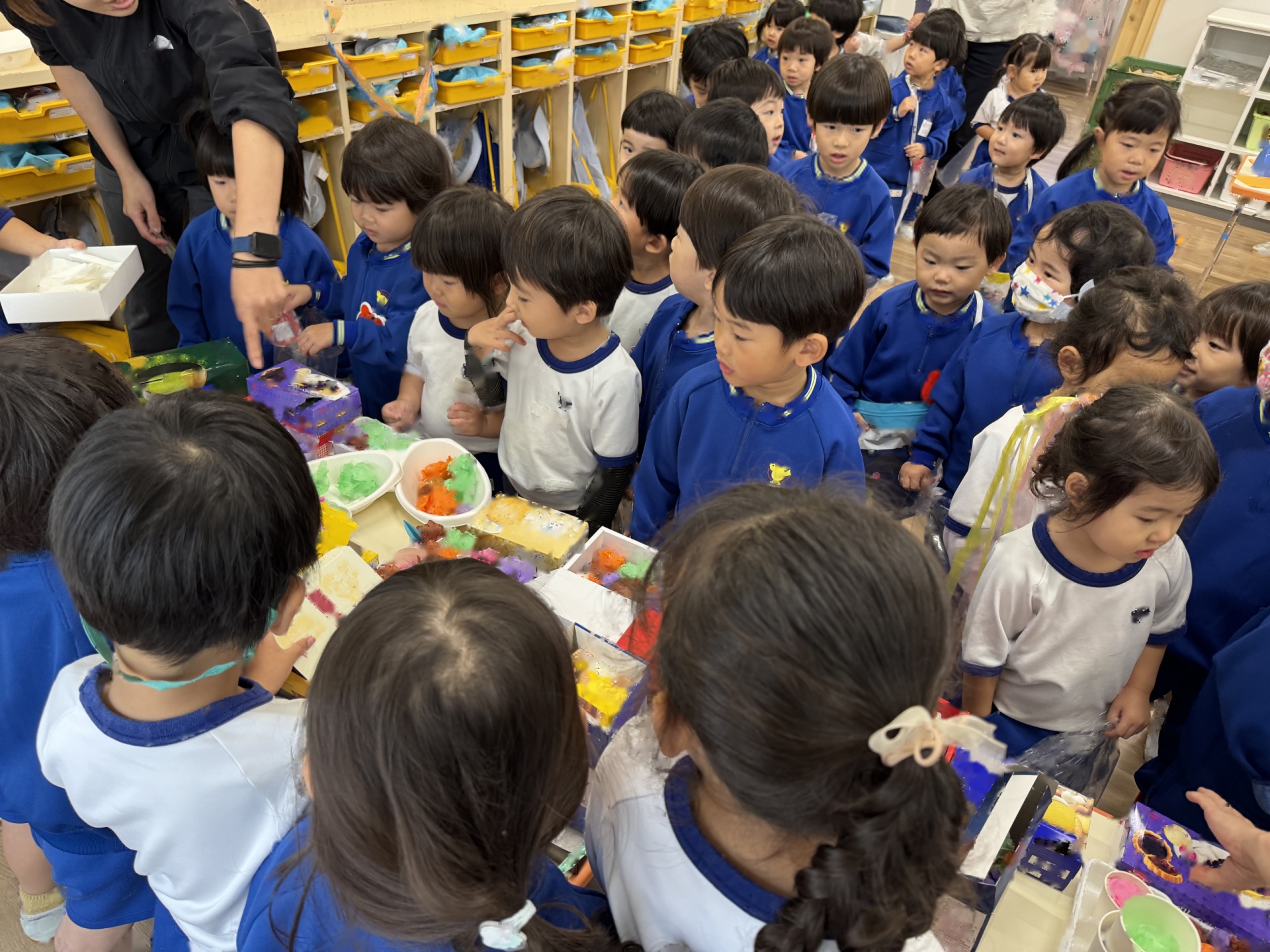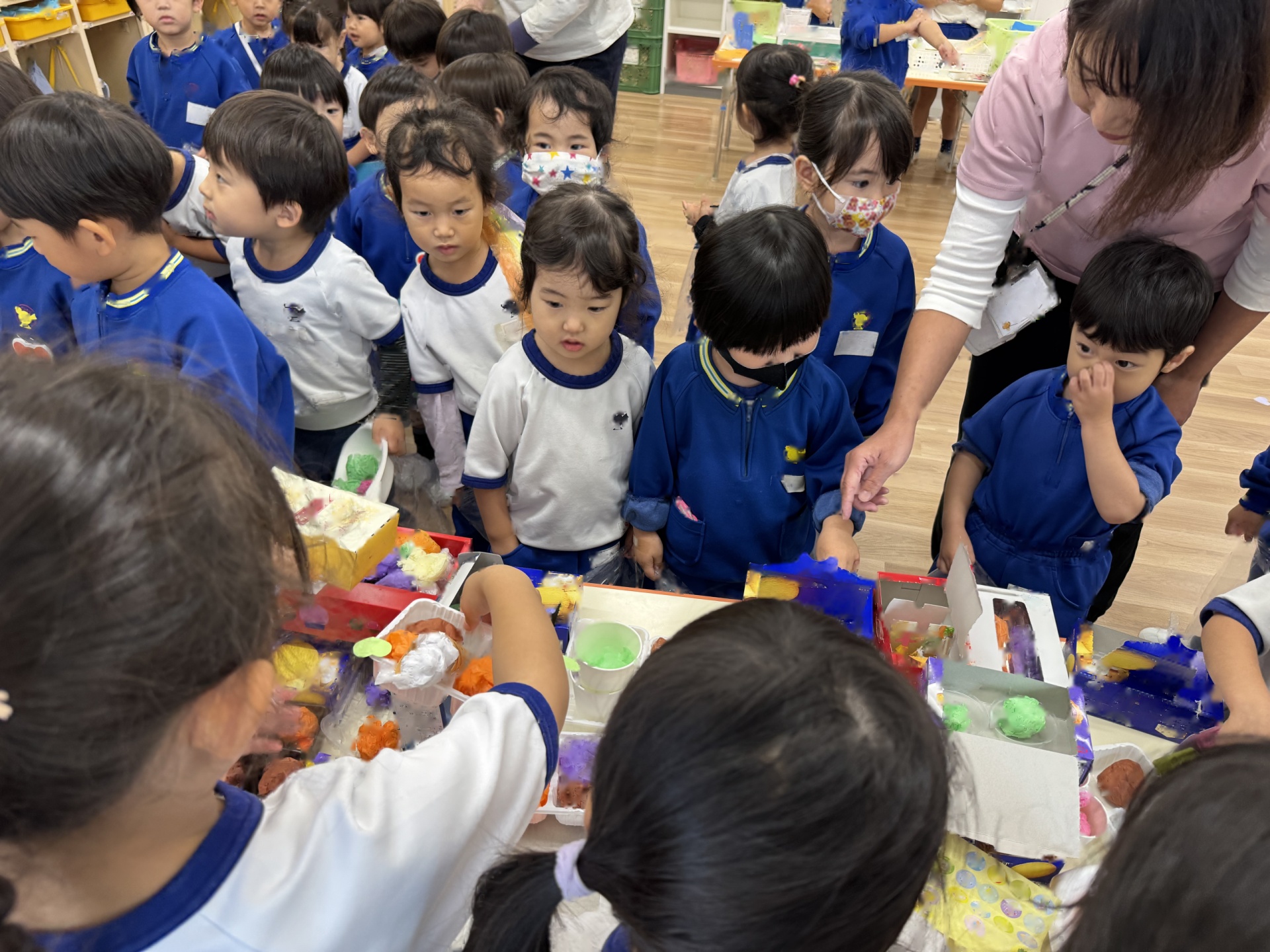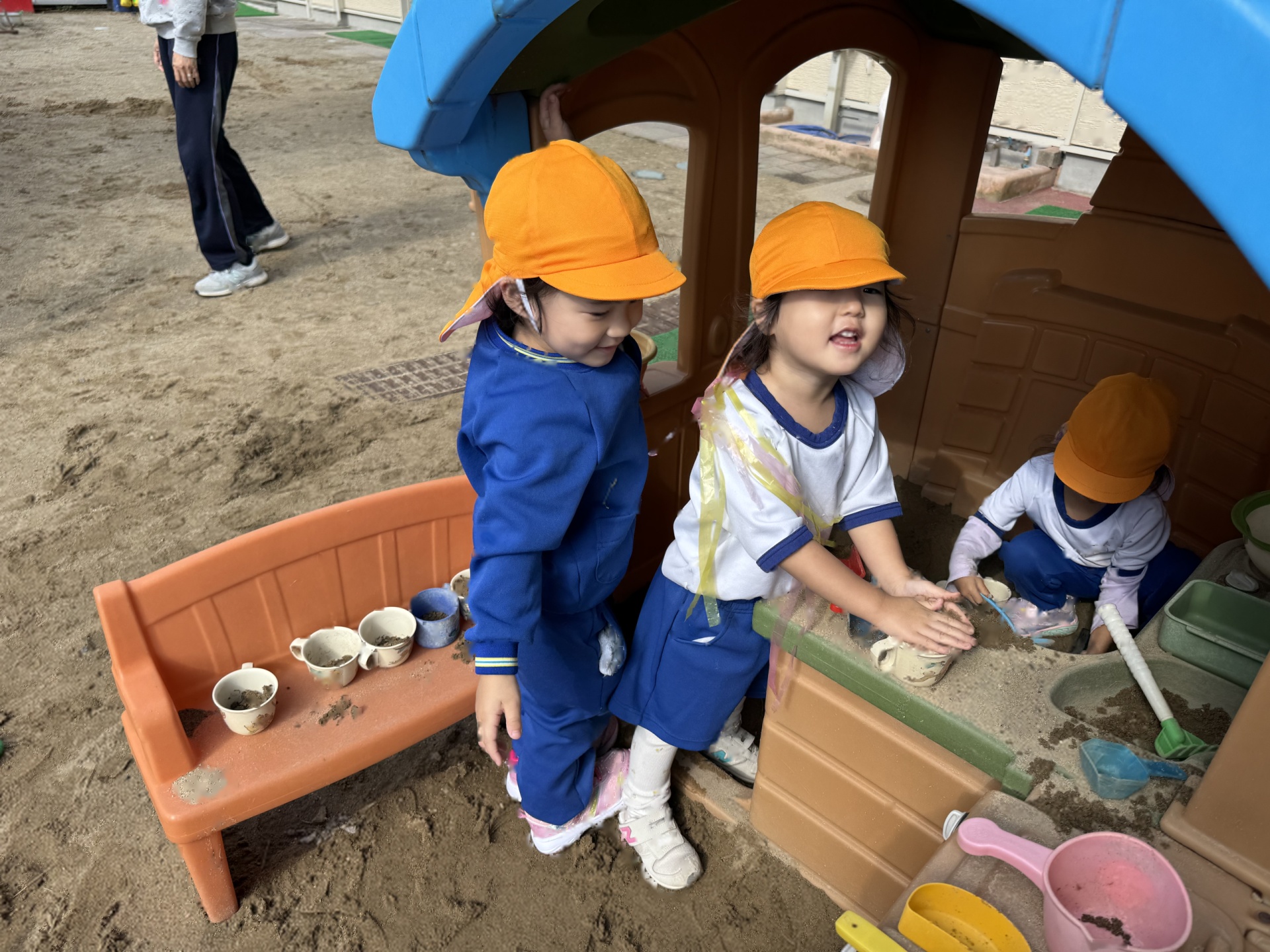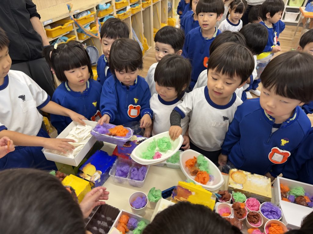 ☆初めてのお店屋さんごっこ、素敵な空間に目が輝いていたたんぽぽ組の子ども達でした♪ゆり組さん、ありがとう!!午後からは園庭で遊びました。午前中のお店屋さんごっこをうけて、砂場であいすやさんが始まったり、デコレーションケーキ作りが始まったりと遊びが広がっている様子がみられました☆