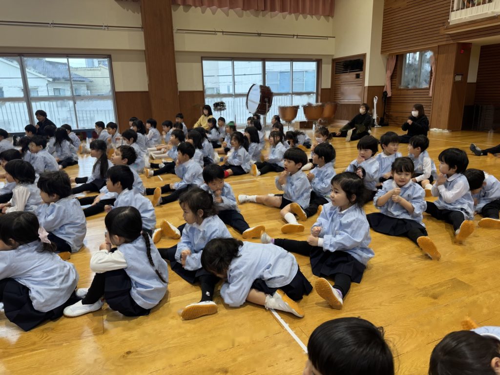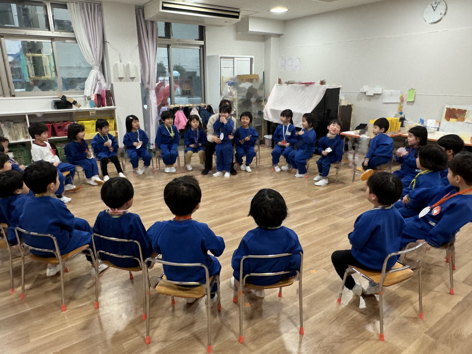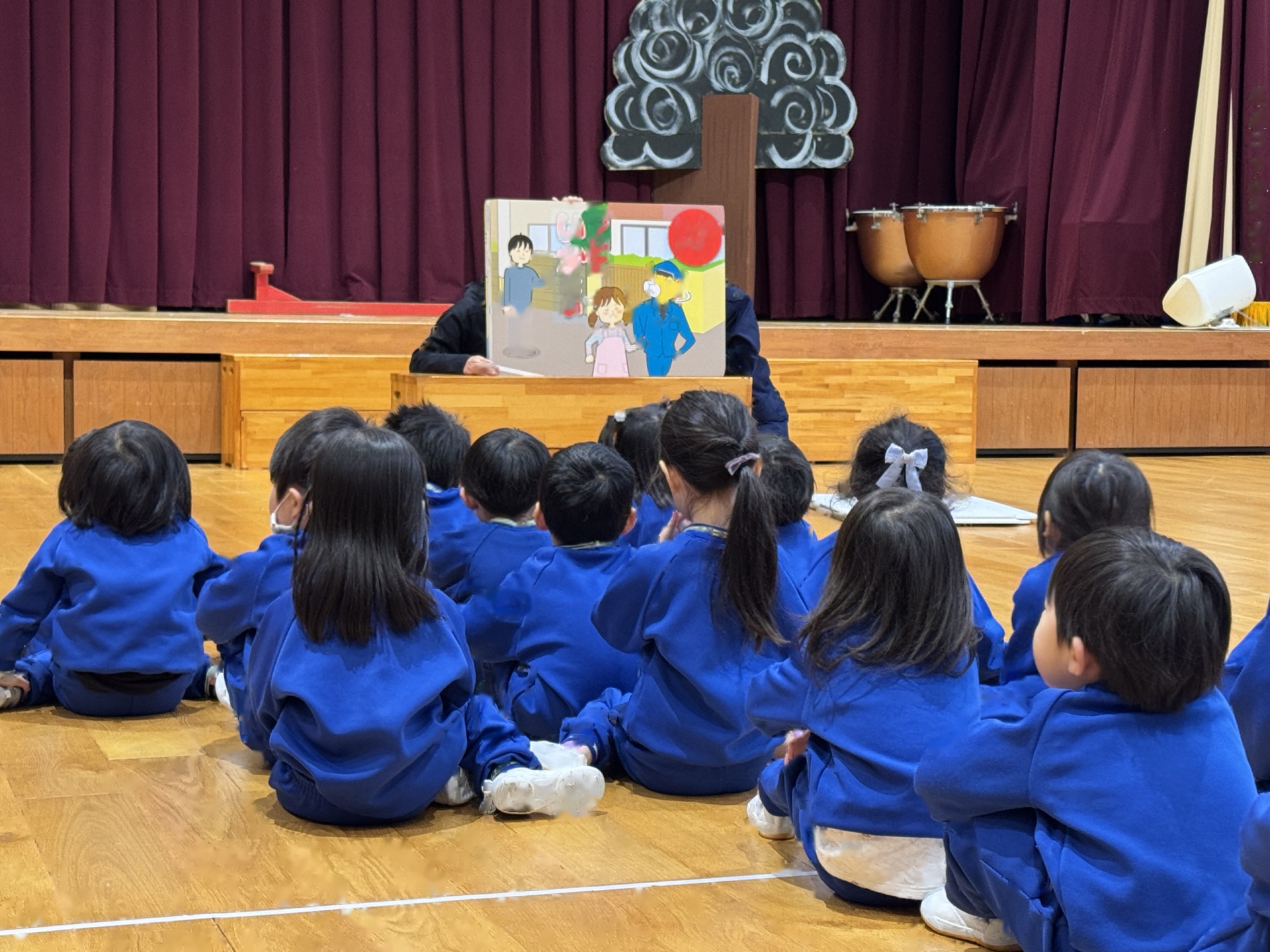 ☆紙芝居を見た後は、年長さんが怖い人に出会ったときはどうしたらいいのか実践してみせてくれました。真剣に話を聞いていたたんぽぽ組の子ども達です。