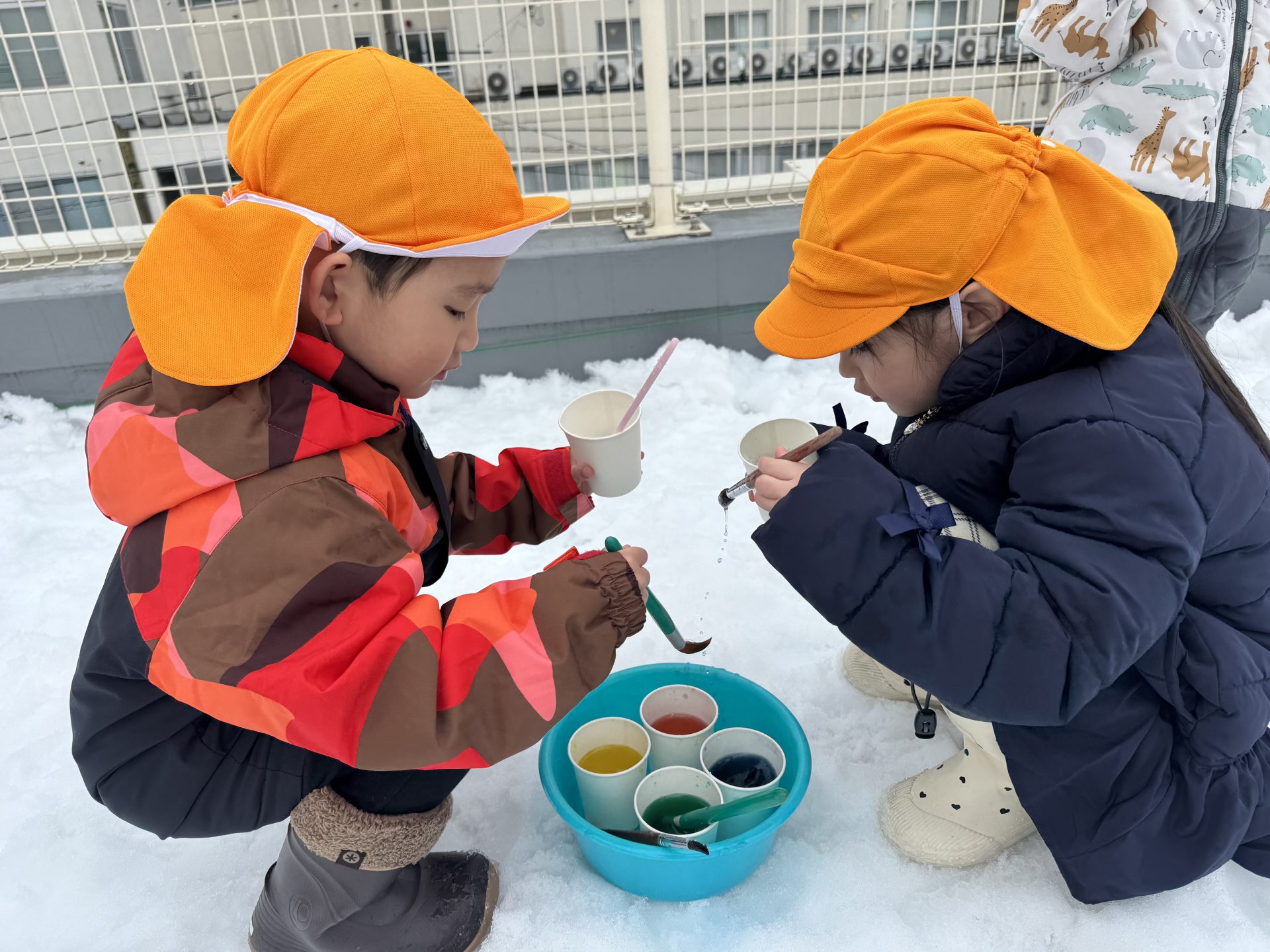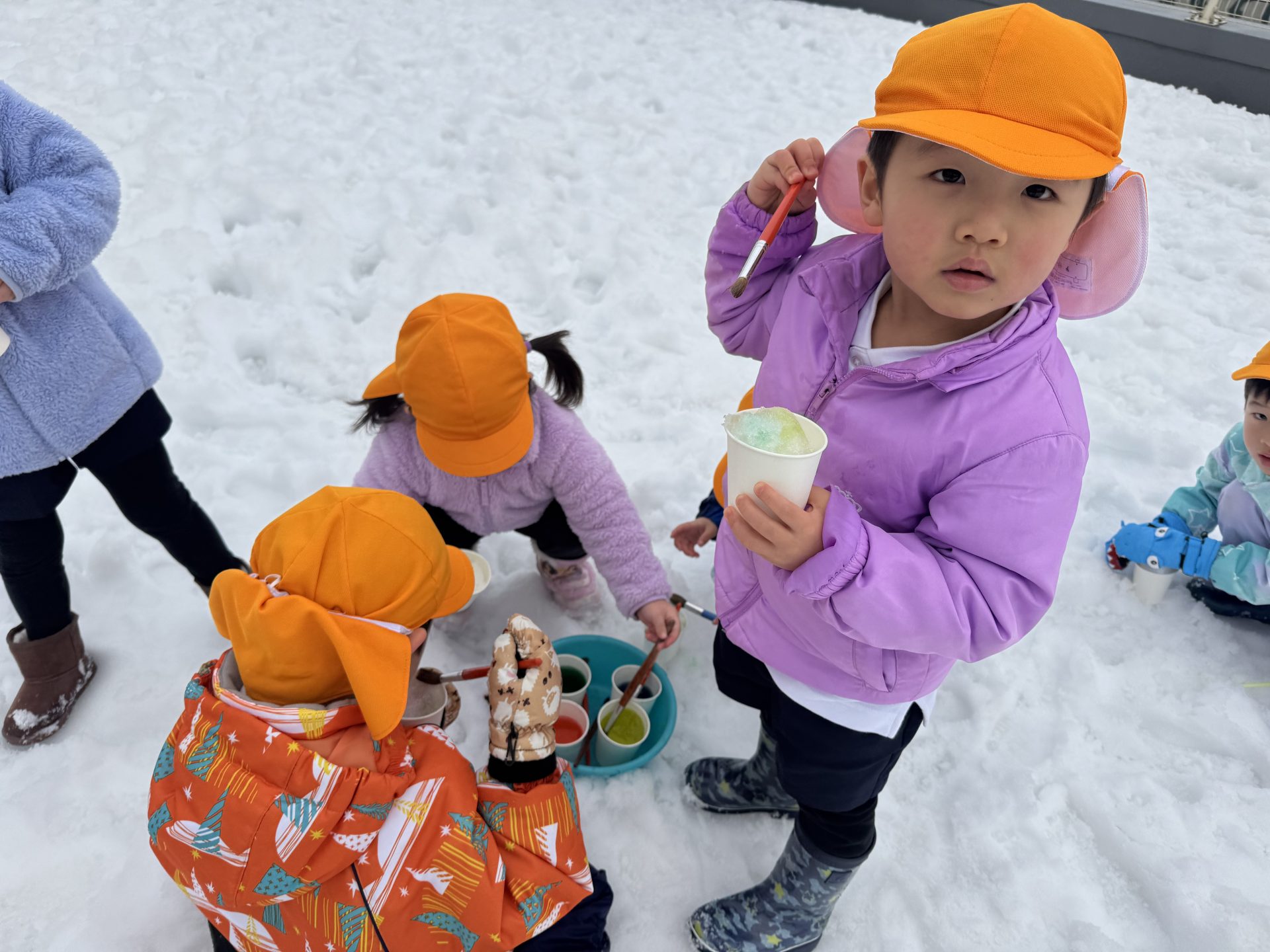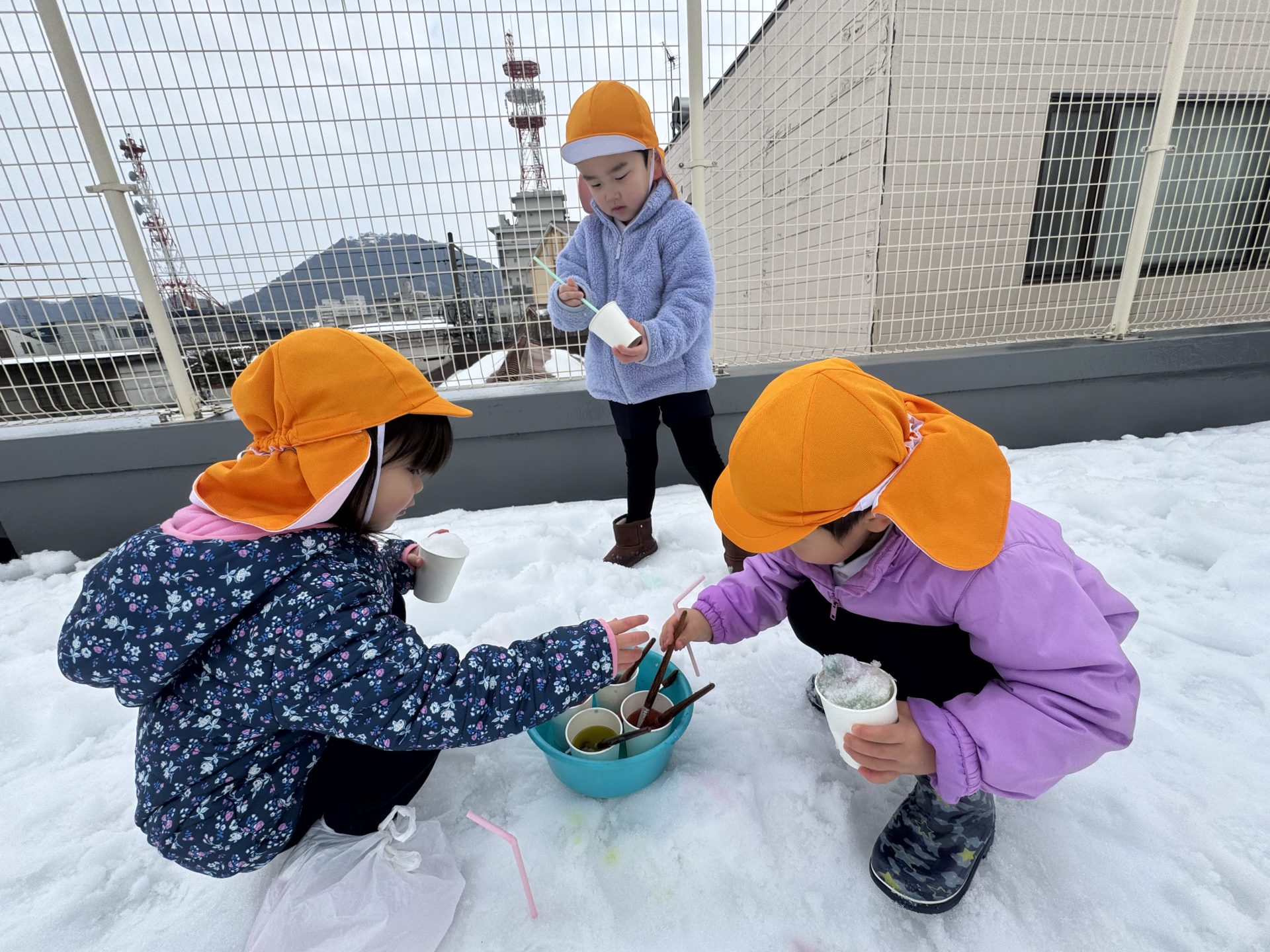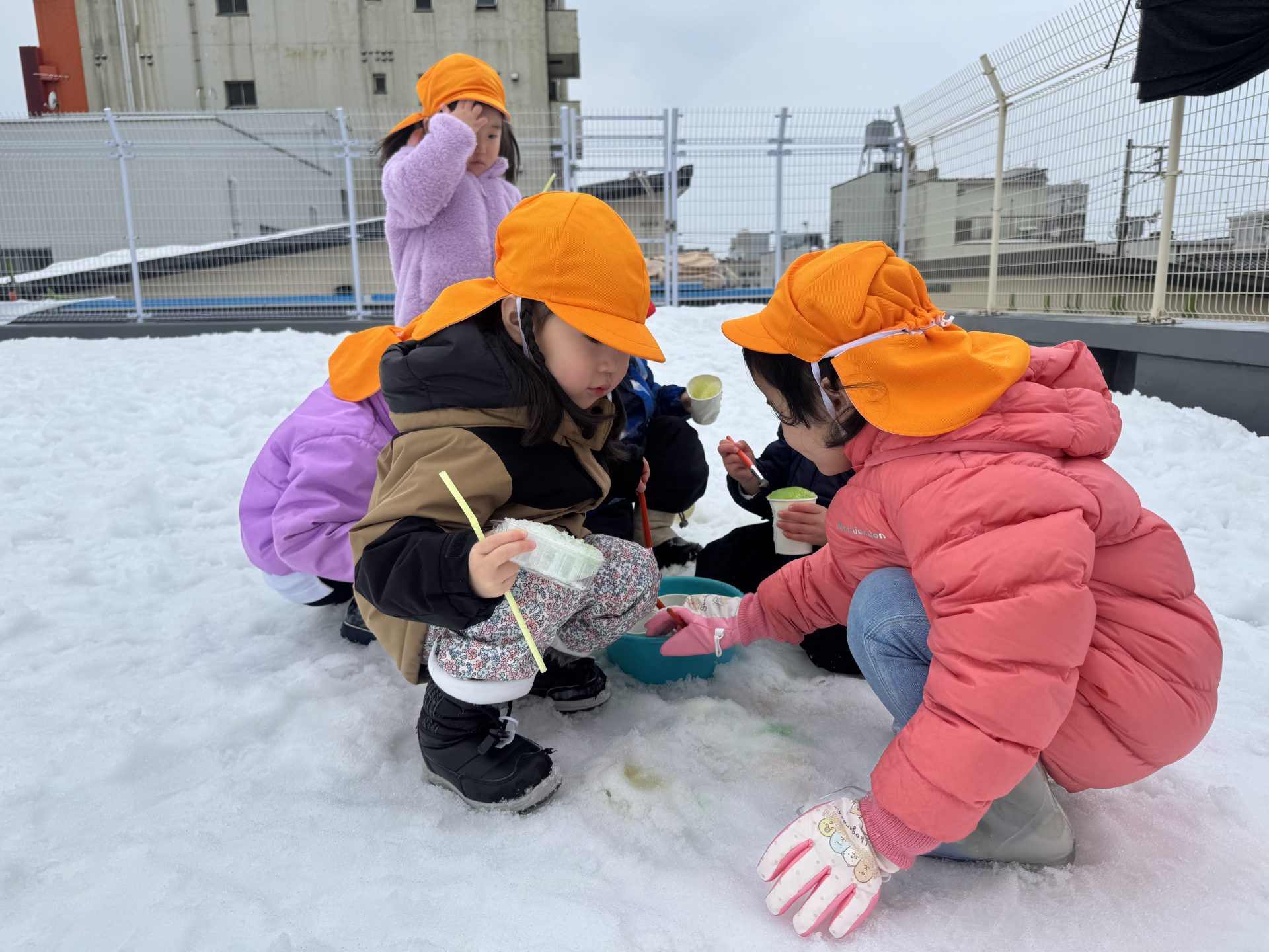 昨日は雨が降りましたが、幼稚園の屋上にはまだ雪がいっぱい残っています!少しずつ溶けかかった雪がしゃりしゃりとかき氷のような氷に変身しており、今日はみんなで色水を使ってかき氷屋さんごっこをして遊びました☆
