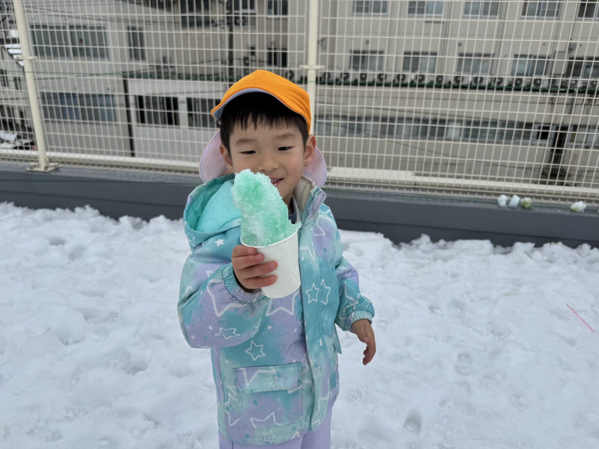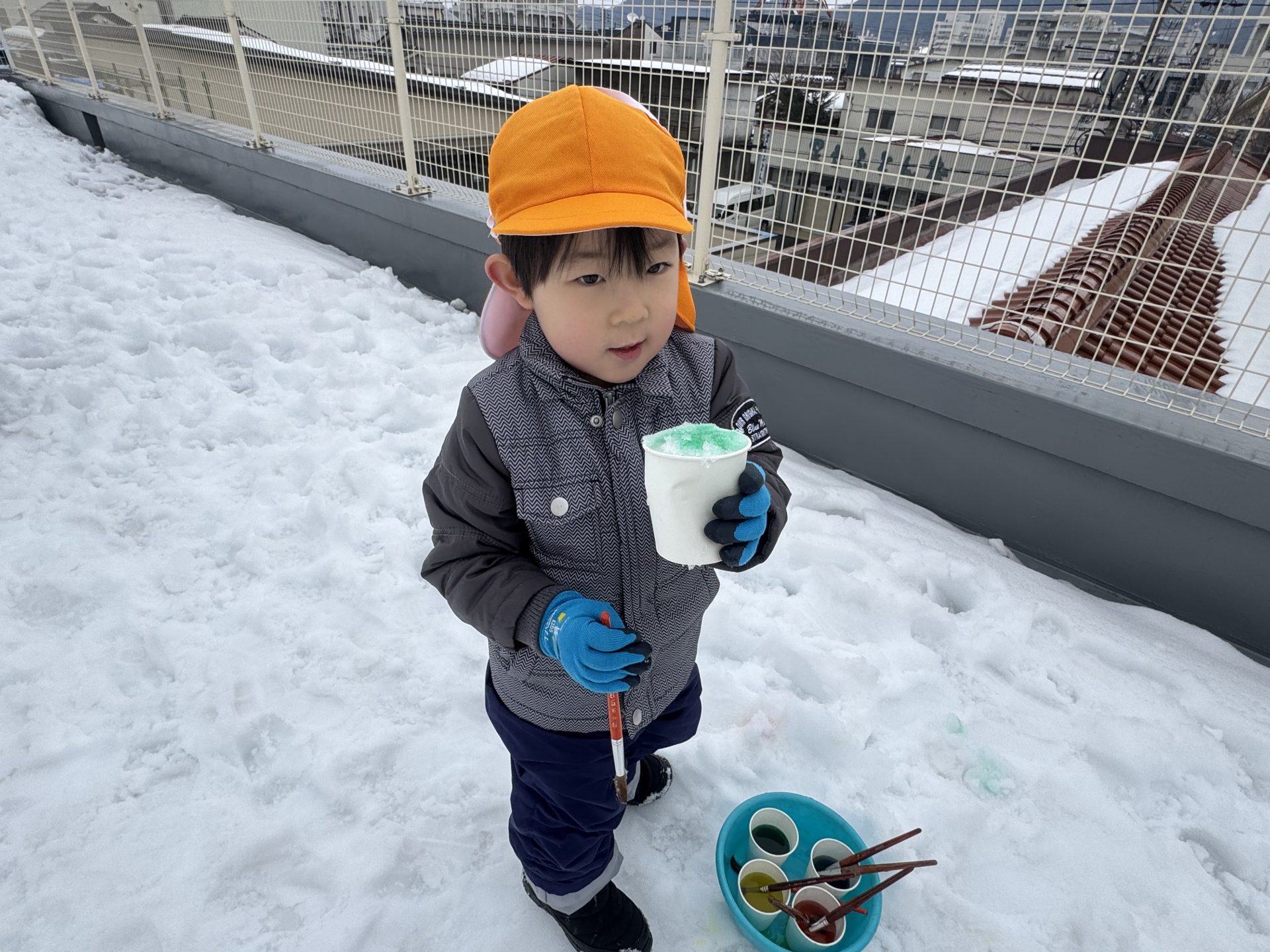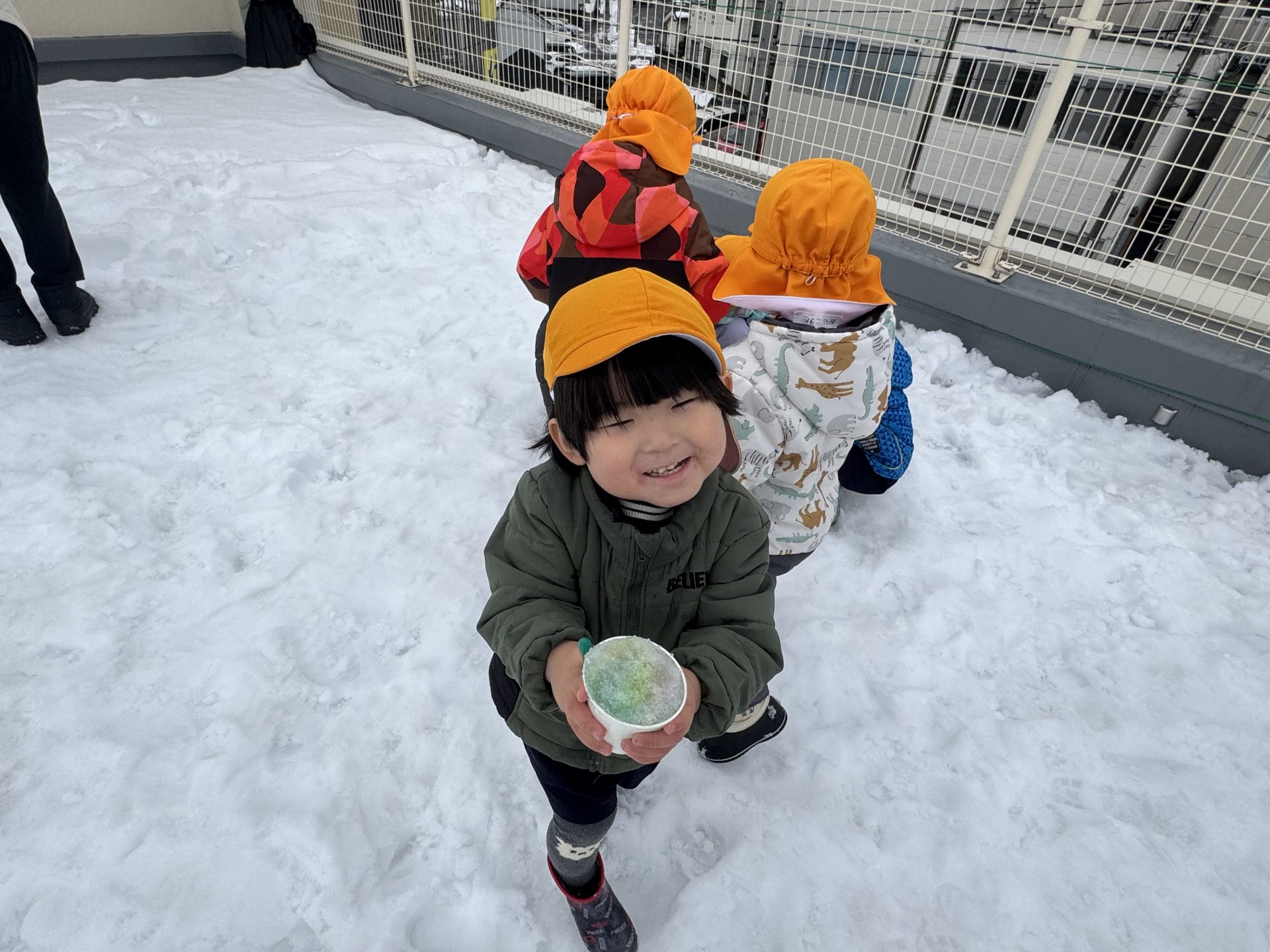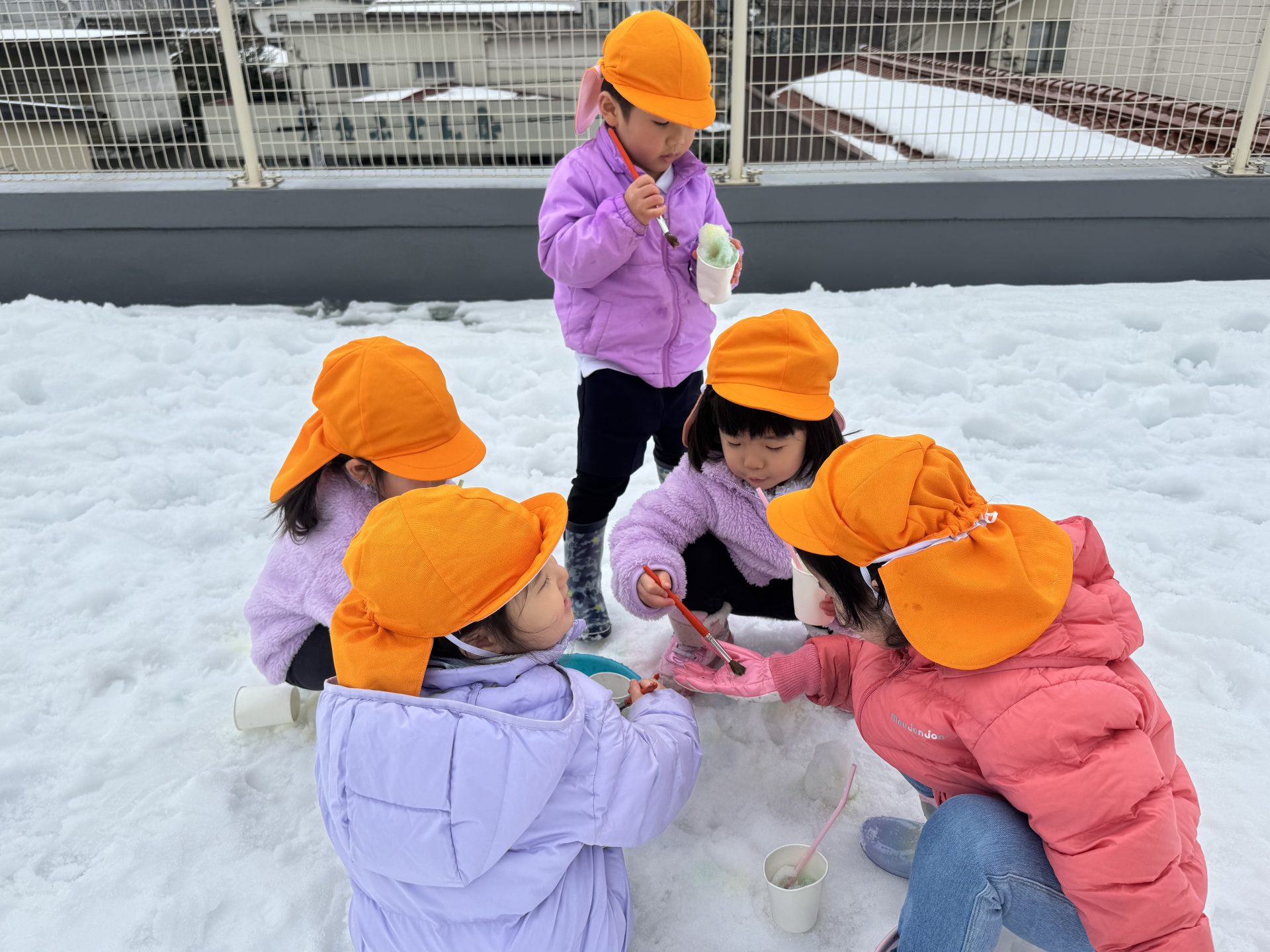 昨日は雨が降りましたが、幼稚園の屋上にはまだ雪がいっぱい残っています!少しずつ溶けかかった雪がしゃりしゃりとかき氷のような氷に変身しており、今日はみんなで色水を使ってかき氷屋さんごっこをして遊びました☆