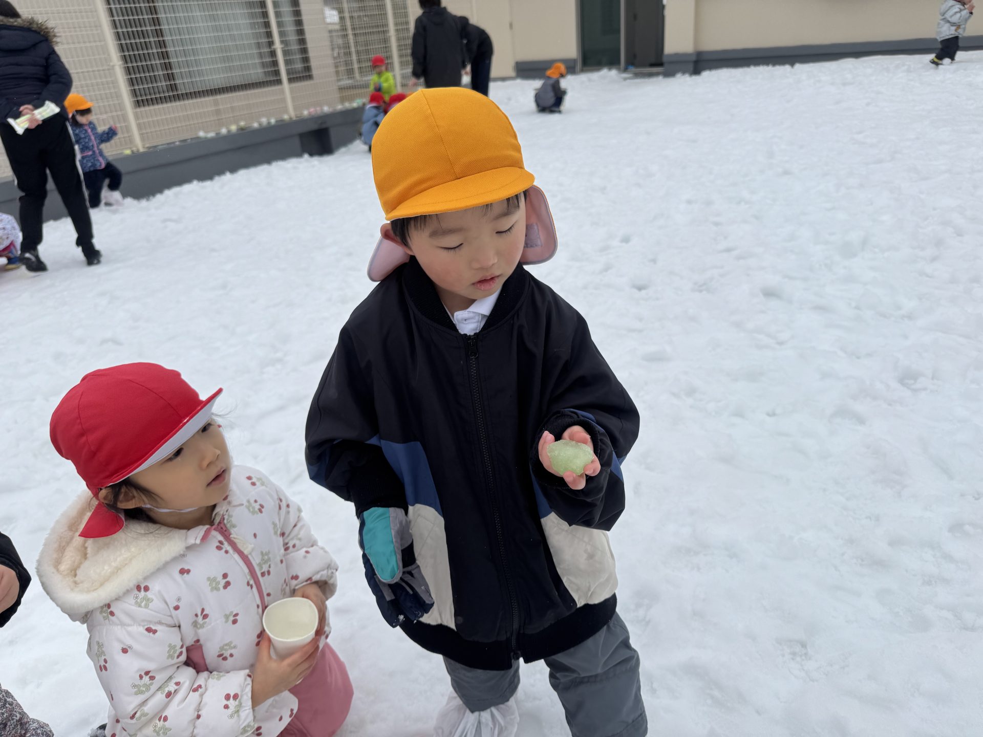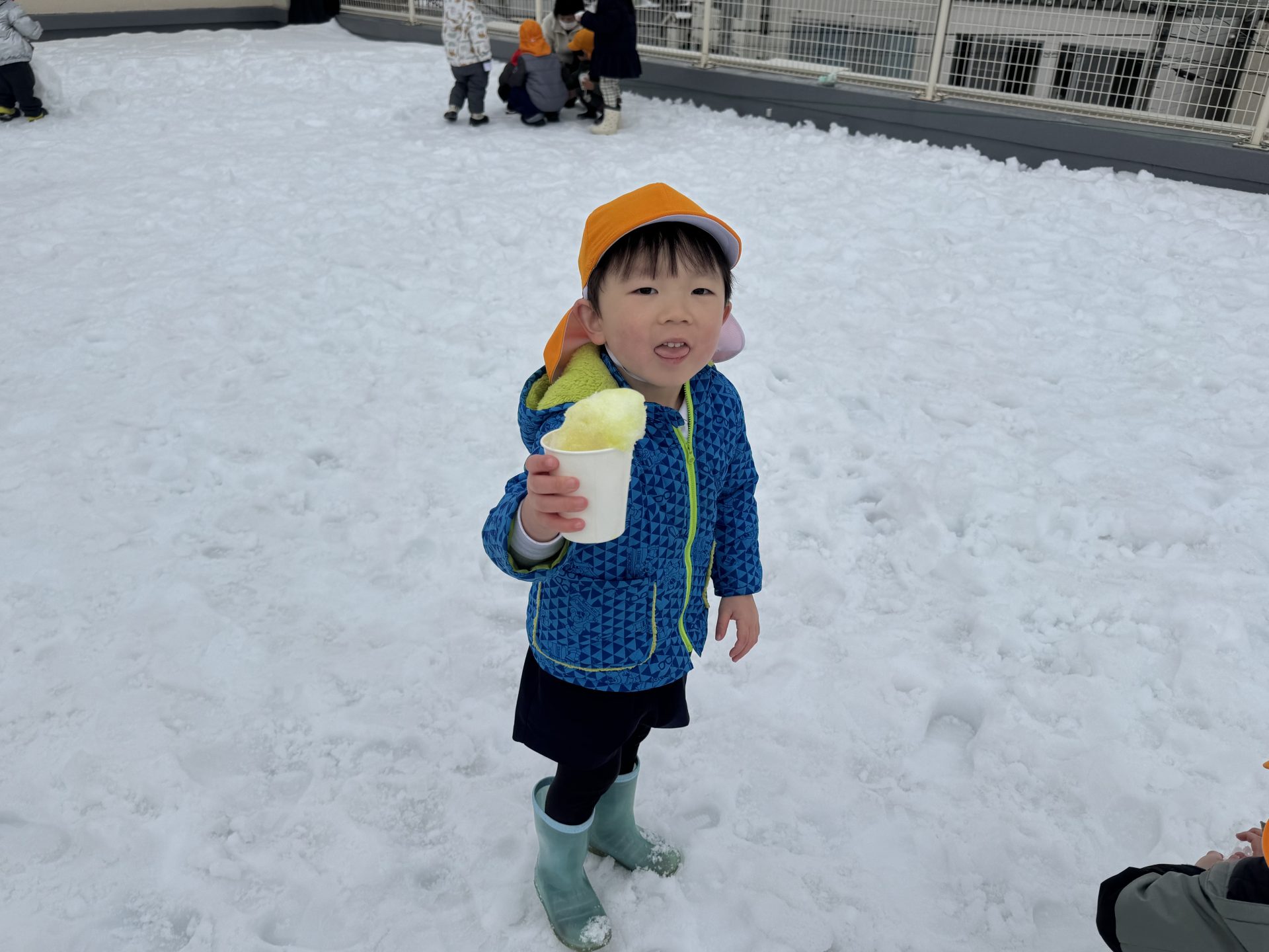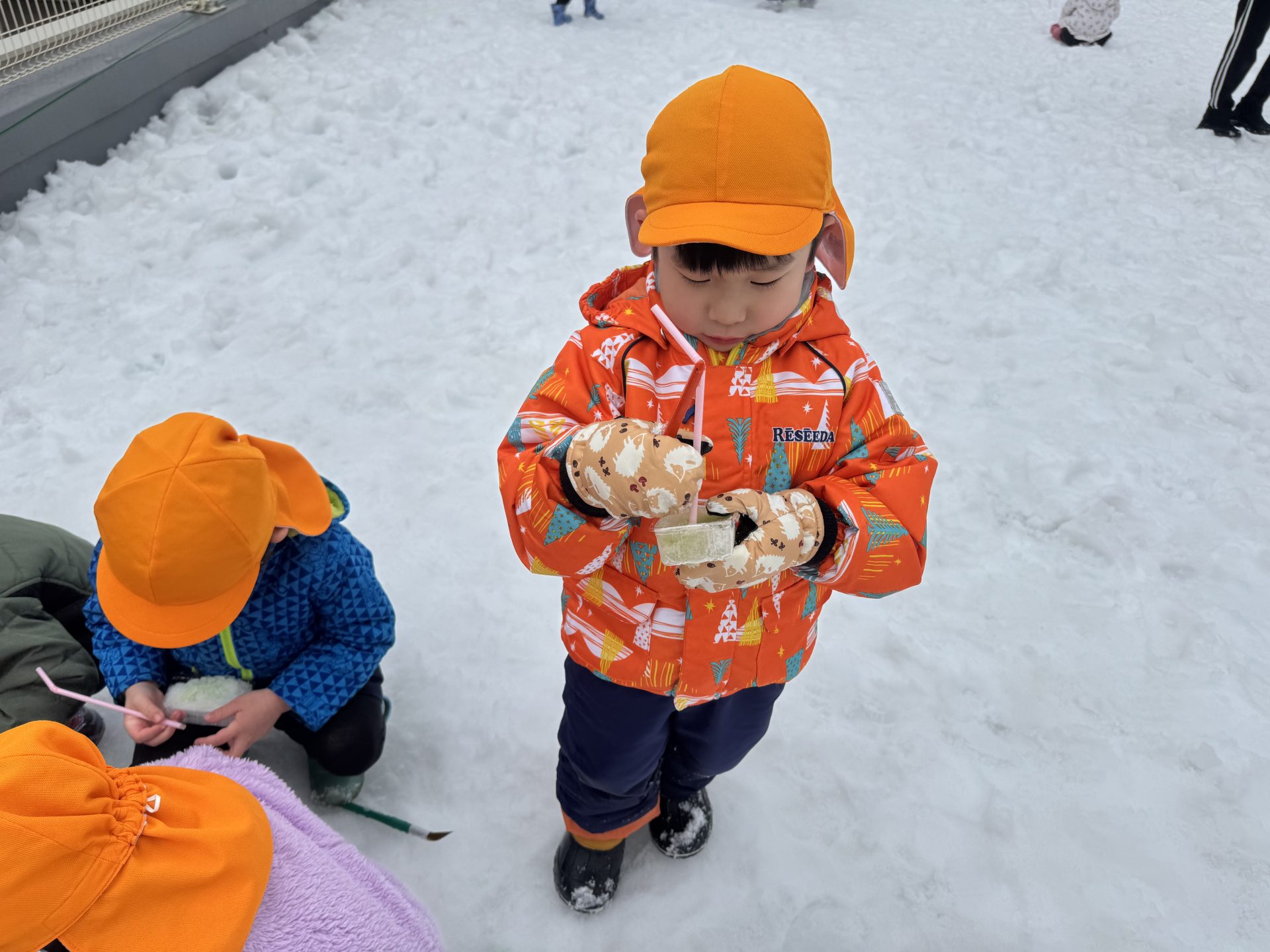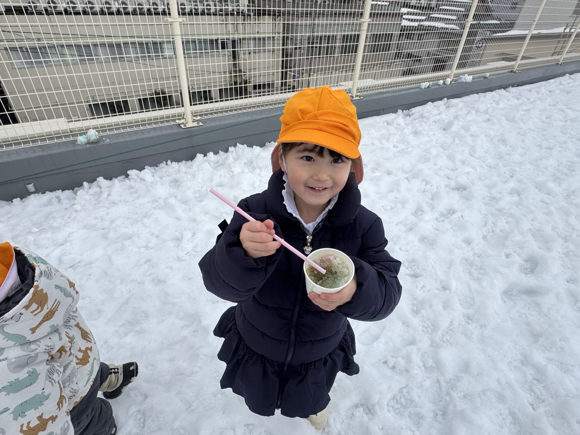 昨日は雨が降りましたが、幼稚園の屋上にはまだ雪がいっぱい残っています!少しずつ溶けかかった雪がしゃりしゃりとかき氷のような氷に変身しており、今日はみんなで色水を使ってかき氷屋さんごっこをして遊びました☆