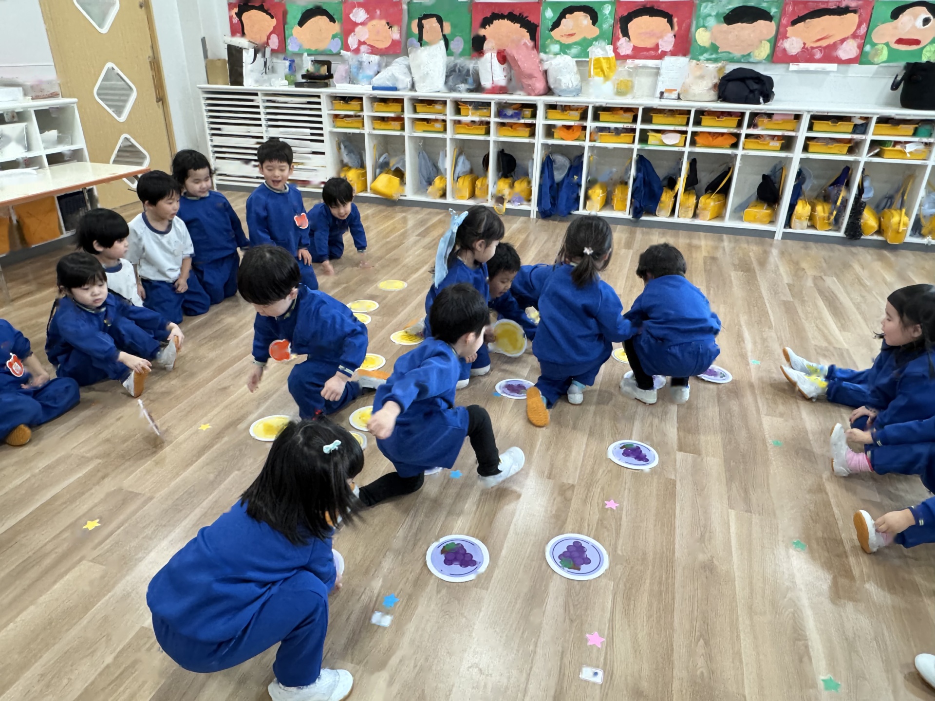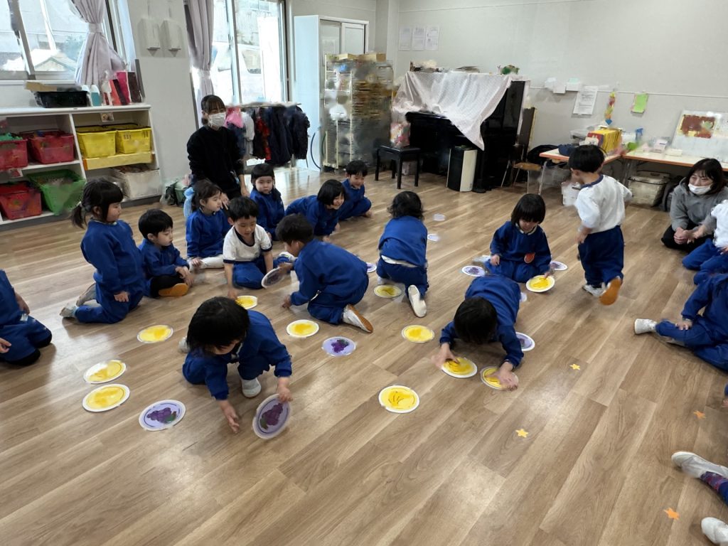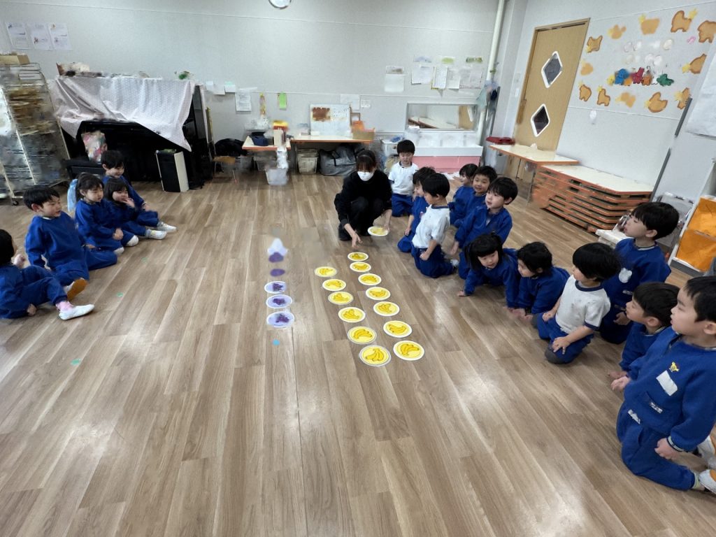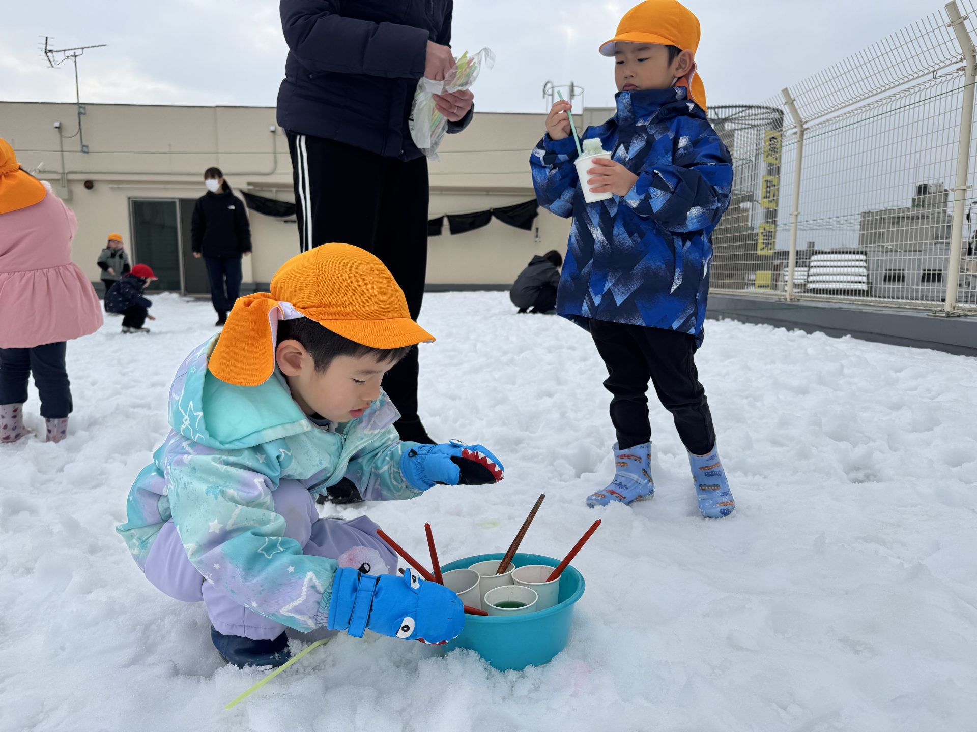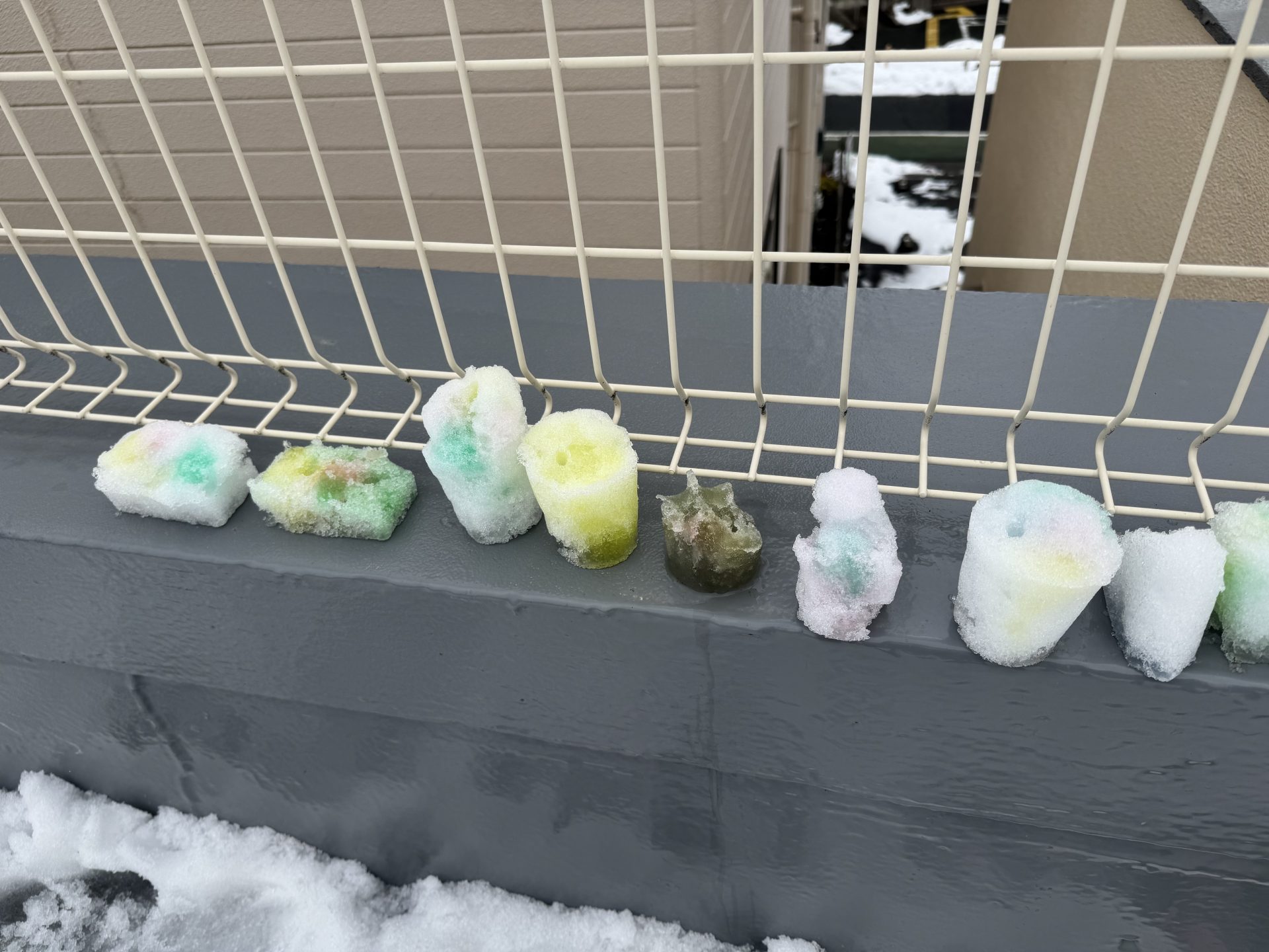 昨日は雨が降りましたが、幼稚園の屋上にはまだ雪がいっぱい残っています!少しずつ溶けかかった雪がしゃりしゃりとかき氷のような氷に変身しており、今日はみんなで色水を使ってかき氷屋さんごっこをして遊びました☆