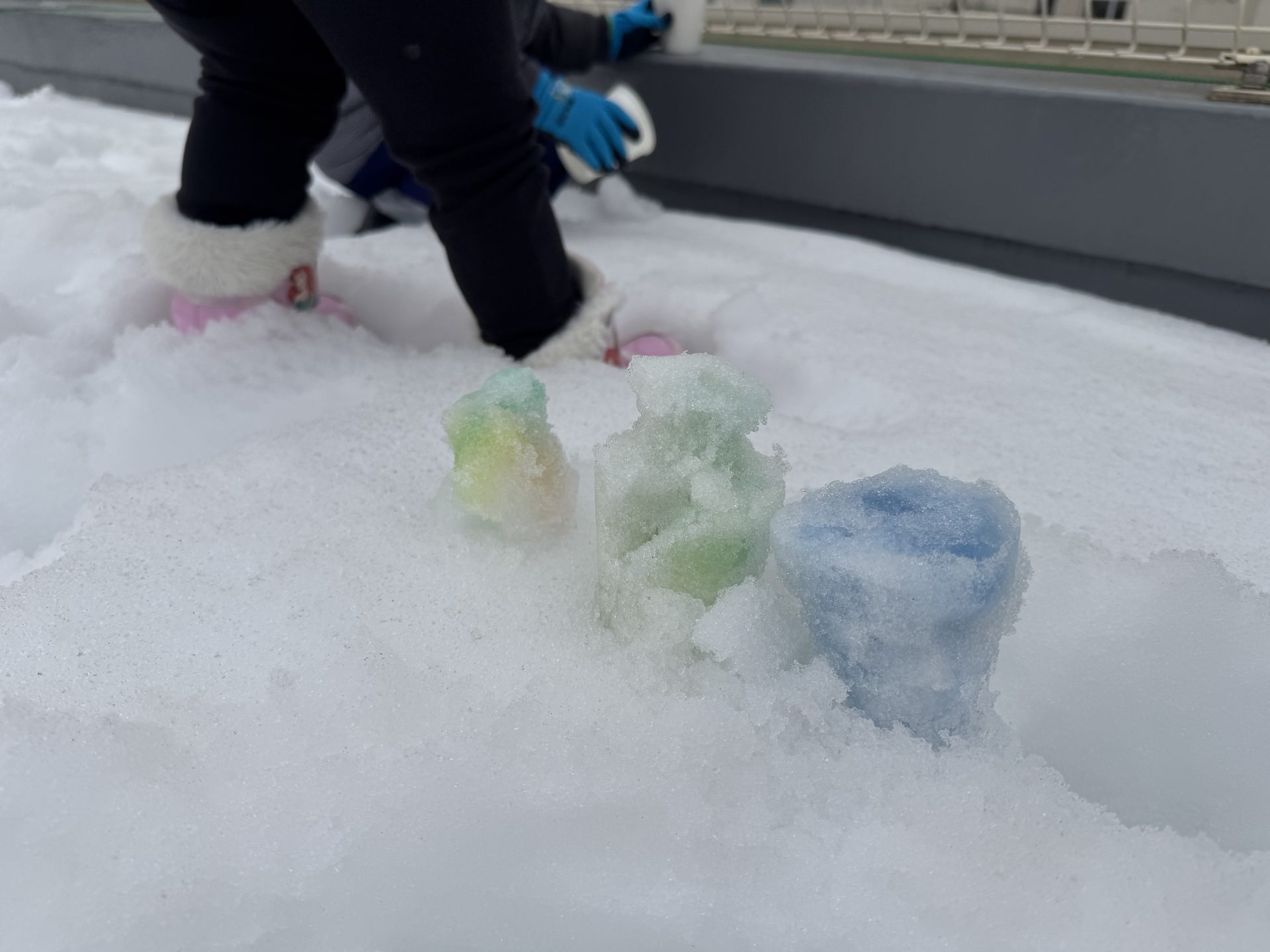 カップに雪をいっぱい詰めて、色水を少しずつ氷につけ、氷が染まっていく様子を見たり、色が混ざる様子を楽しみながら「みて~☆きれいな色だよ☆」と出来上がったかき氷をみんなで見比べたりしながら夢中になって遊んでいました(^^♪