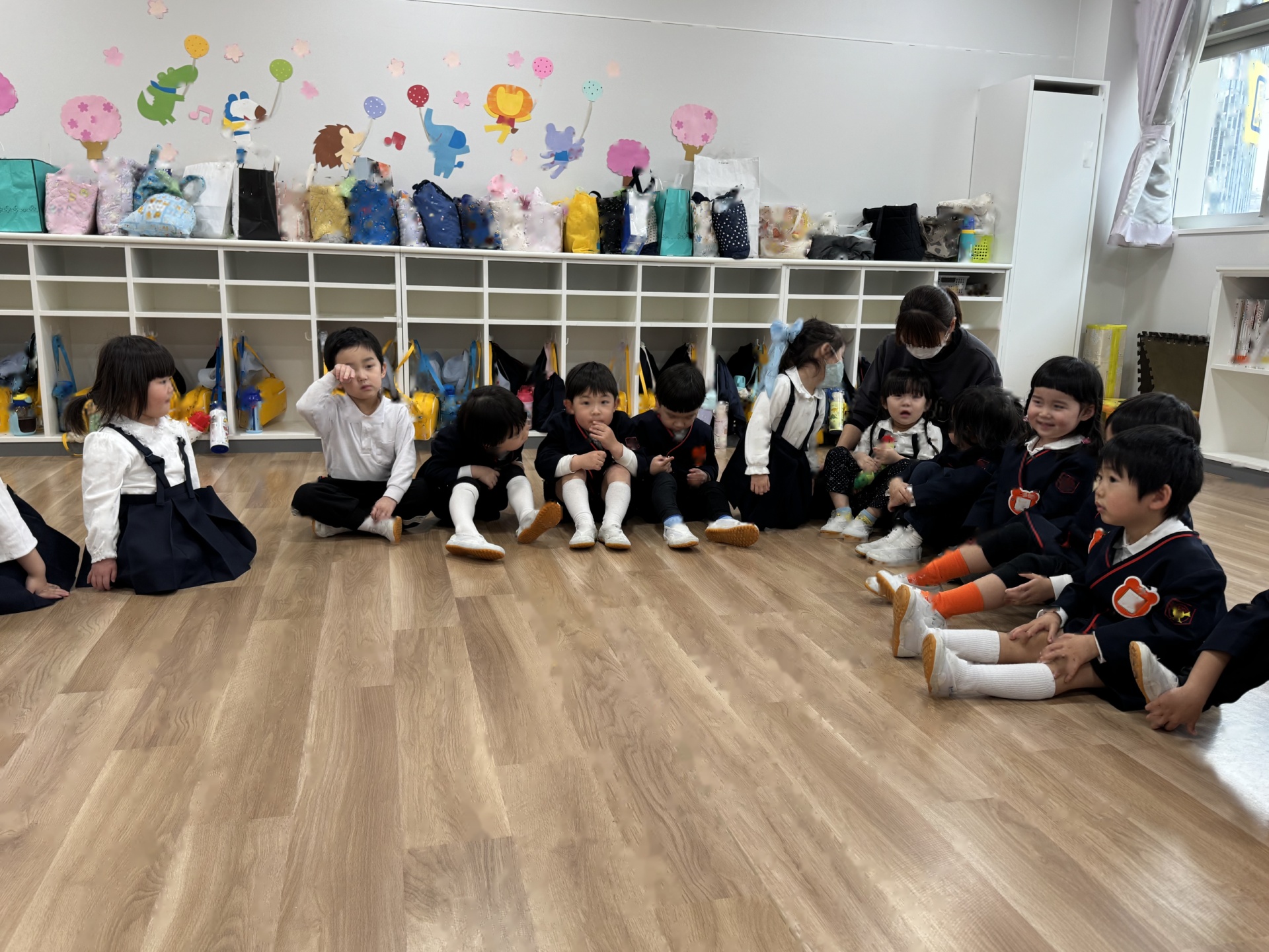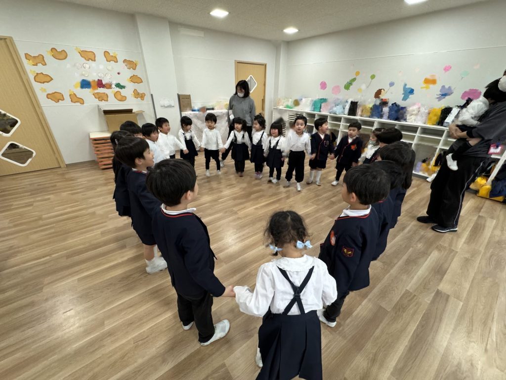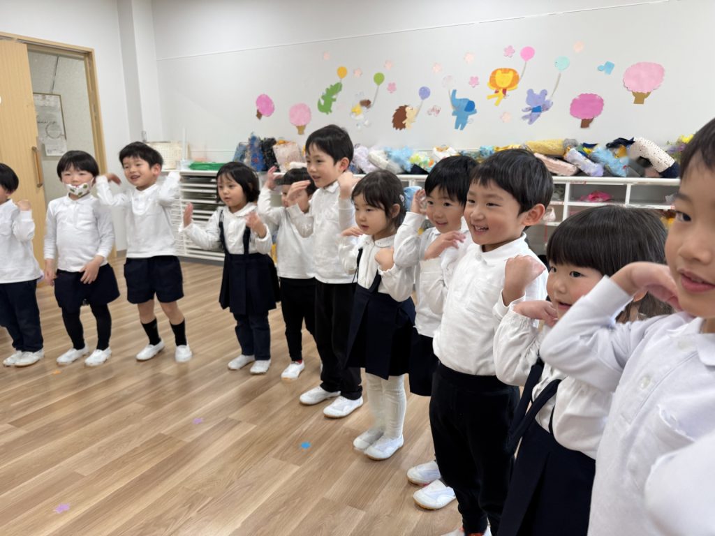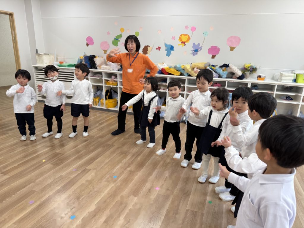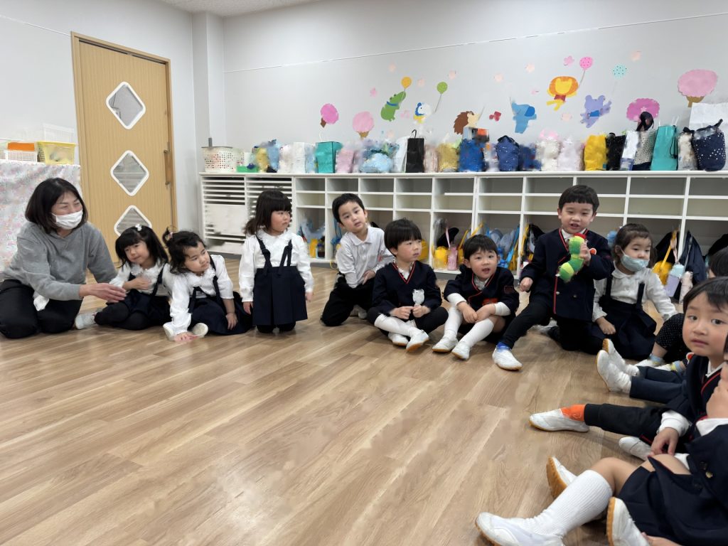 いよいよ年少組最終日を迎えました。いつものように元気に挨拶をして登園され、たくさん遊んで、笑って、食べて、賑やかく過ごした最終日でした(^^♪今日1日の様子を少しご紹介します☆まずはいつものように朝の会スタート!最後のお当番は・・・ひこうきグループさんでした!