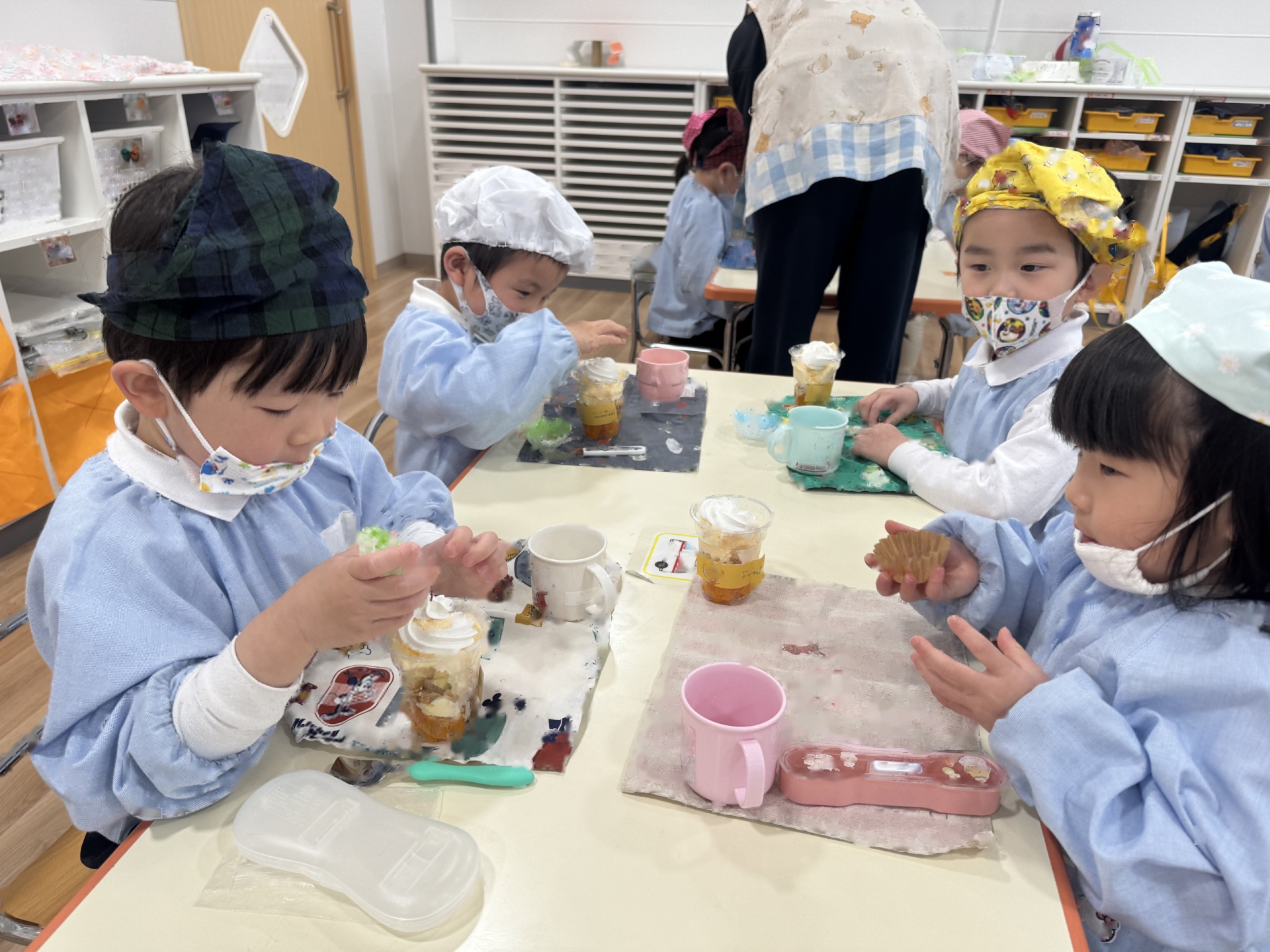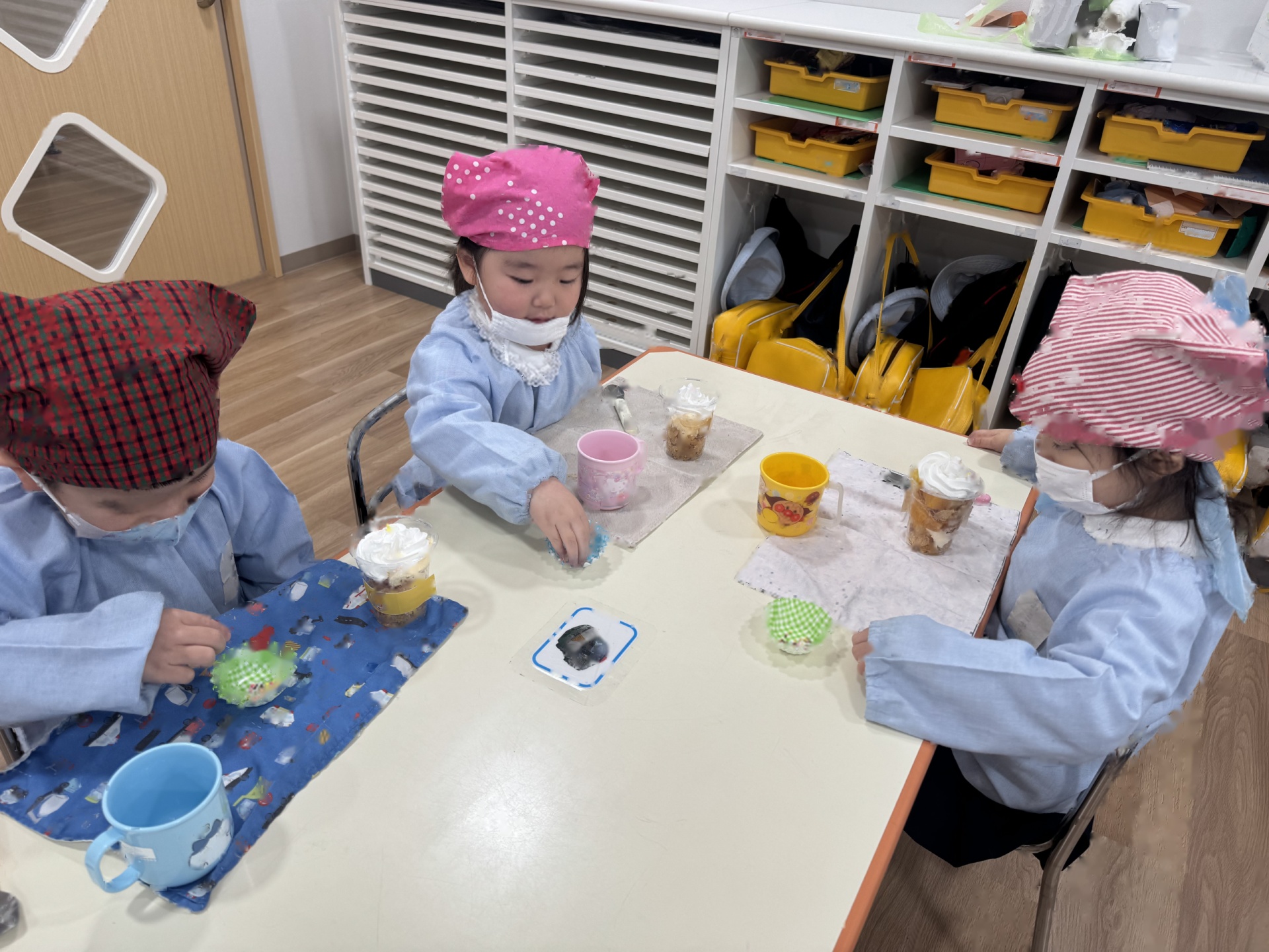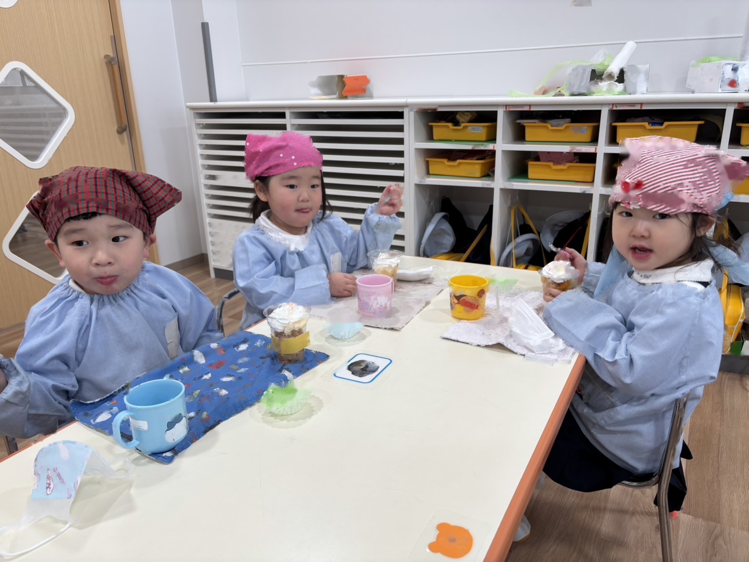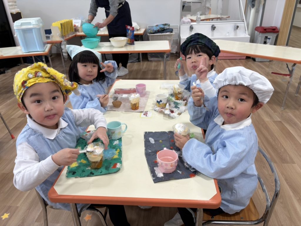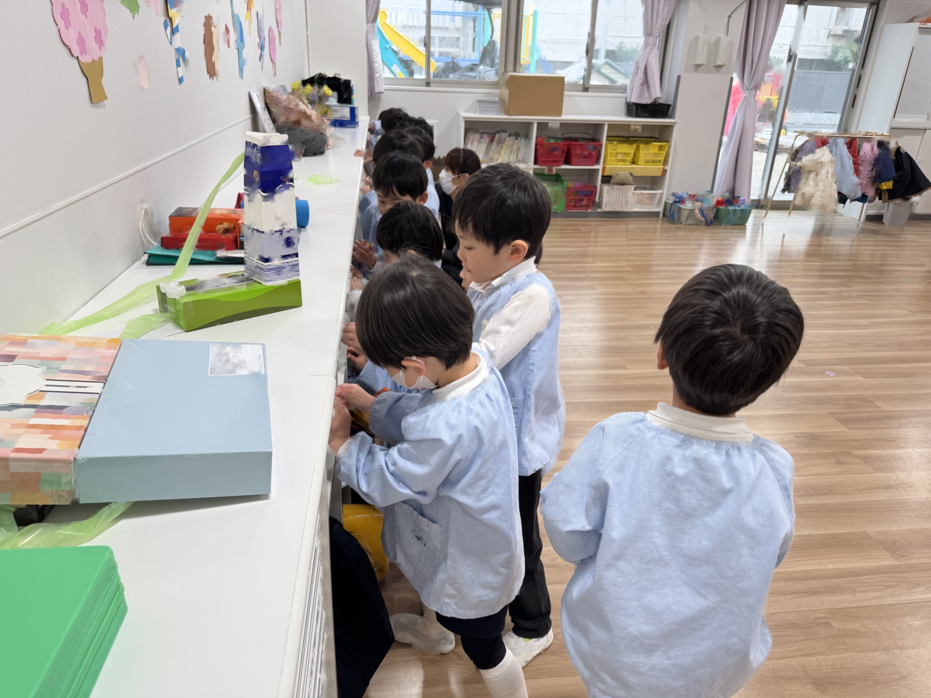 年中さんは、「だいすきのプレゼント」の歌のプレゼントと、年長さんに忘れないでね!の思いを込めて自分達を描きました☆