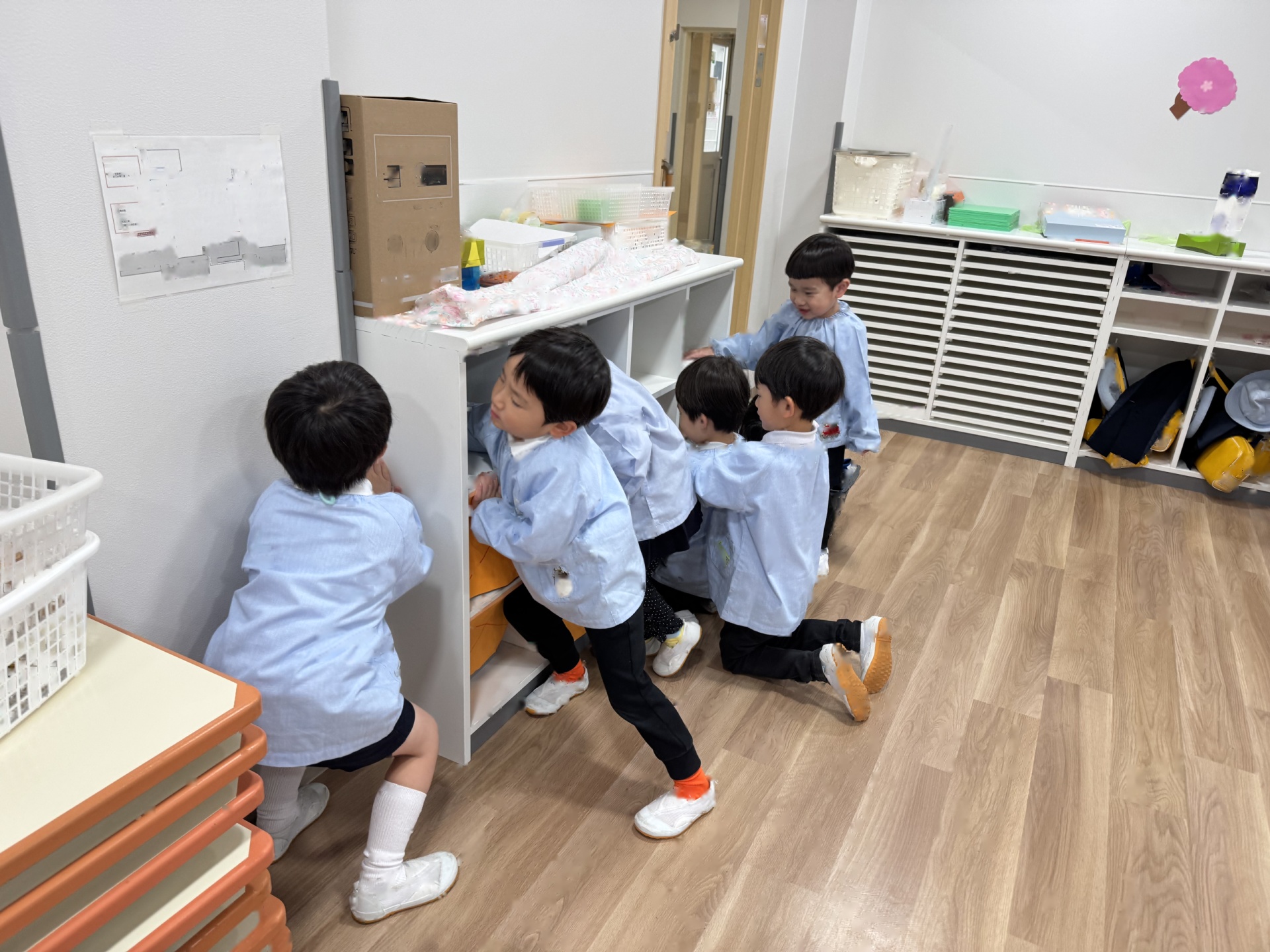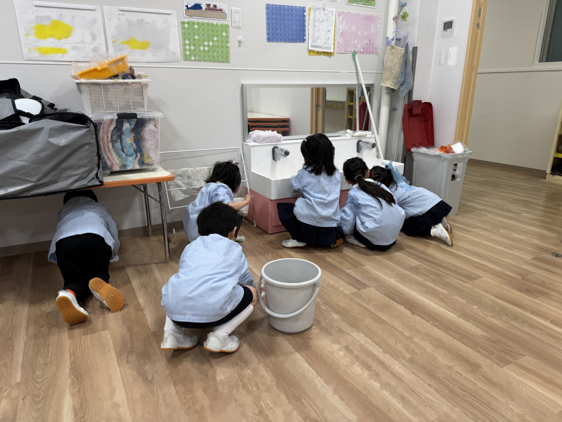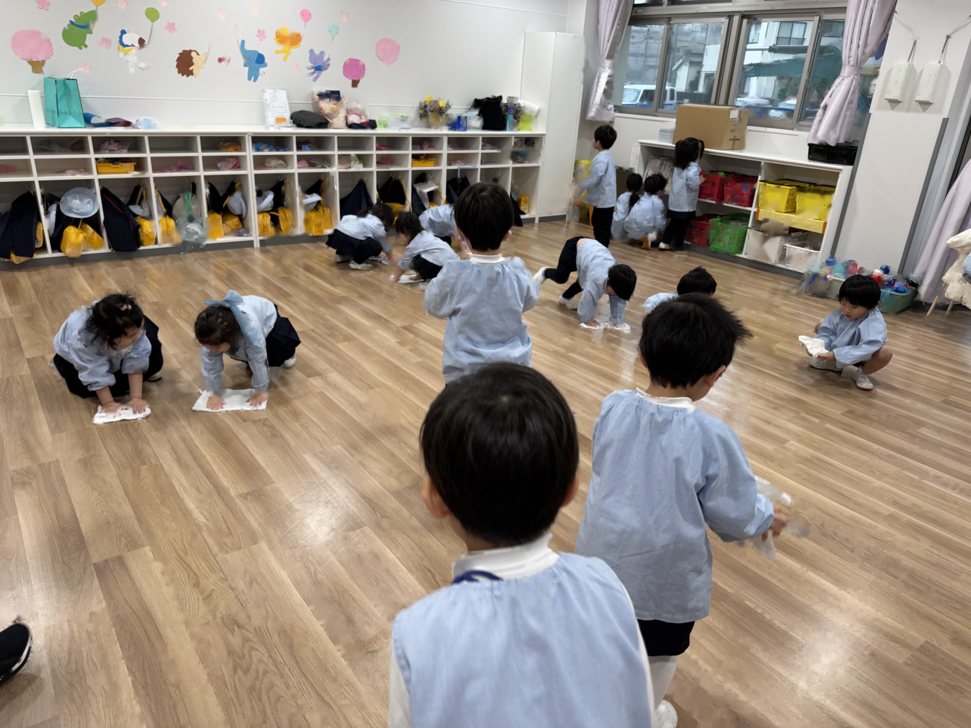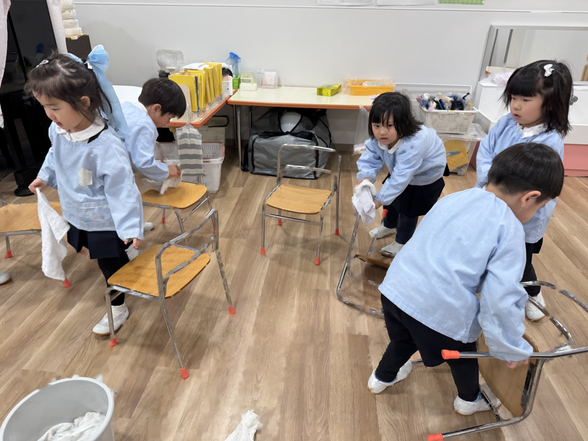 ☆来年度、次のりんご組のお友達がお部屋を使うことができるようにみんなでピカピカ大掃除をしました!いろいろなところに貼っていたマークを外したり、棚や椅子の拭き掃除、最後は床までピカピカに磨きました!