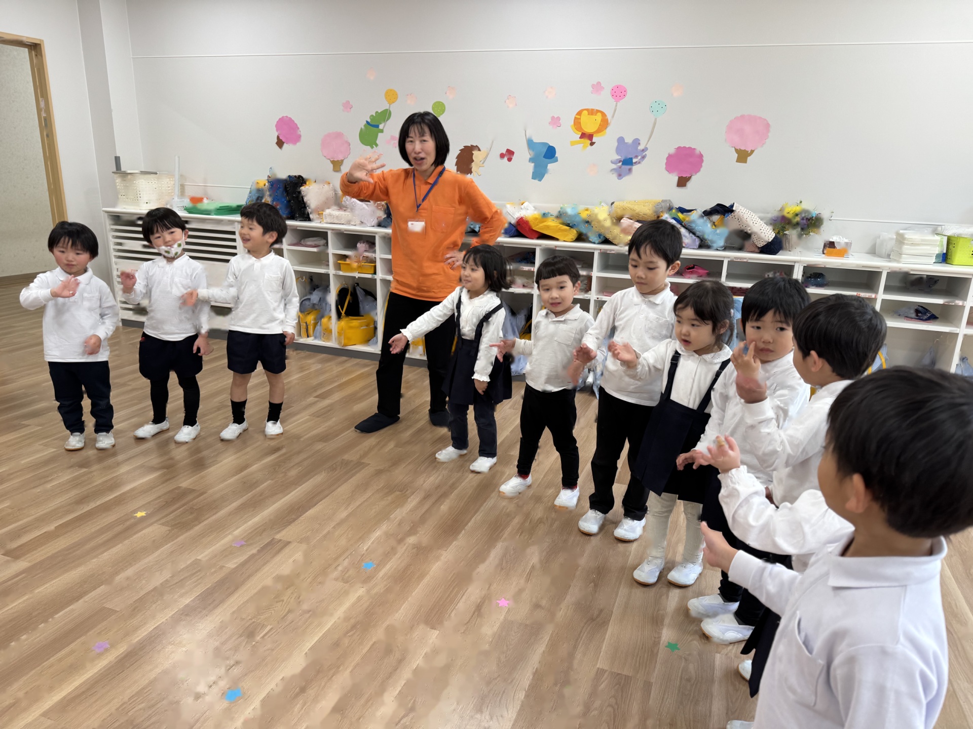 次は、片足を上げて挑戦しました!おっとっと・・・とバランスを崩す姿も見られましたが、何度も挑戦して、しっかり腕に力を入れて体を支え、ライオンのように歩いていた子ども達です♪最後に、もっと腕の力がついてくると、こんなことができるようになるよ!と先生が側転を披露してくれました!子ども達は、かっこいい姿に「すごーい!!」と大盛り上がりでした♪これからも楽しみながら身体をしっかり動かしていきたいと思います!