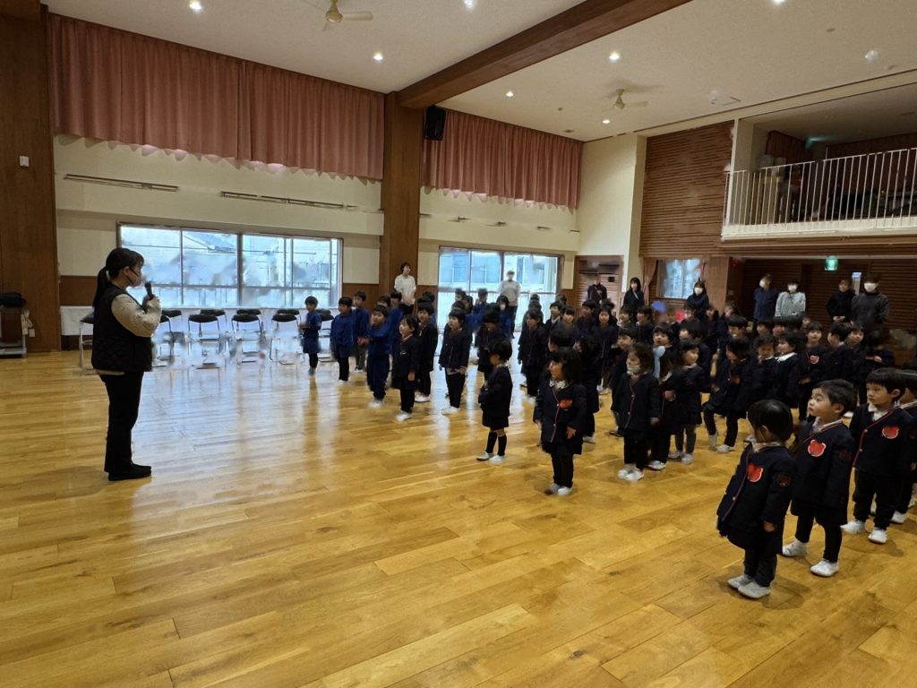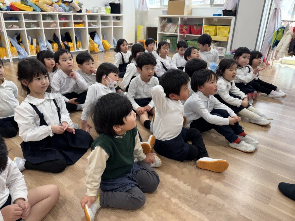 年長組さんの卒園式練習を年中・年少・2歳の子ども達が見学しました。年長組のお兄さん・お姉さんが証書をもらったり、歌を歌ったりするかっこいい素敵な姿をしっかり見ていました。