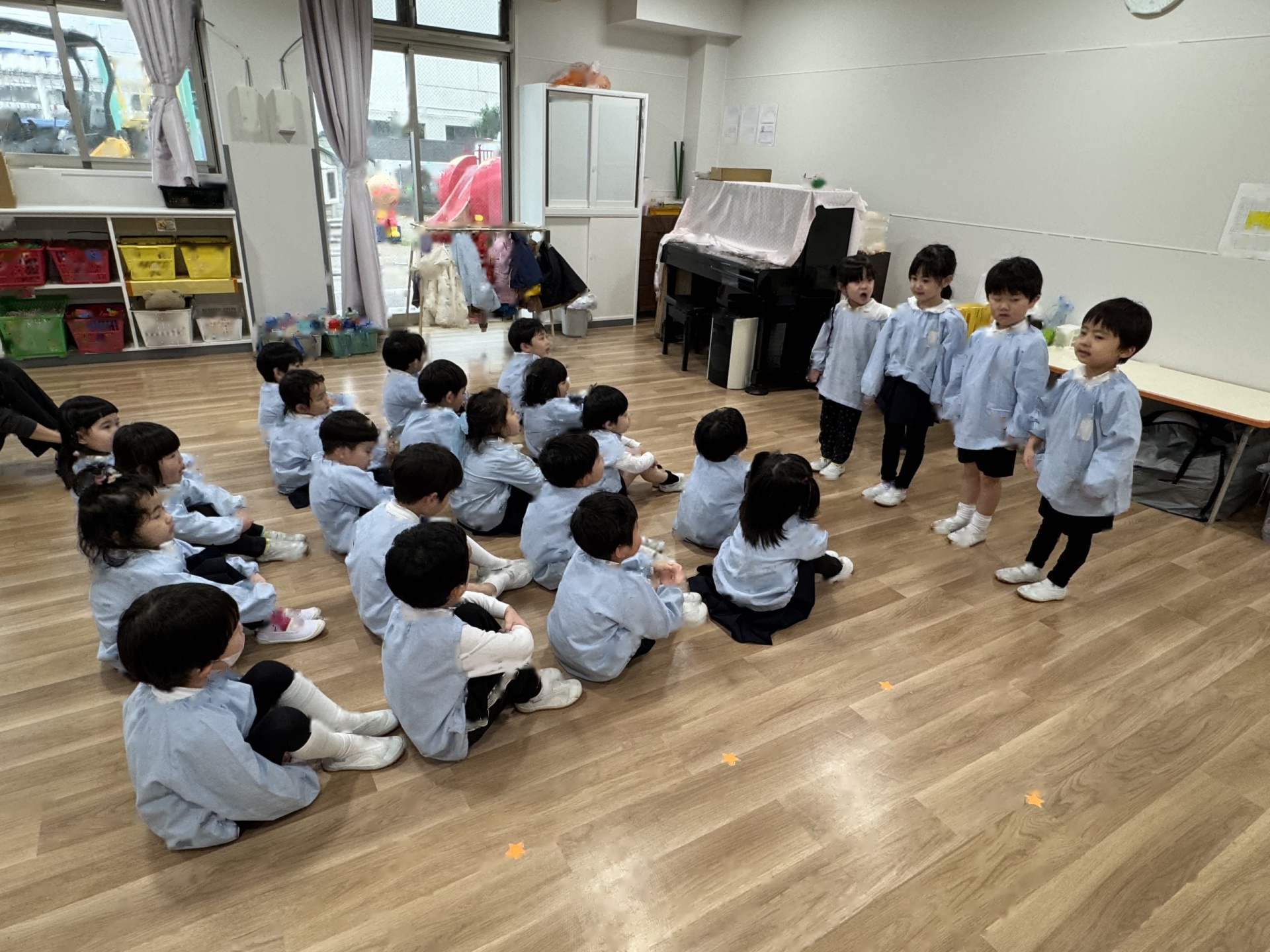 卒園式練習後に、おわかれ会を行いました。はじめに、年中・年少・2歳さんからありがとうの思いを込めて「またあいにきてね」の歌を歌いました。