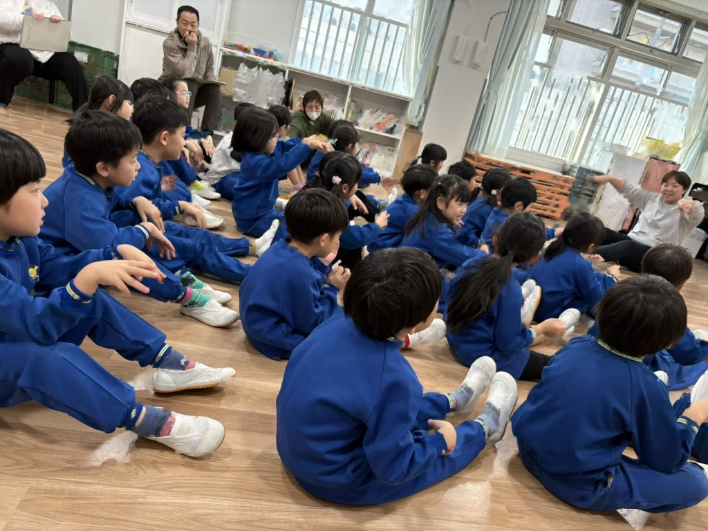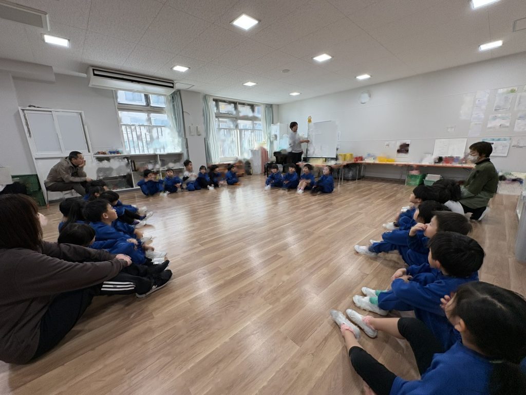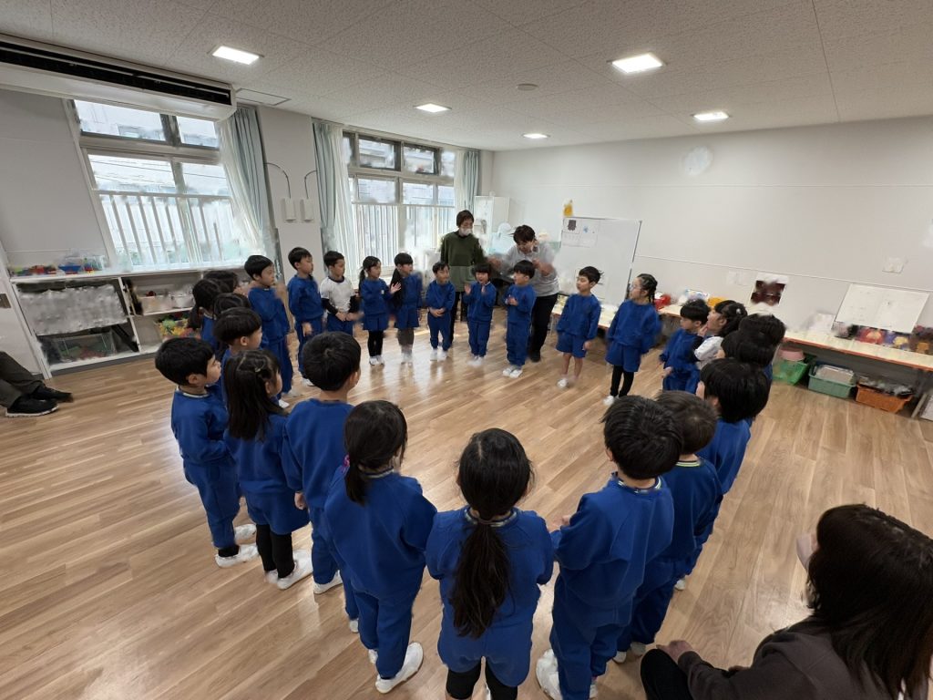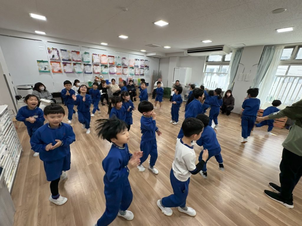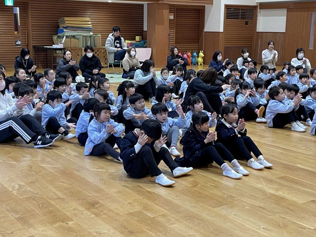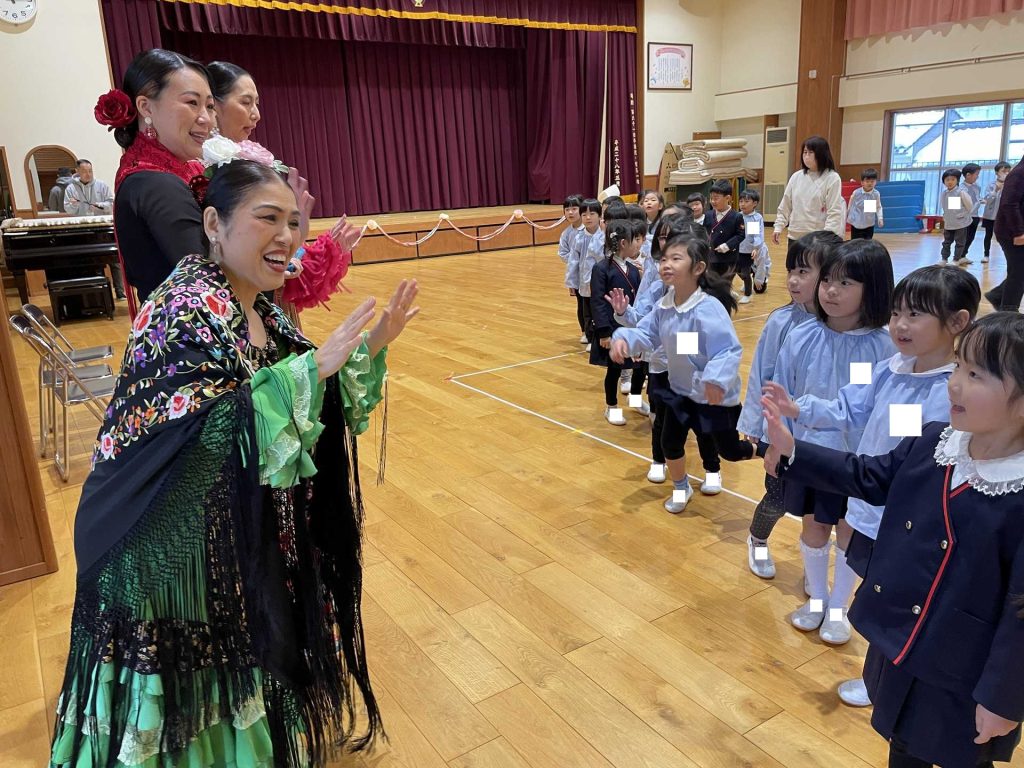 今月のきらきらタイムは、スペインの舞踊「フラメンコ」を見せていただきました!フリルいっぱいのスカートに女の子たちの目をくぎ付け?!手の動き、手拍子、足のリズム、スカートやいろいろな手具(扇子やショールなど)を使って表現していく情熱的な踊りはとっても素敵でした!子ども達も、3拍子のリズムを手と足で表現して参加させていただきました。そして最後のきめポーズの時は「オレー!」の掛け声も。楽しい時間を過ごすことができました。