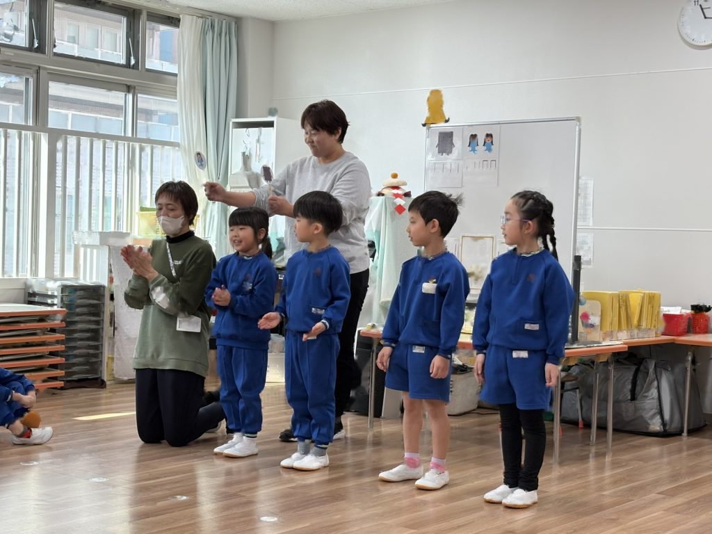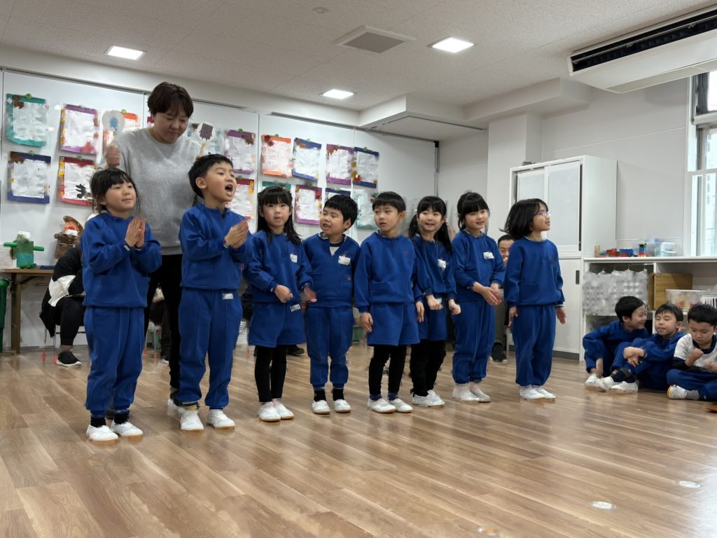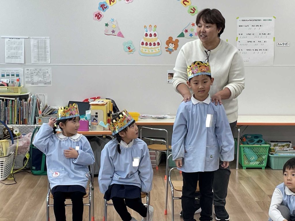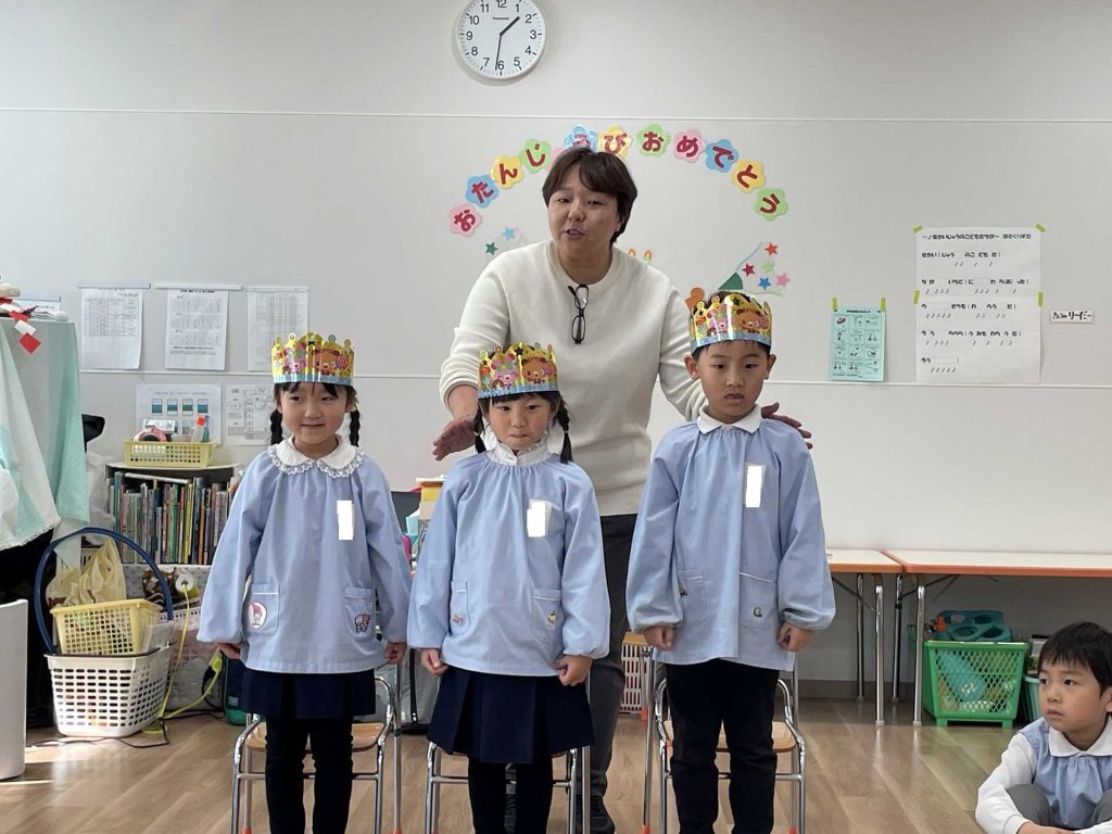 今日は、1月の誕生会を行いました。12月の誕生会に参加できなかったお友達も一緒にお祝いしました。ステージ上での自己紹介も、しっかりばっちり言うことができ、とっても素敵でした!