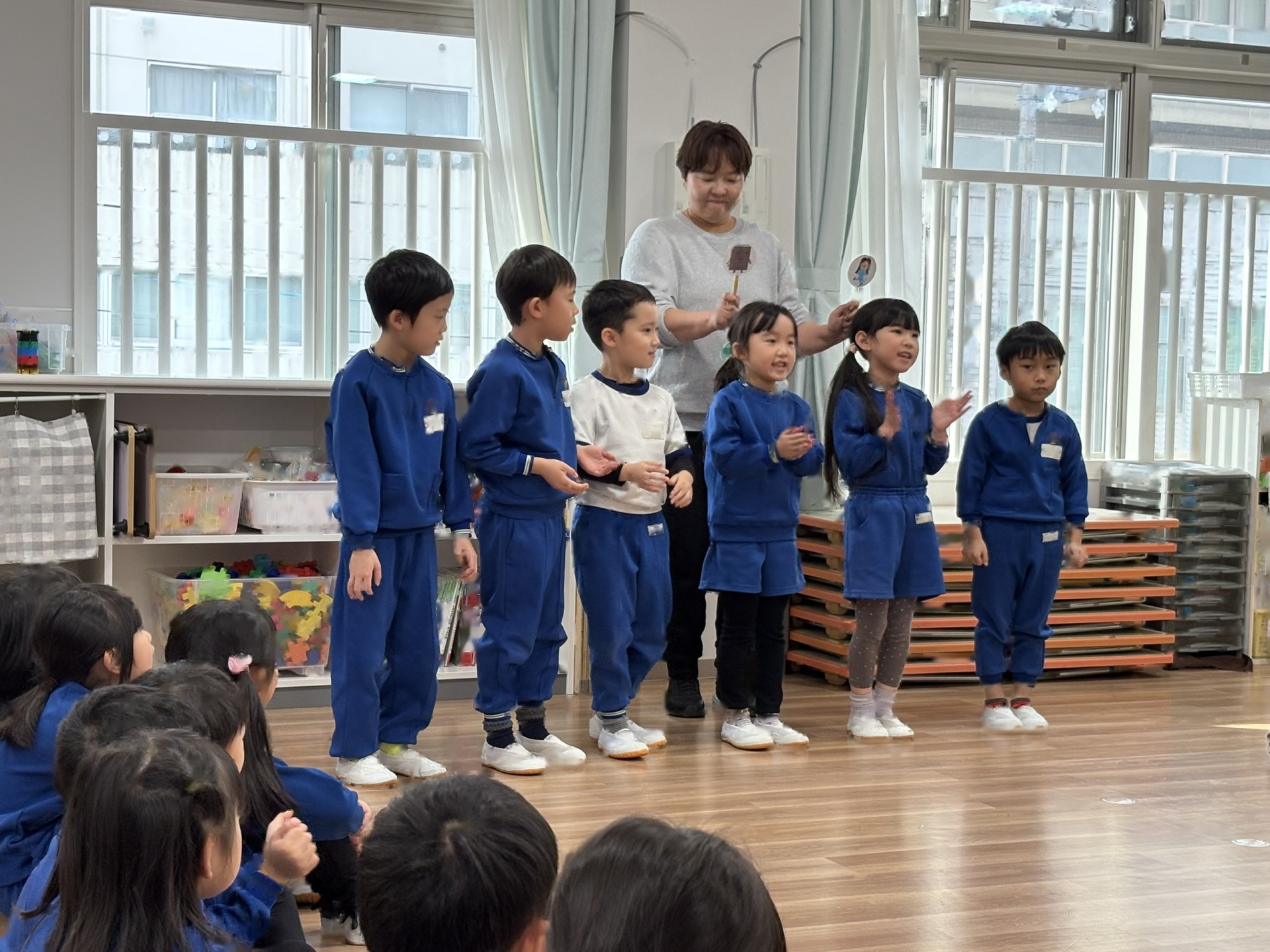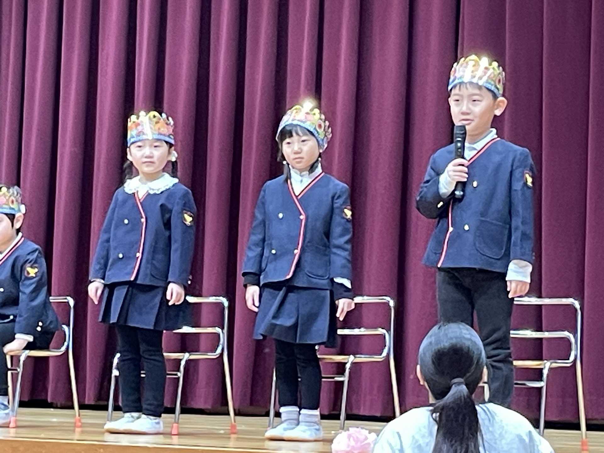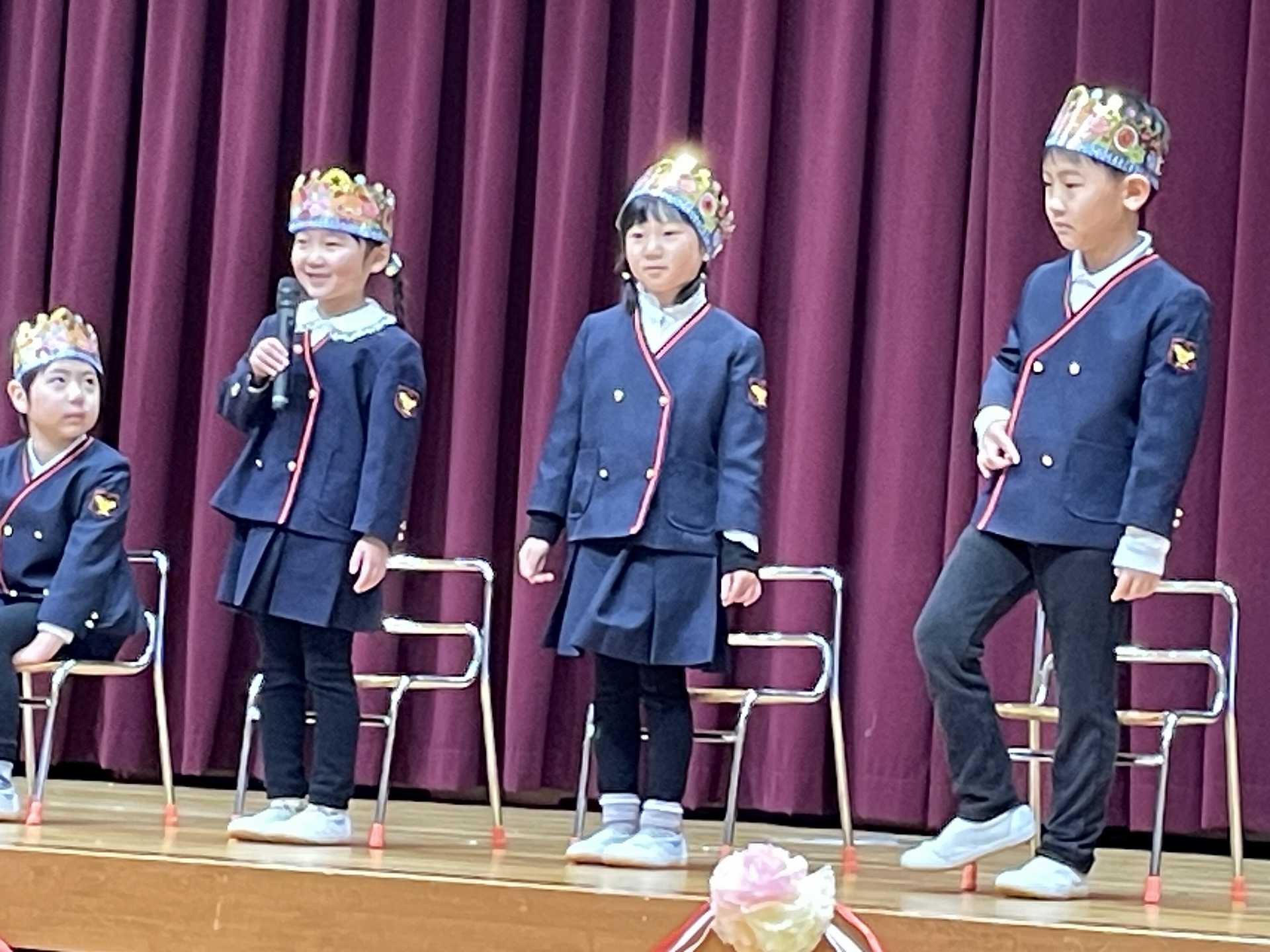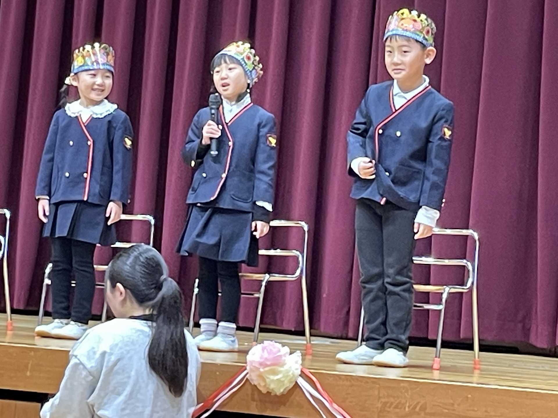 今日は、1月の誕生会を行いました。12月の誕生会に参加できなかったお友達も一緒にお祝いしました。ステージ上での自己紹介も、しっかりばっちり言うことができ、とっても素敵でした!