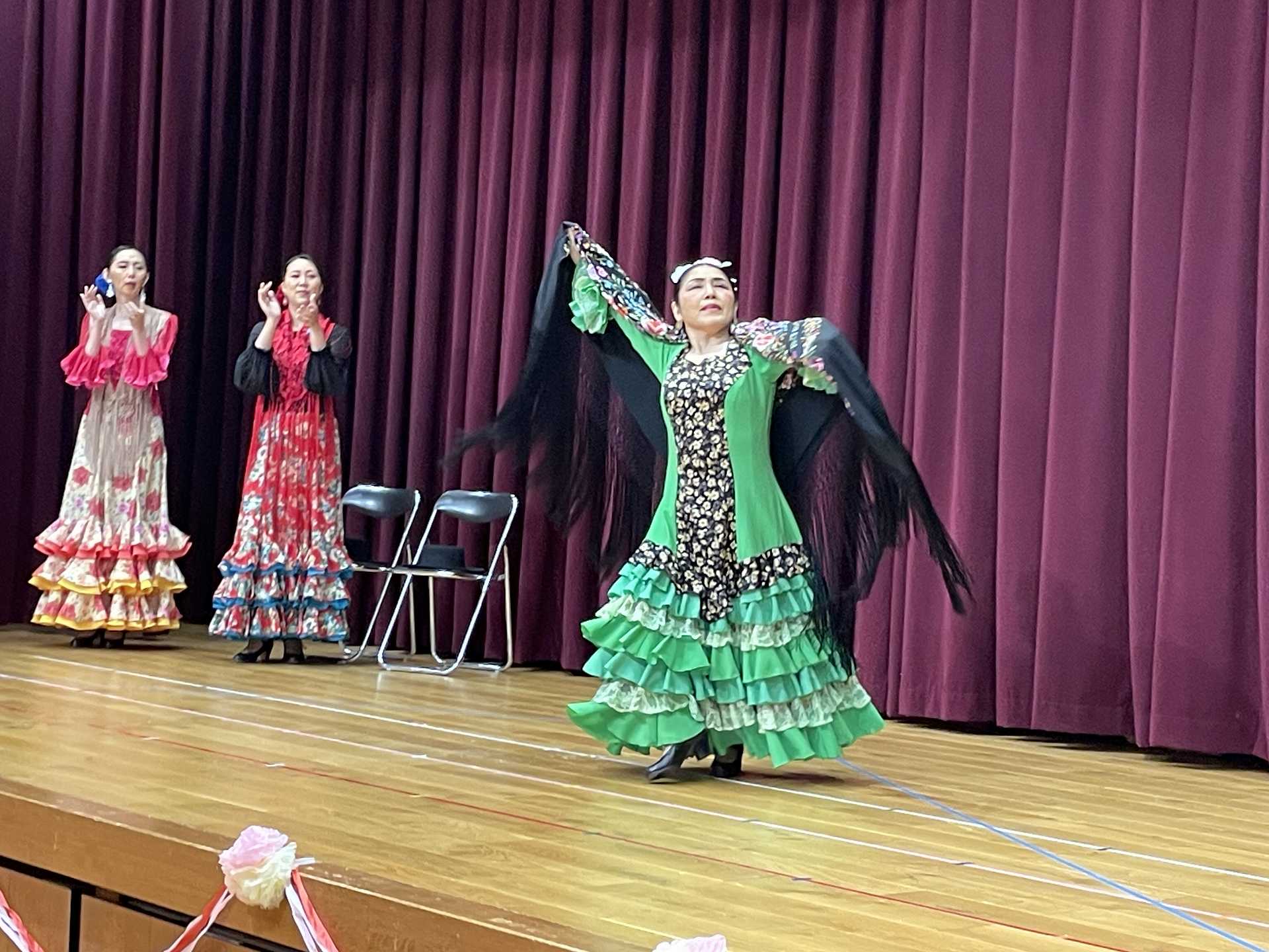 今月のきらきらタイムは、スペインの舞踊「フラメンコ」を見せていただきました!フリルいっぱいのスカートに女の子たちの目をくぎ付け?!手の動き、手拍子、足のリズム、スカートやいろいろな手具(扇子やショールなど)を使って表現していく情熱的な踊りはとっても素敵でした!子ども達も、3拍子のリズムを手と足で表現して参加させていただきました。そして最後のきめポーズの時は「オレー!」の掛け声も。楽しい時間を過ごすことができました。