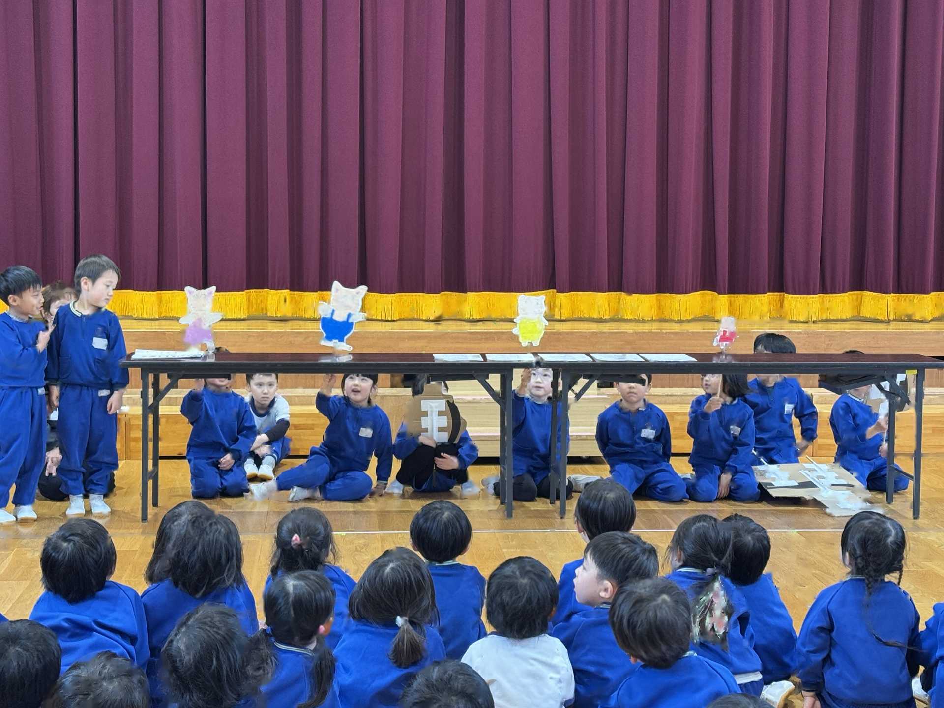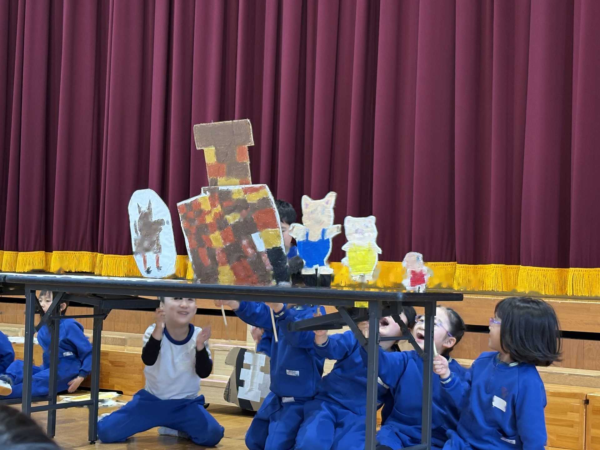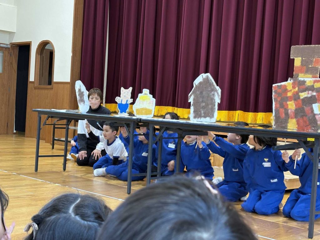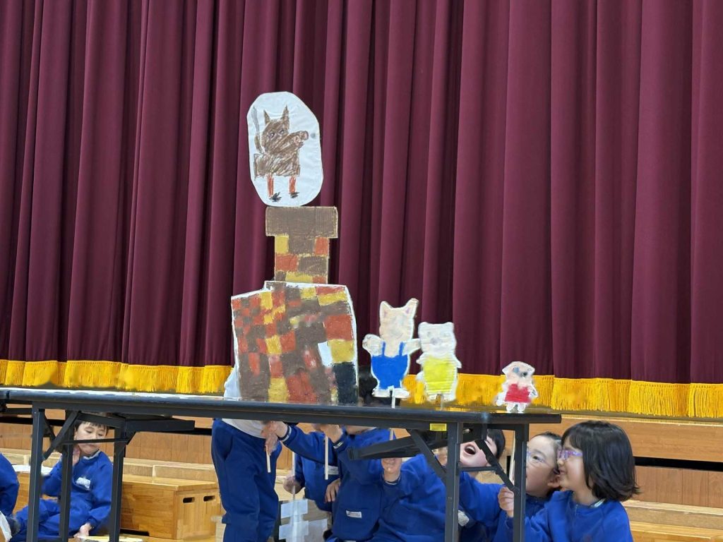 次は「三匹のこぶた」のペープサートのはじまりはじまり・・・年長組の子ども達が作ったかわいいペープサートにとても興味津々で、おおかみと一緒にフ―!!と息を吹いたり、おおかみから逃げる場面ではハラハラしたり・・・と三匹のこぶたの世界に入り込んでいました。