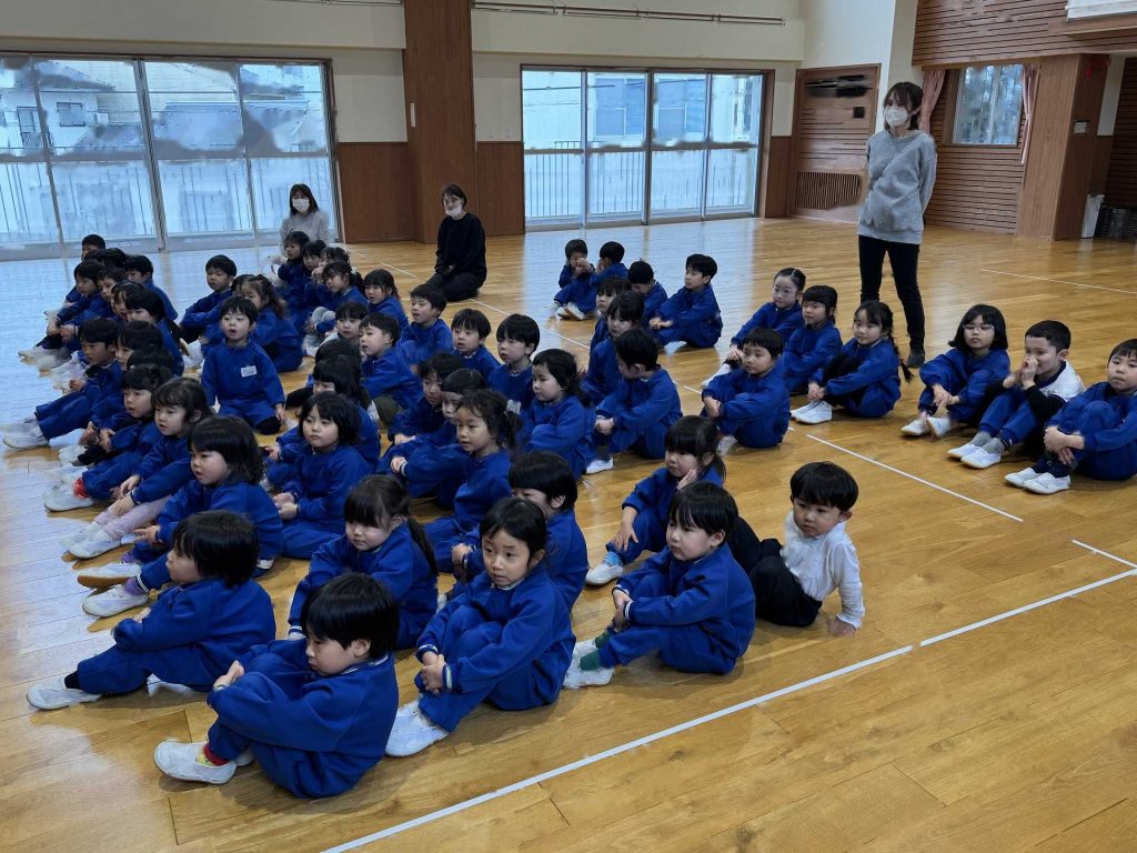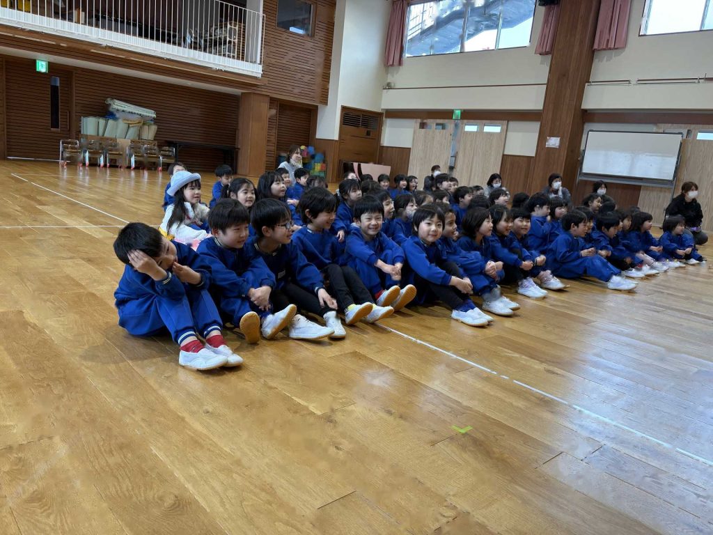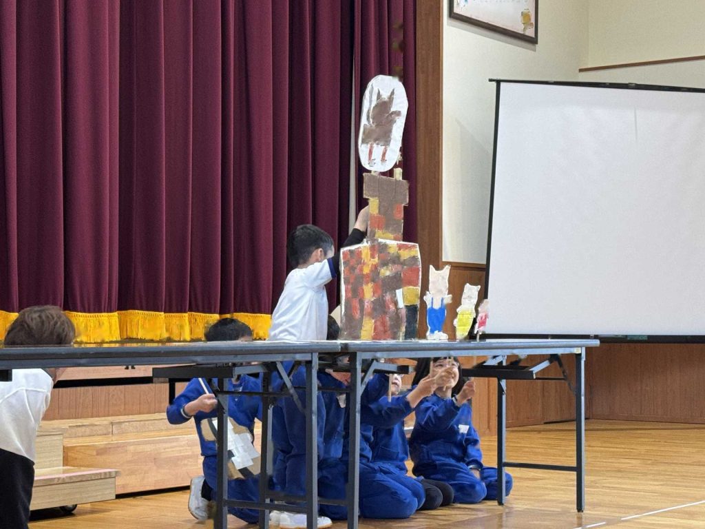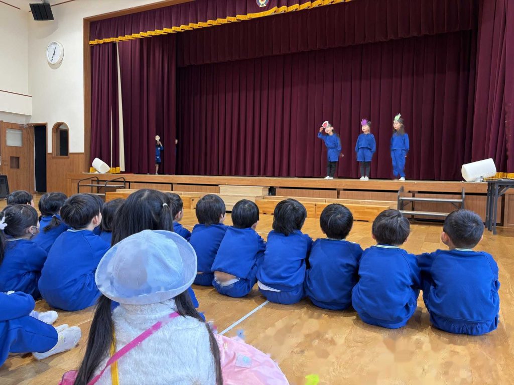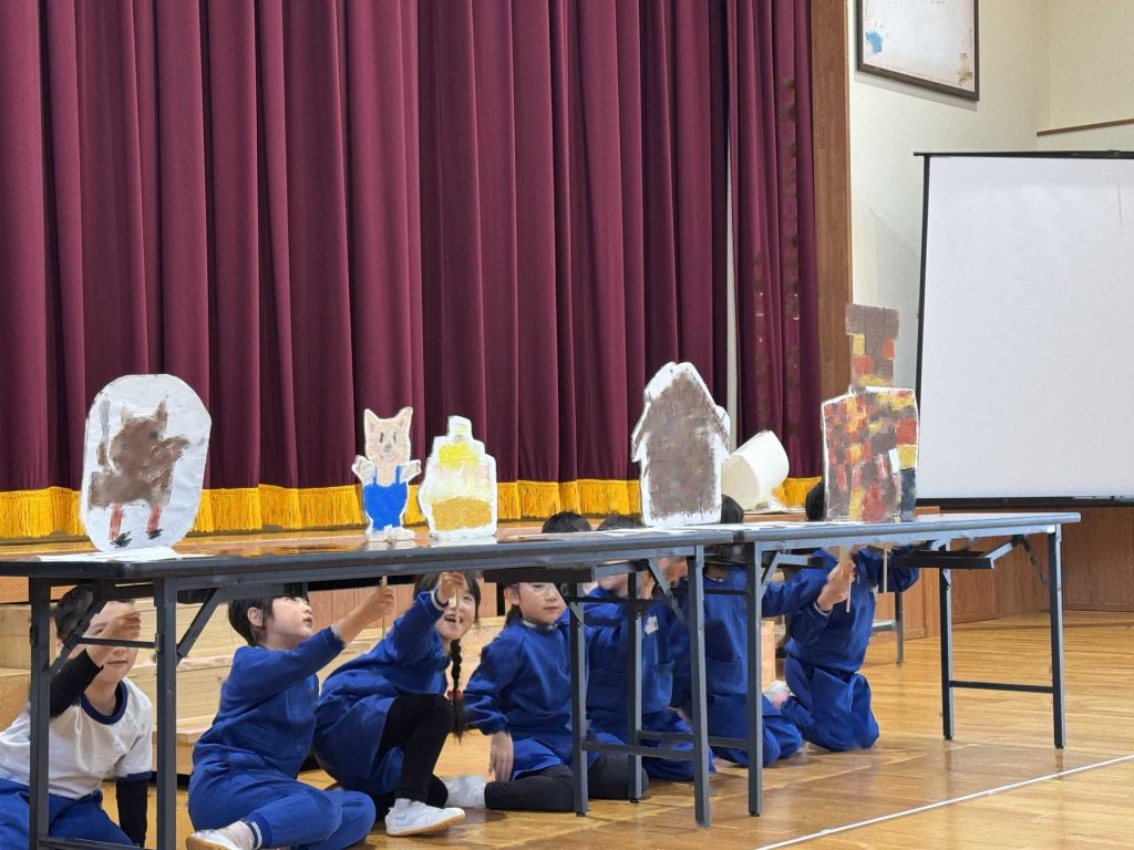 次は「三匹のこぶた」のペープサートのはじまりはじまり・・・年長組の子ども達が作ったかわいいペープサートにとても興味津々で、おおかみと一緒にフ―!!と息を吹いたり、おおかみから逃げる場面ではハラハラしたり・・・と三匹のこぶたの世界に入り込んでいました。