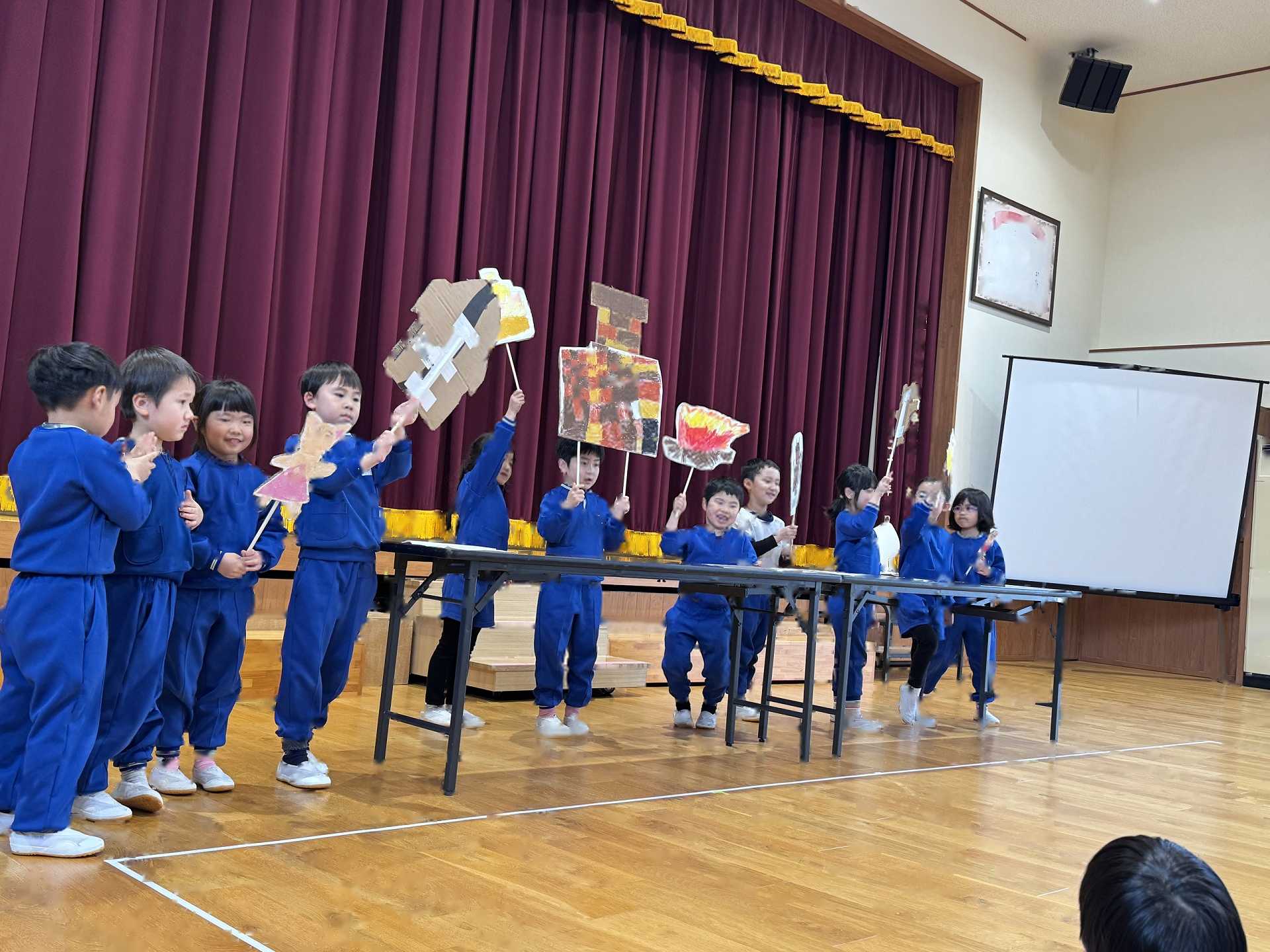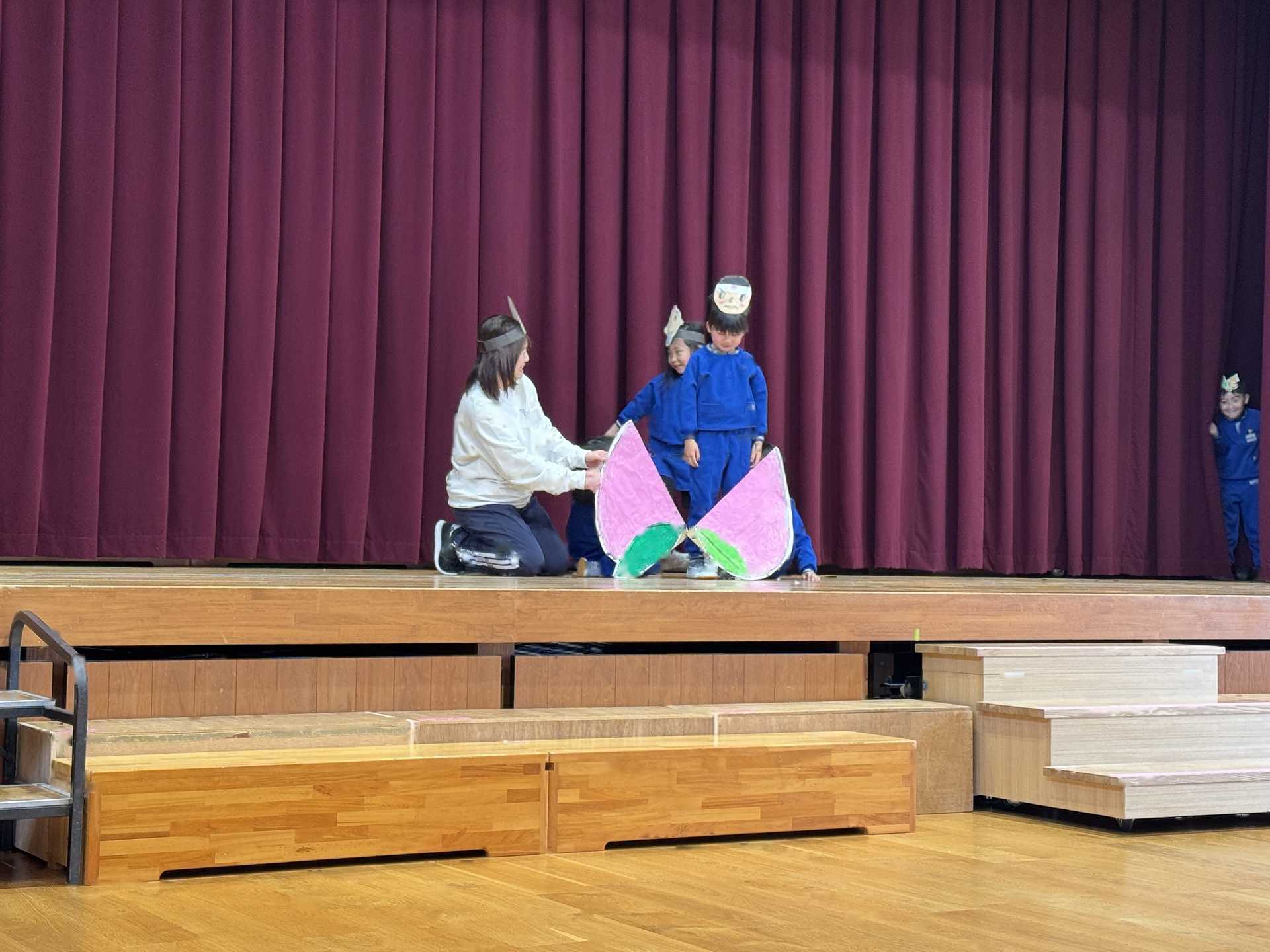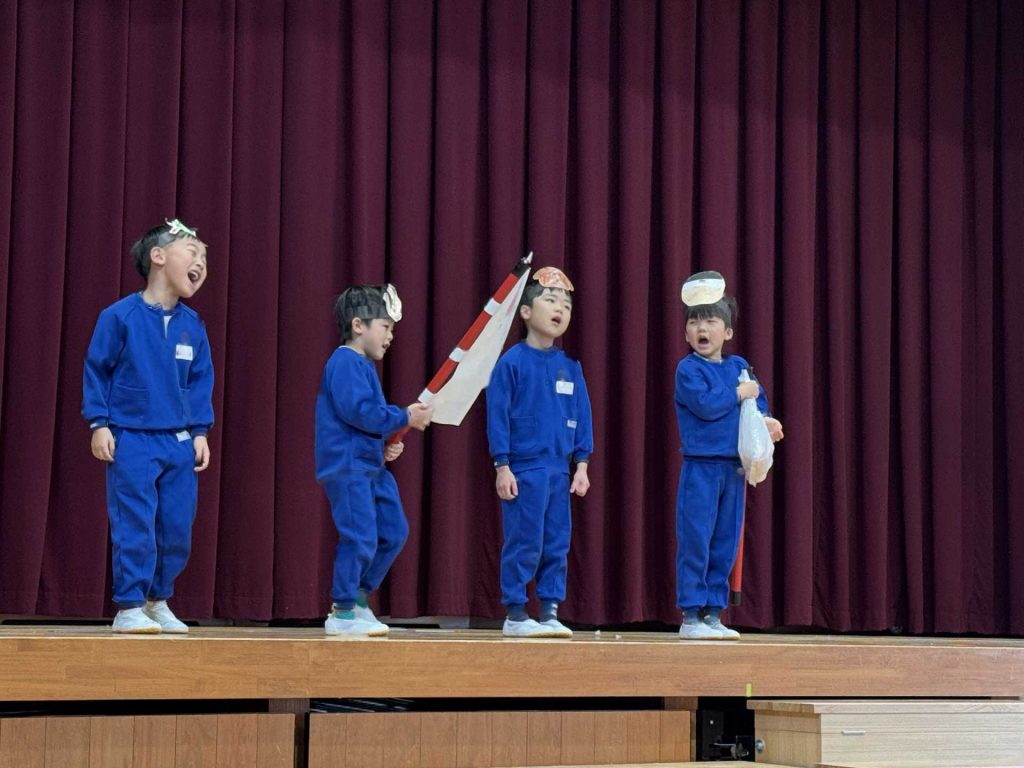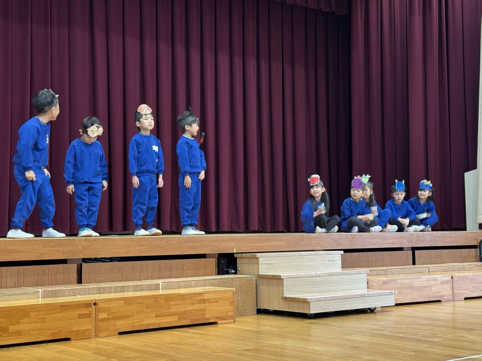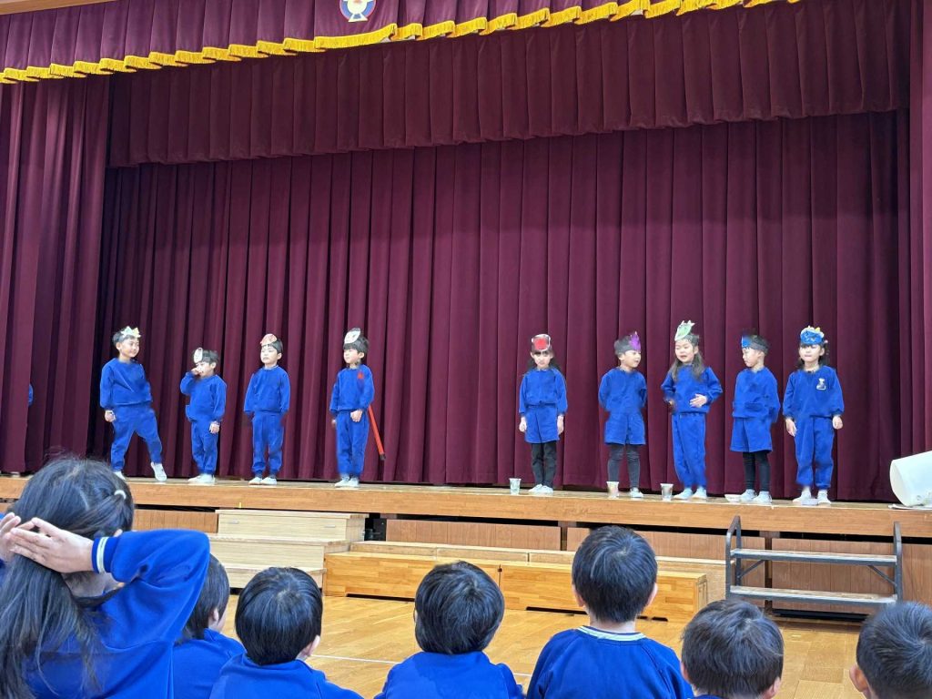 「ももたろう」の劇のはじまりはじまり・・・!桃がどんぶらこどんぶらこと流れてきたり・・・鬼退治ではまさかのかめはめ波が!!年長さんがそれぞれの役になりきる姿に興味津々で、時には笑ったりしながら劇に夢中になっていました☆