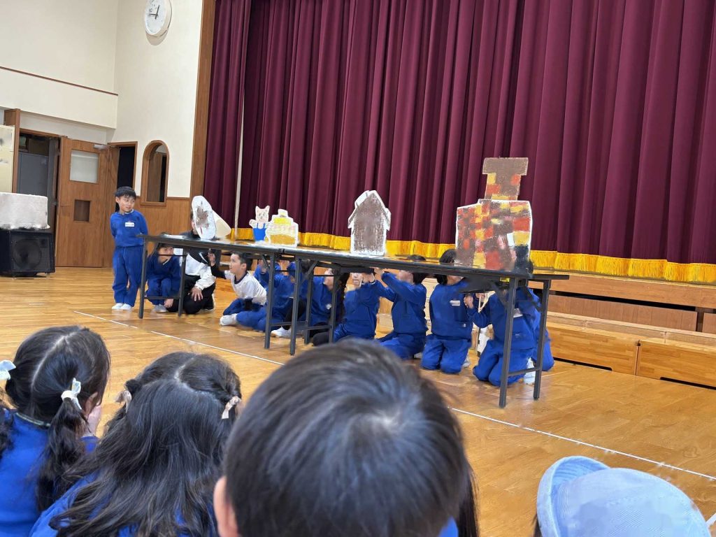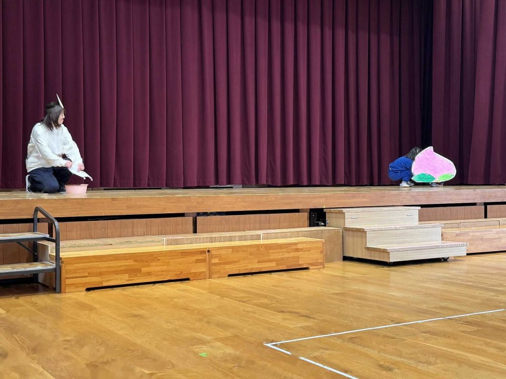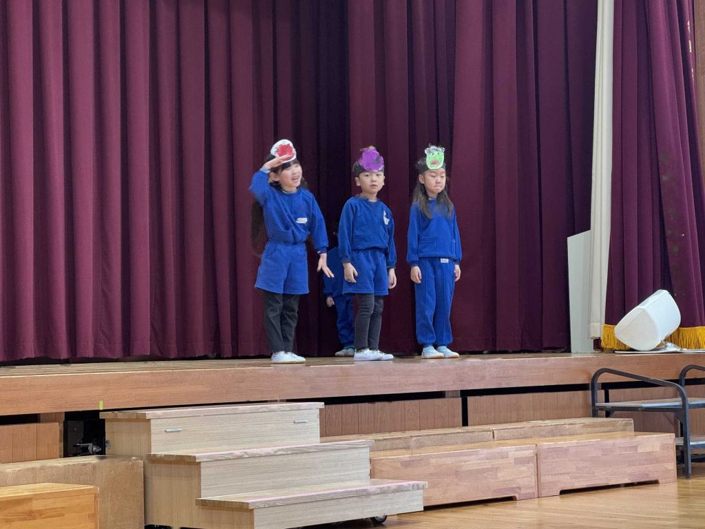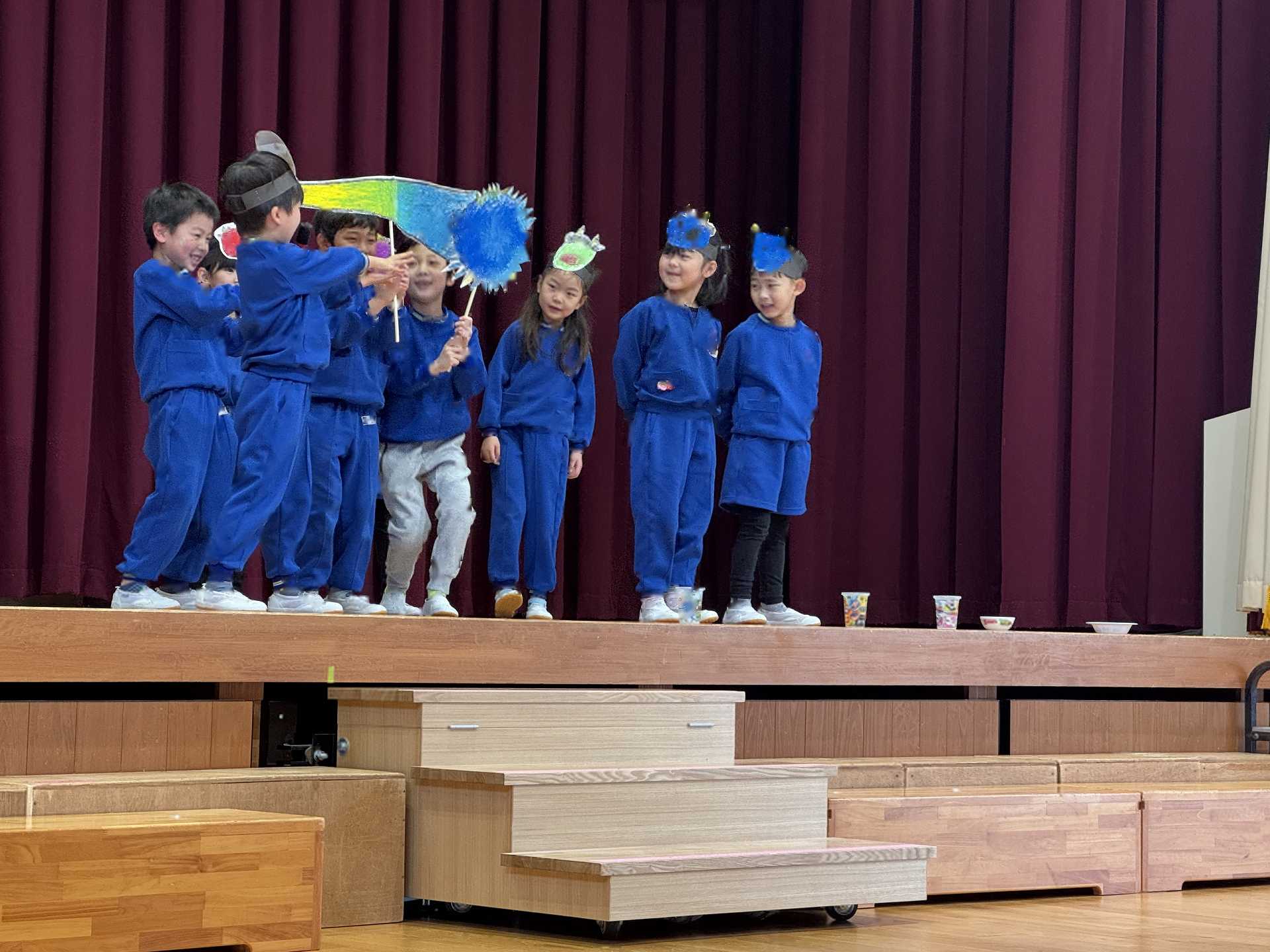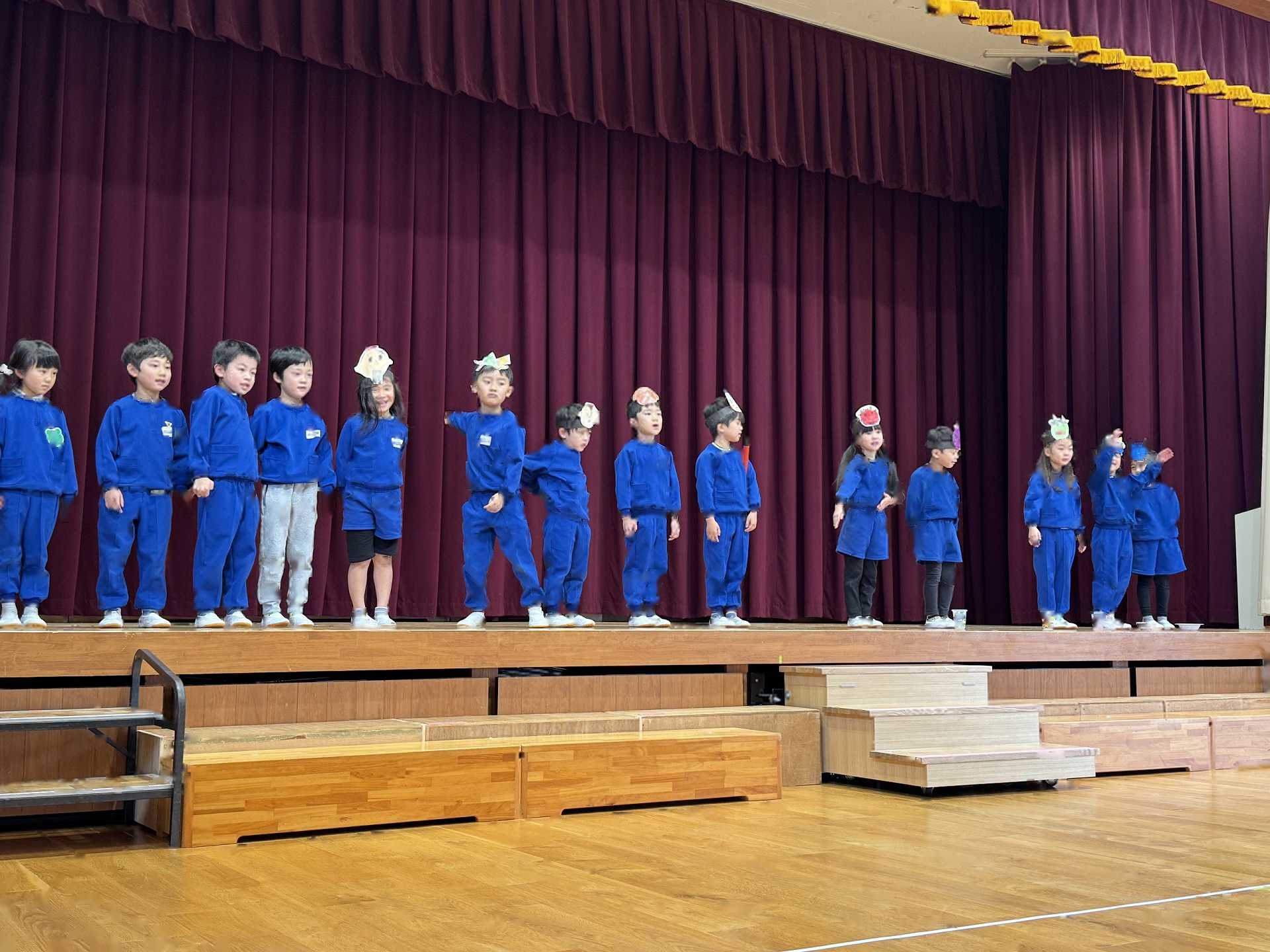 「ももたろう」の劇のはじまりはじまり・・・!桃がどんぶらこどんぶらこと流れてきたり・・・鬼退治ではまさかのかめはめ波が!!年長さんがそれぞれの役になりきる姿に興味津々で、時には笑ったりしながら劇に夢中になっていました☆