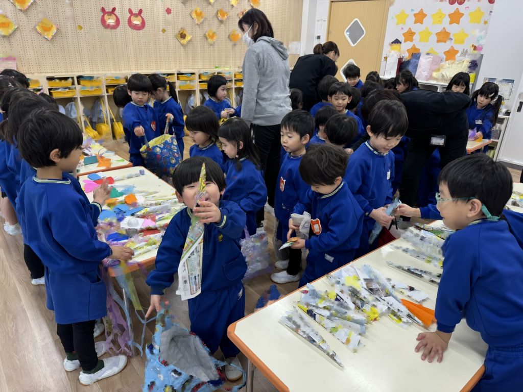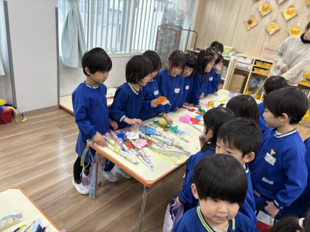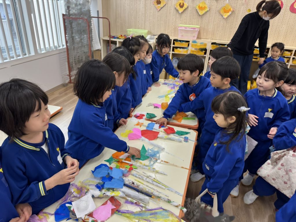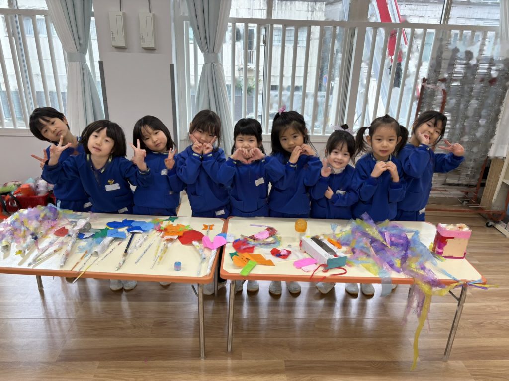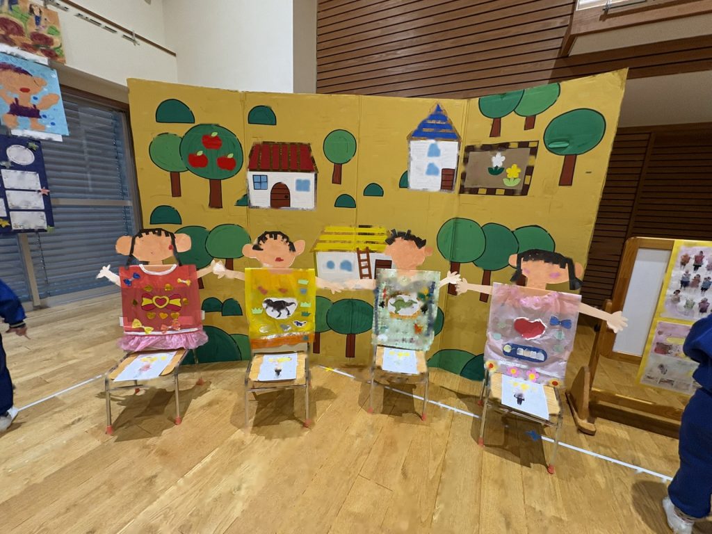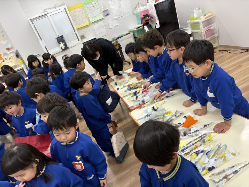 作品鑑賞をしました。自分で作った作品を紹介し合いながら、他の学年の作品もみんなで見学しました♪「上手だね~」「かわいいね~」と、認め合う姿もみられましたよ~★