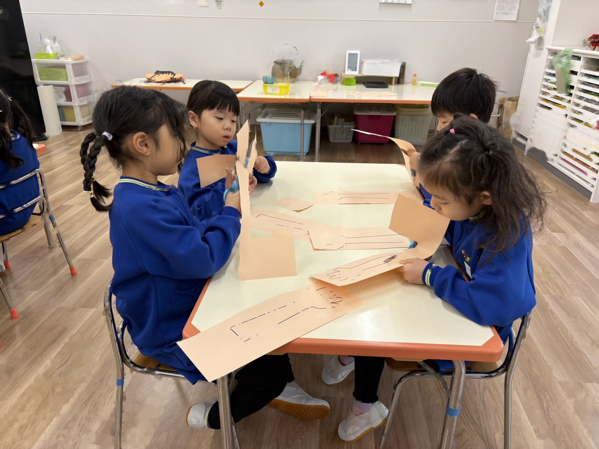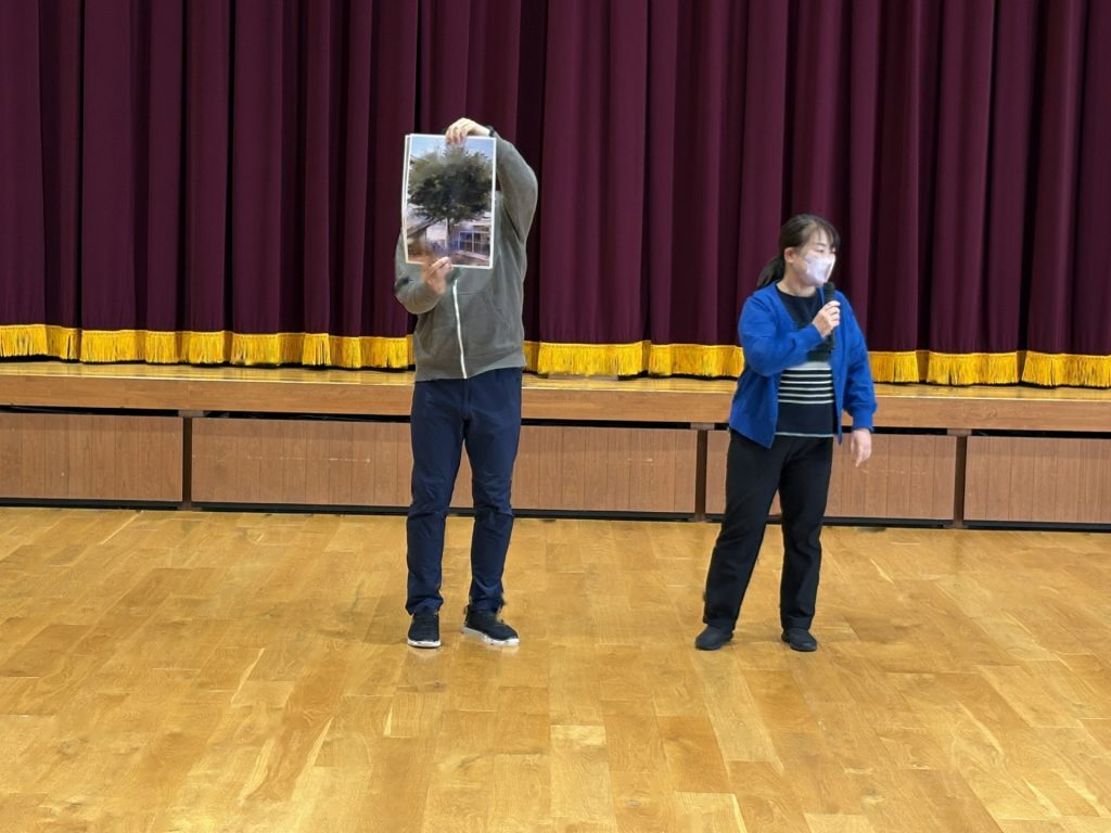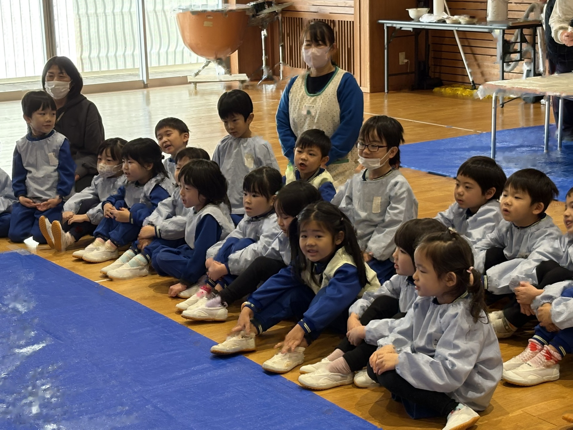 園長先生のお話をききました。1学期でおわかれした”けやきの木”が積み木になって生まれ変わったことも教えてもらいました(またみんなで遊んでみたいと思います)