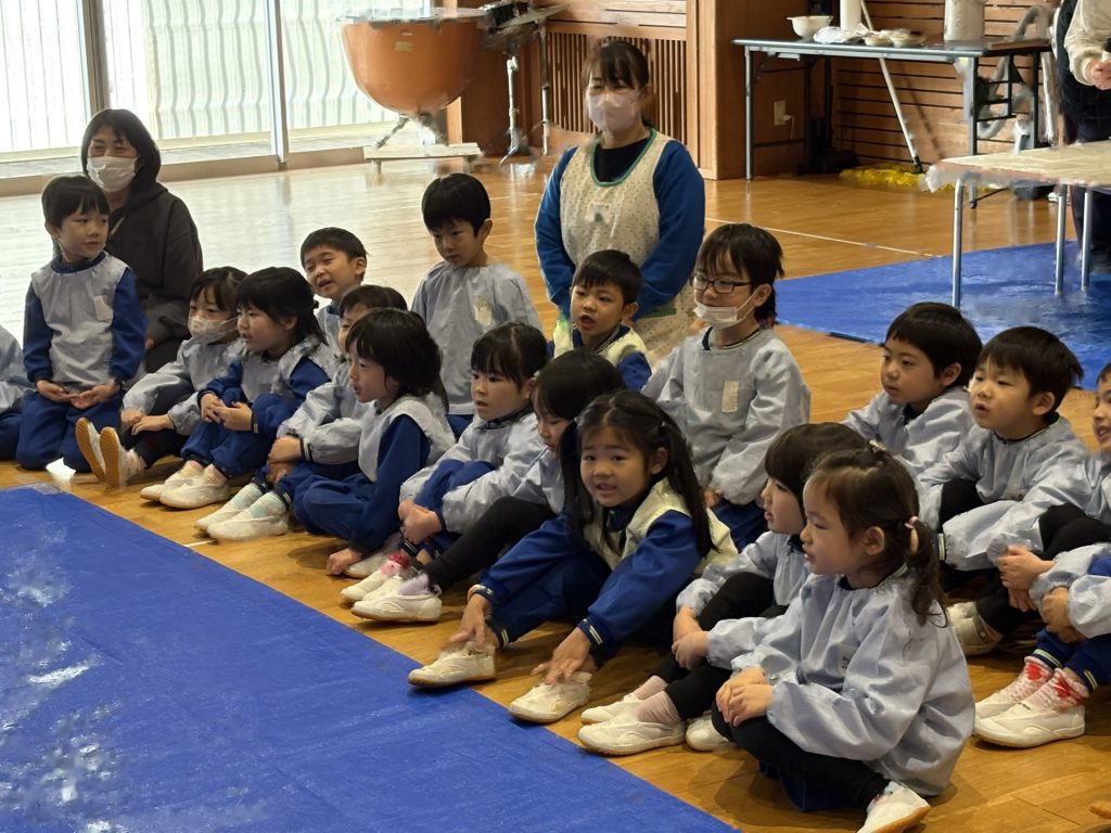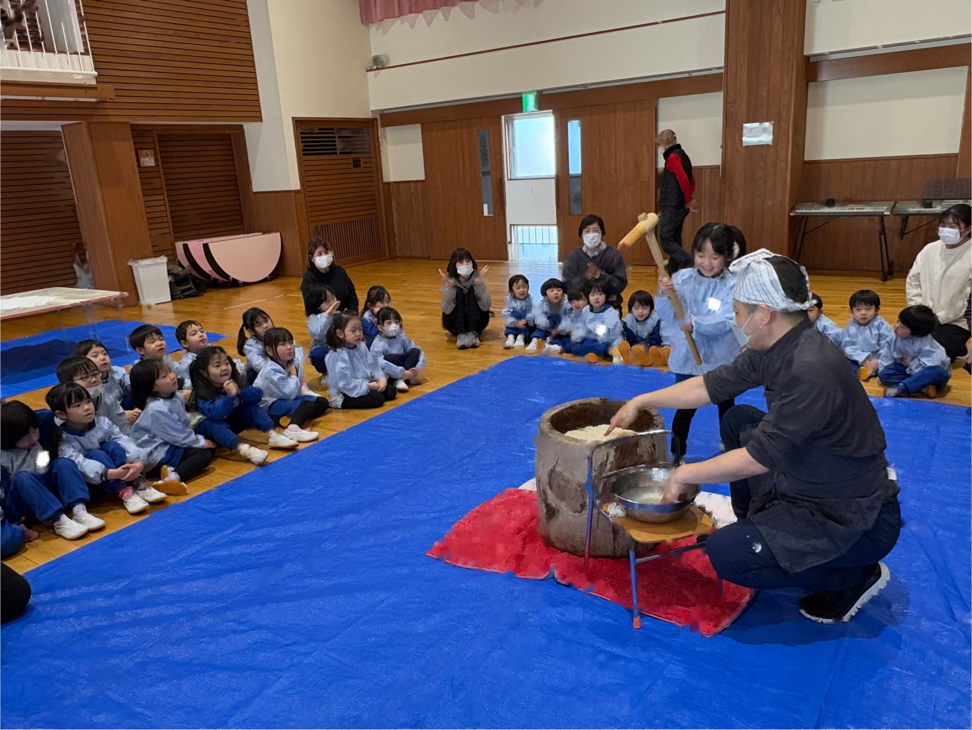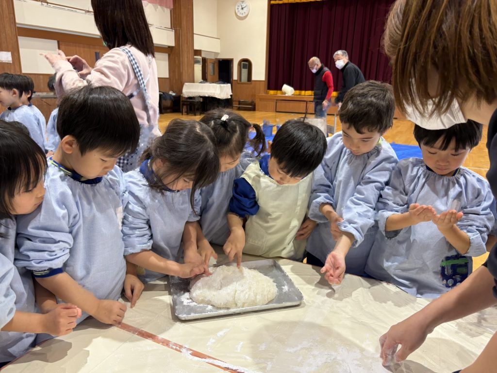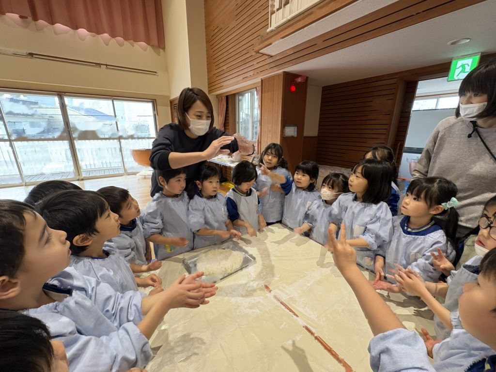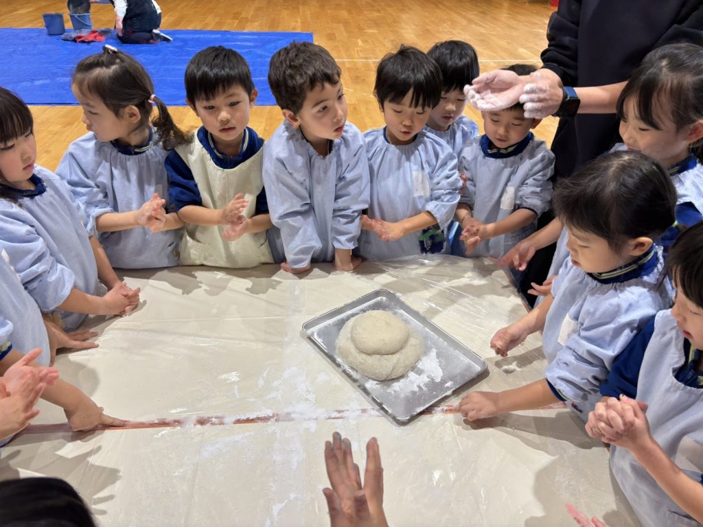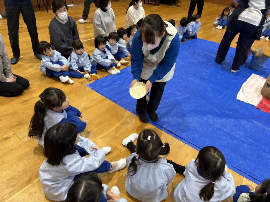 2学期末から楽しみにしていた”もちつき”蒸しあがったお米を見せてもらったり、バスの先生や年長さんがお餅をつく応援をしたりしました。