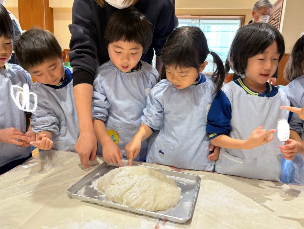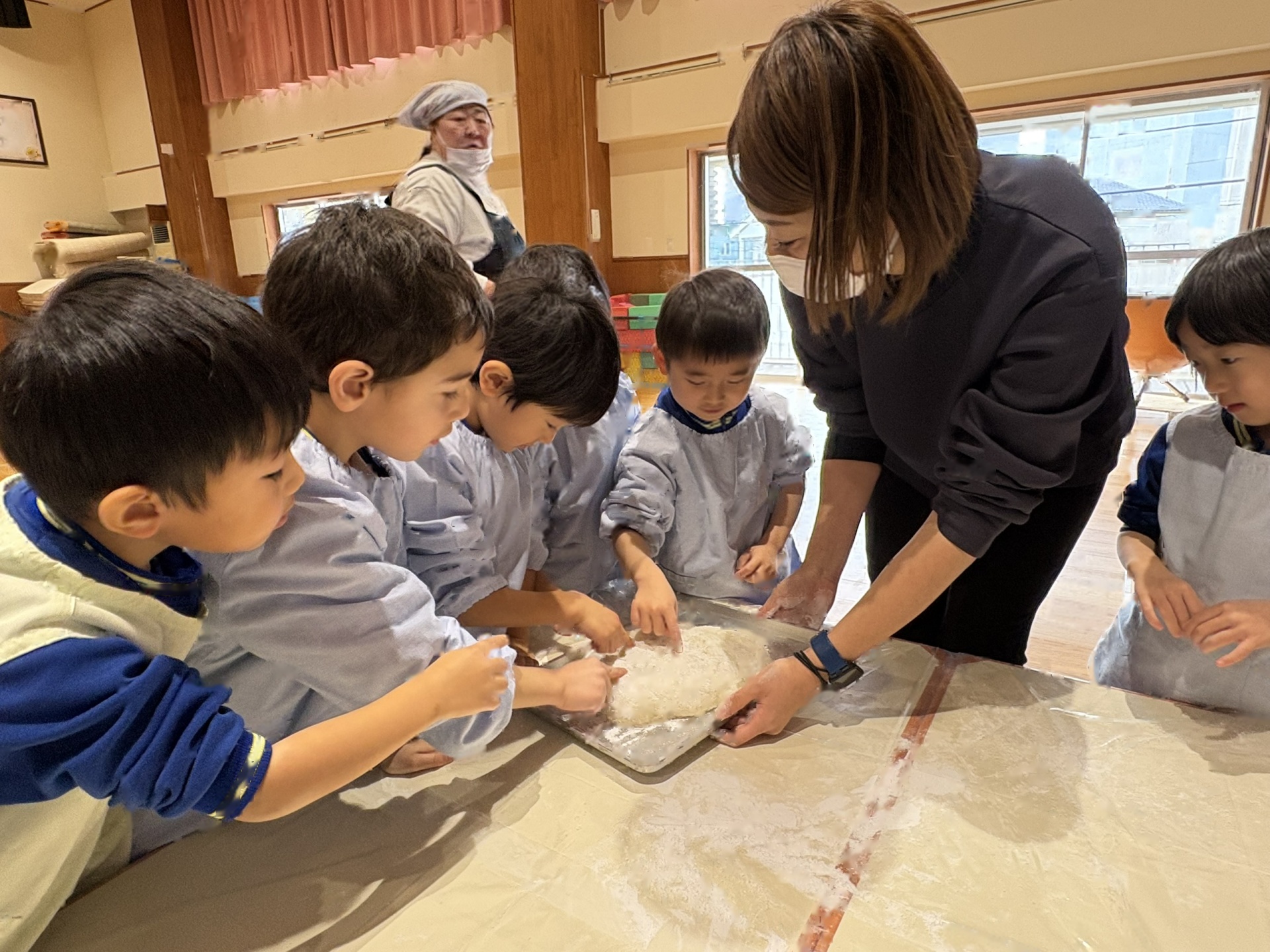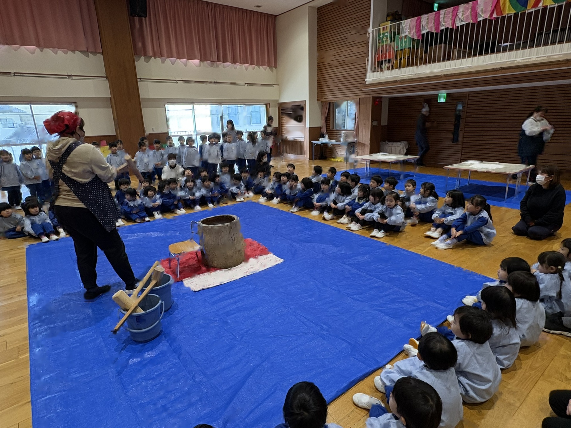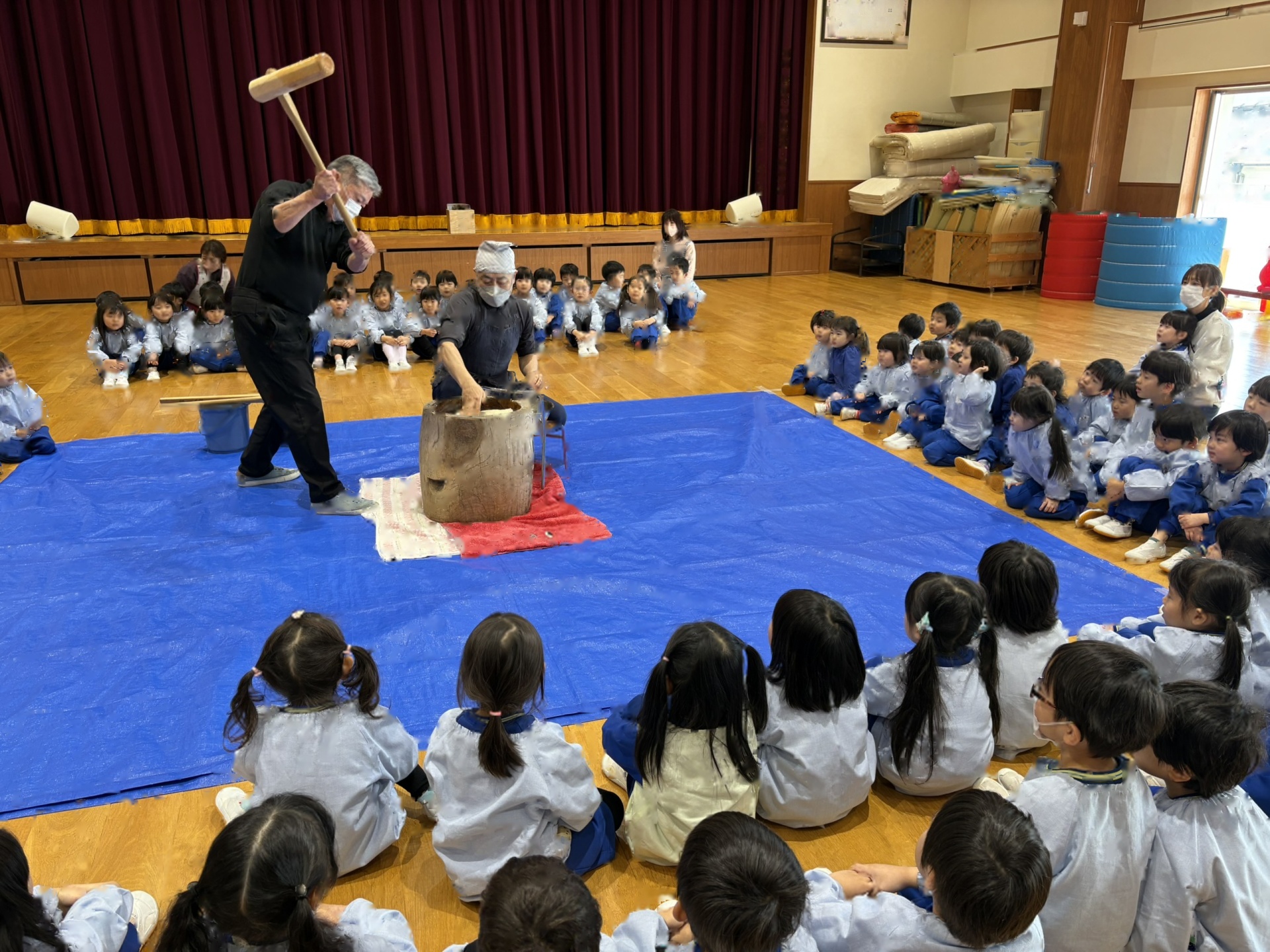 2学期末から楽しみにしていた”もちつき”蒸しあがったお米を見せてもらったり、バスの先生や年長さんがお餅をつく応援をしたりしました。