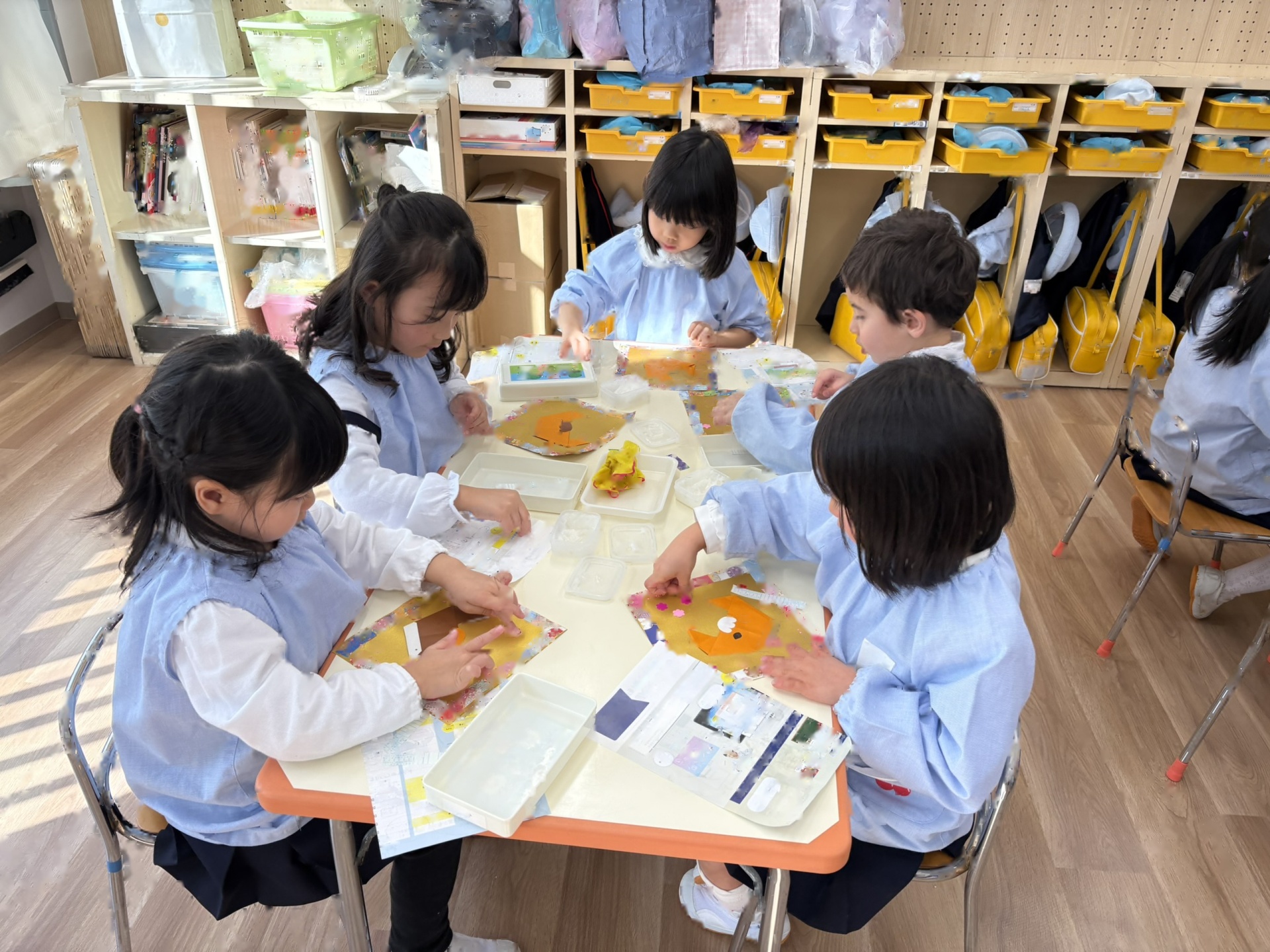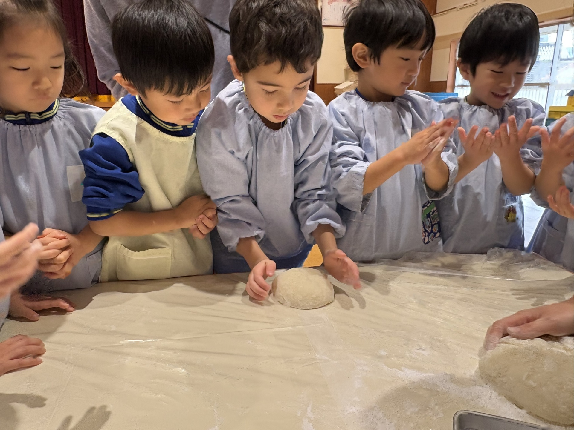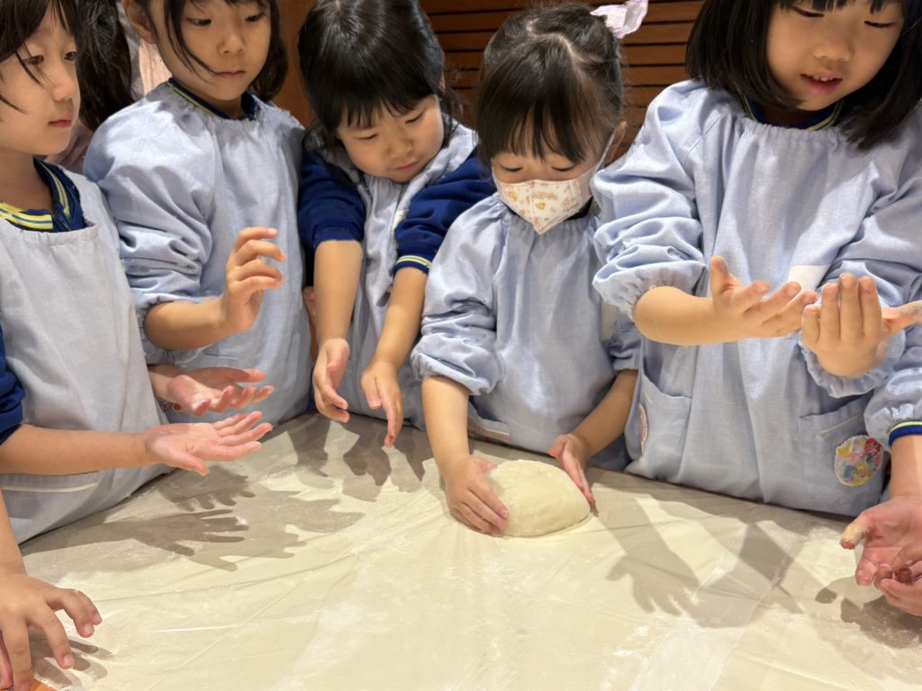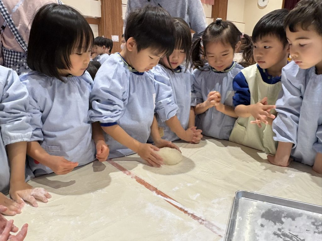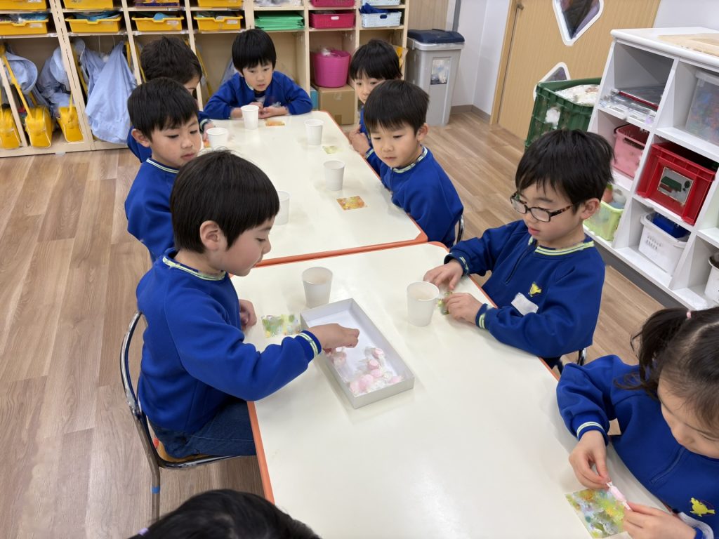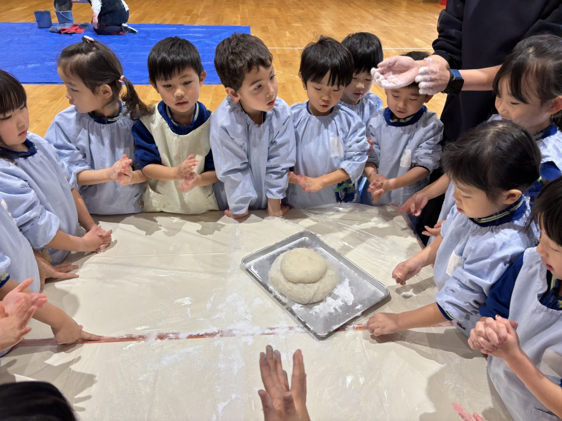 出来あがったお餅をみんなで”鏡もち”にしました。柔らかい感触を感じたり、みんなで丸めたりして楽しく活動しました。(鏡餅は、しばらくのあいだお部屋に展示予定です)