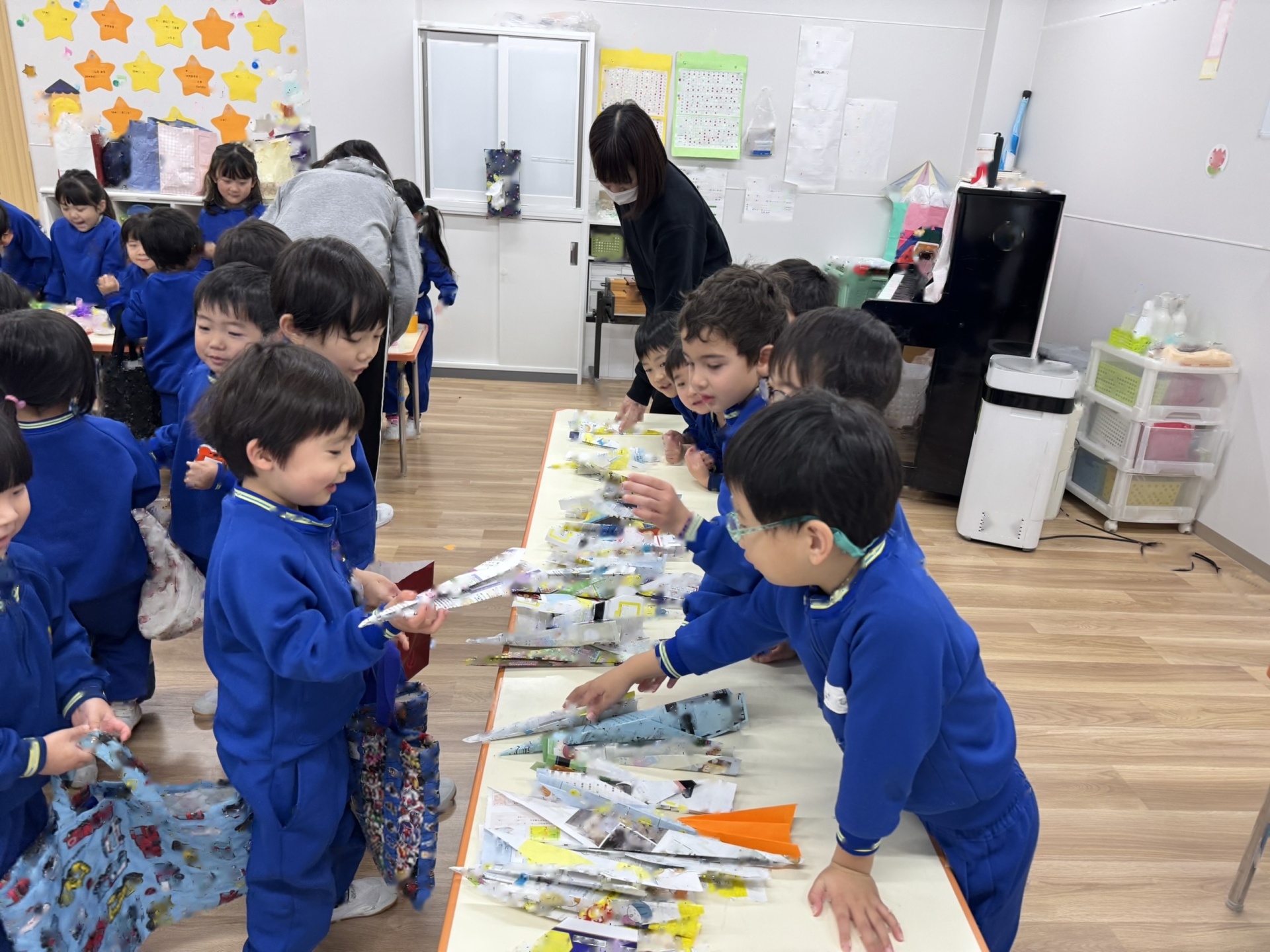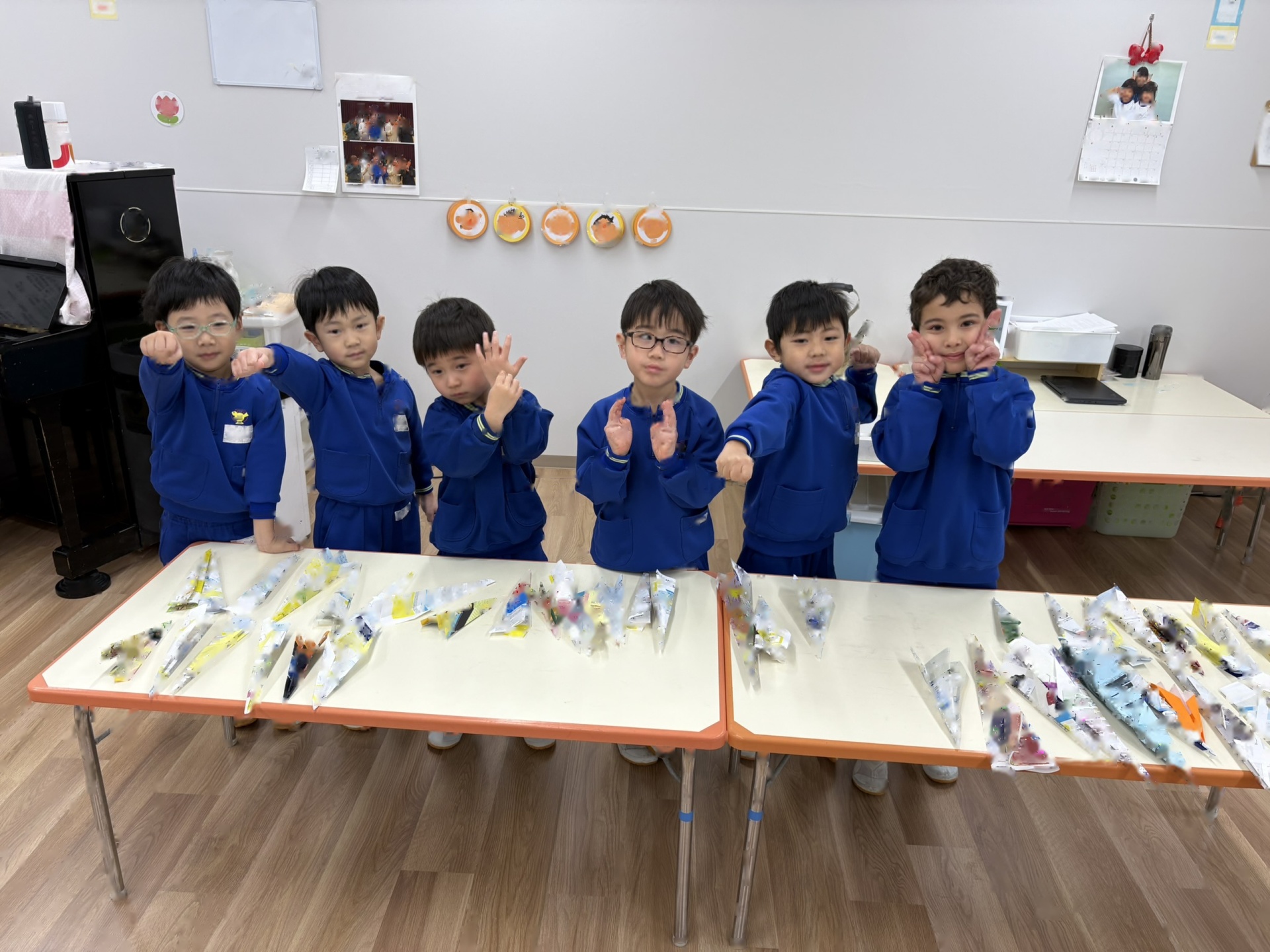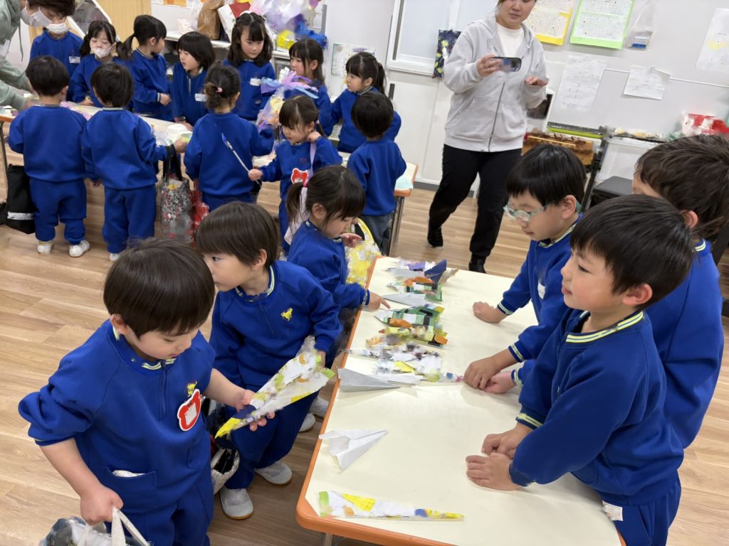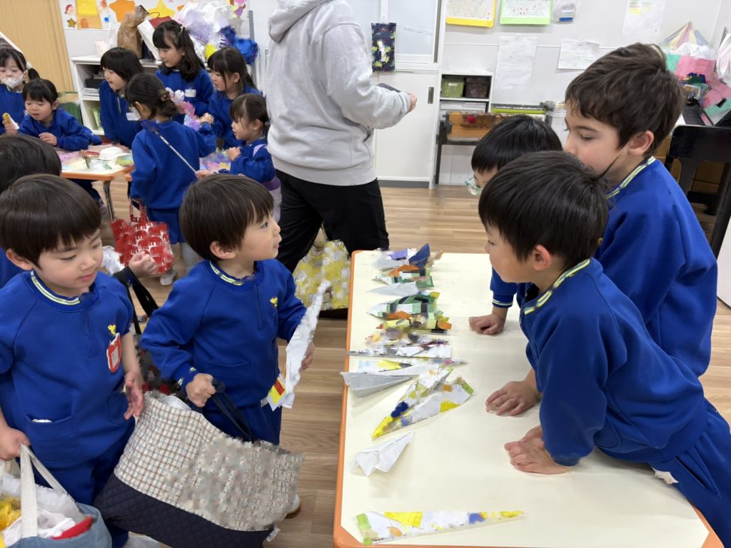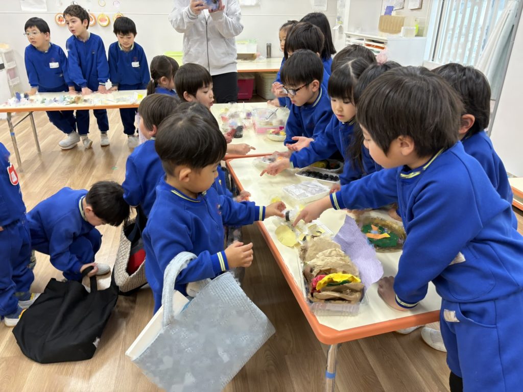 作品鑑賞をしました。自分で作った作品を紹介し合いながら、他の学年の作品もみんなで見学しました♪「上手だね~」「かわいいね~」と、認め合う姿もみられましたよ~★