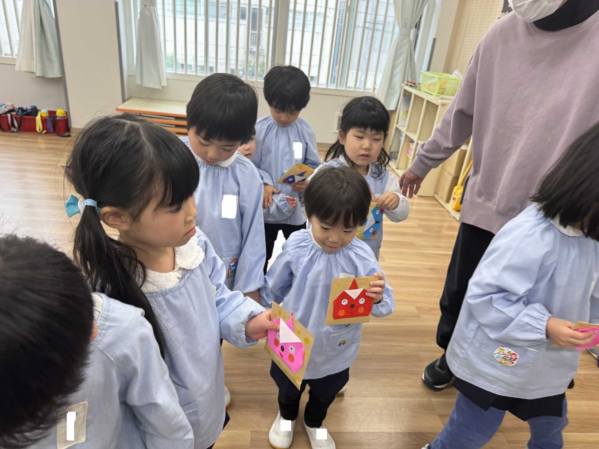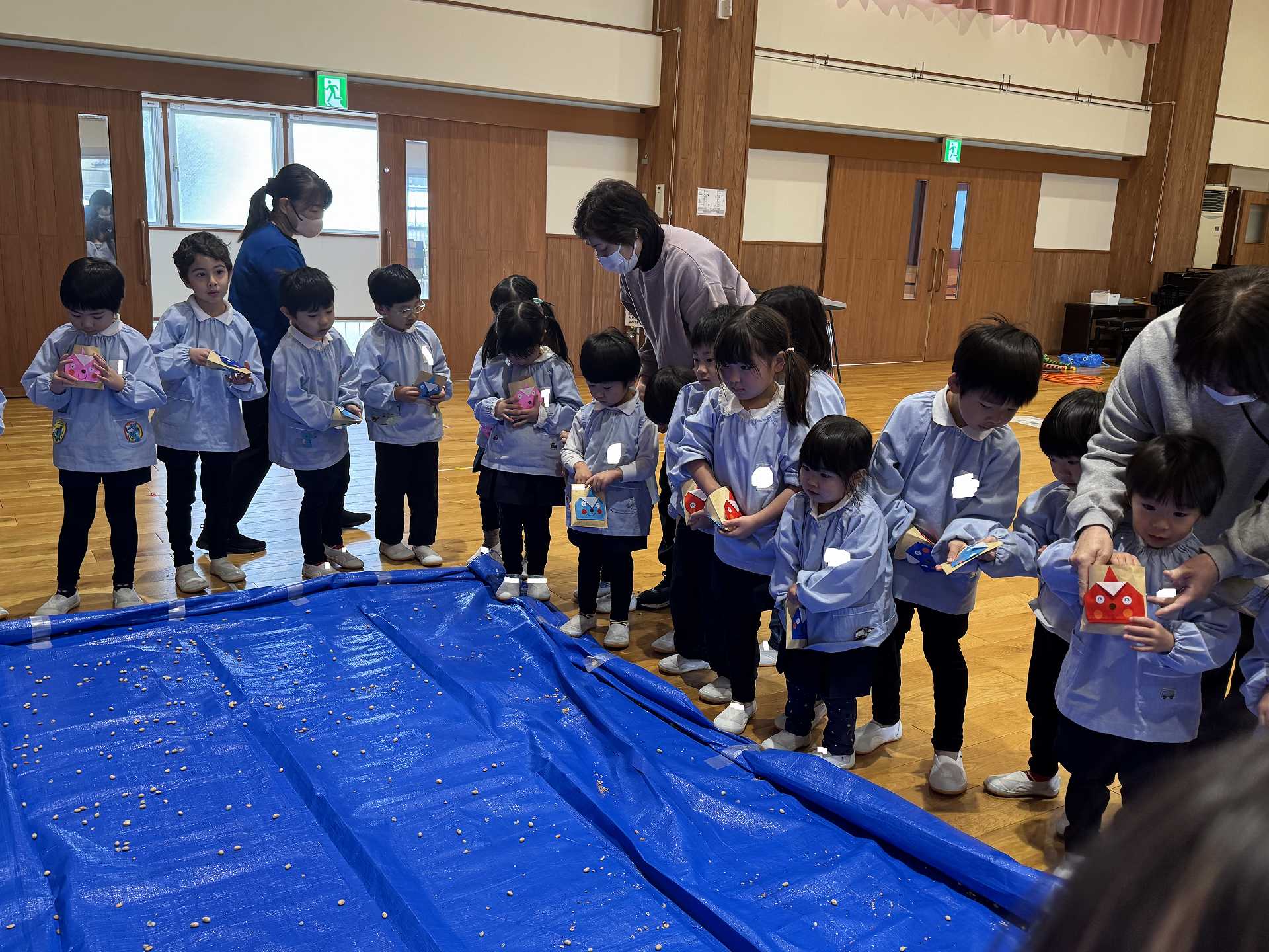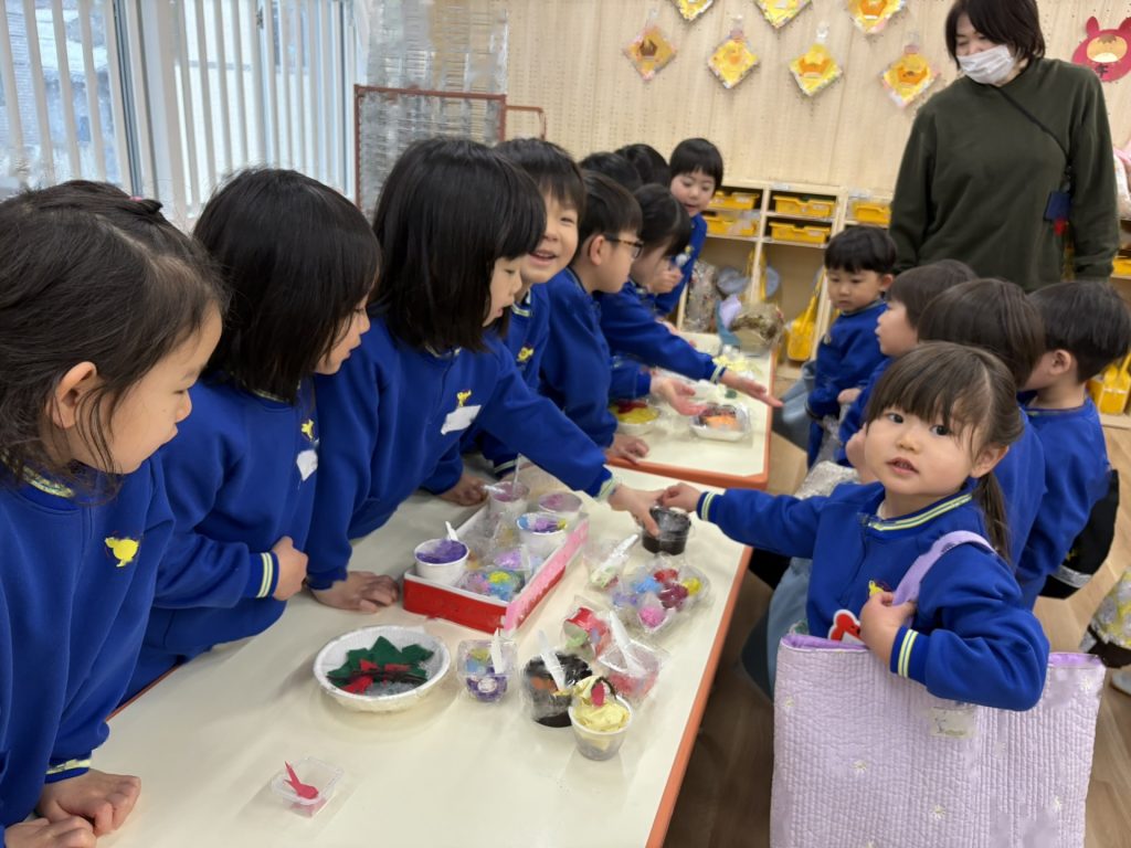豆まきに行く前に・・・年中組さんが作ってくれたかわいいますに豆をもらって・・・いざ!まめまきへ!!
