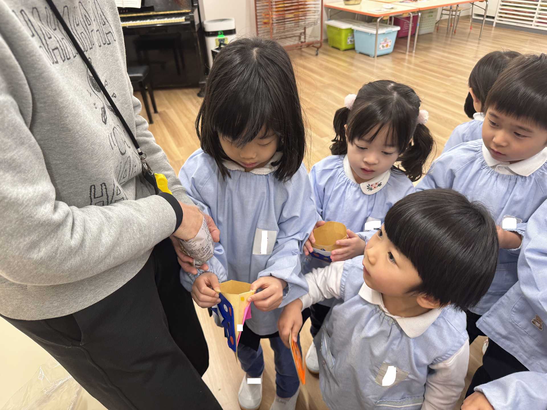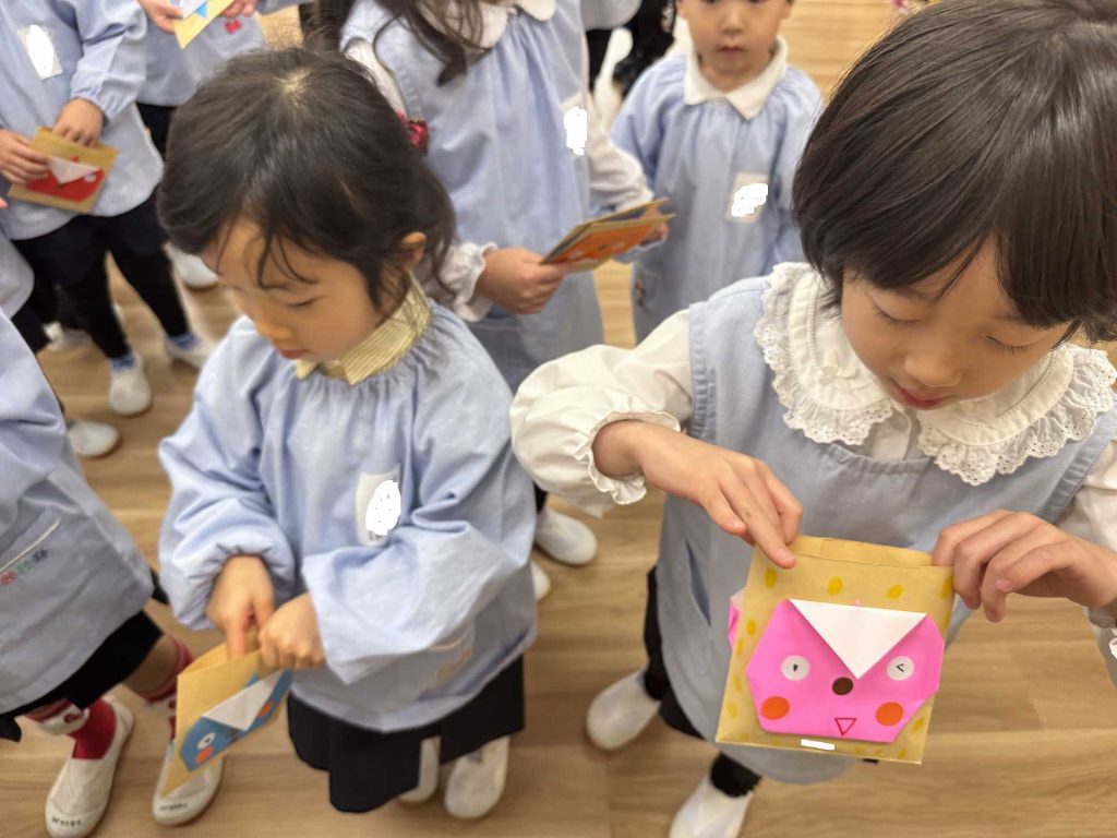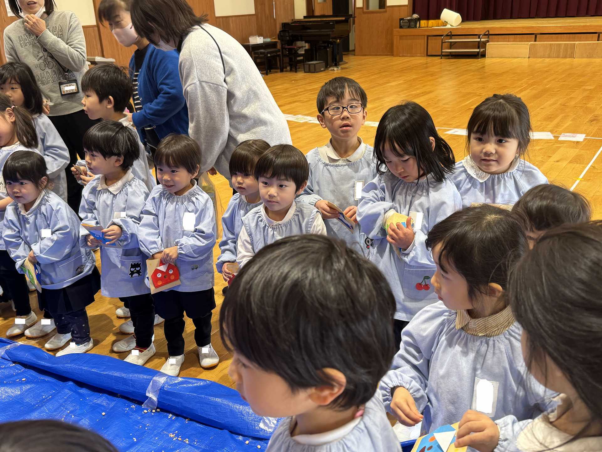 豆まきに行く前に・・・年中組さんが作ってくれたかわいいますに豆をもらって・・・いざ!まめまきへ!!