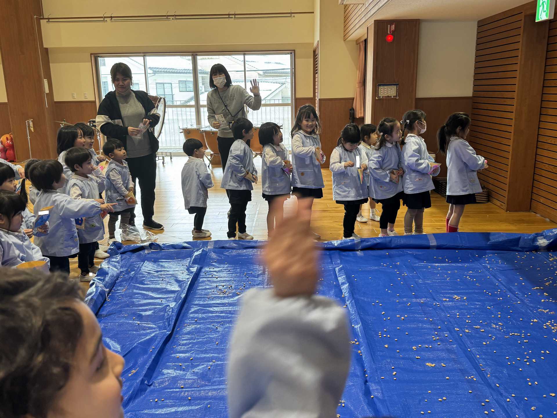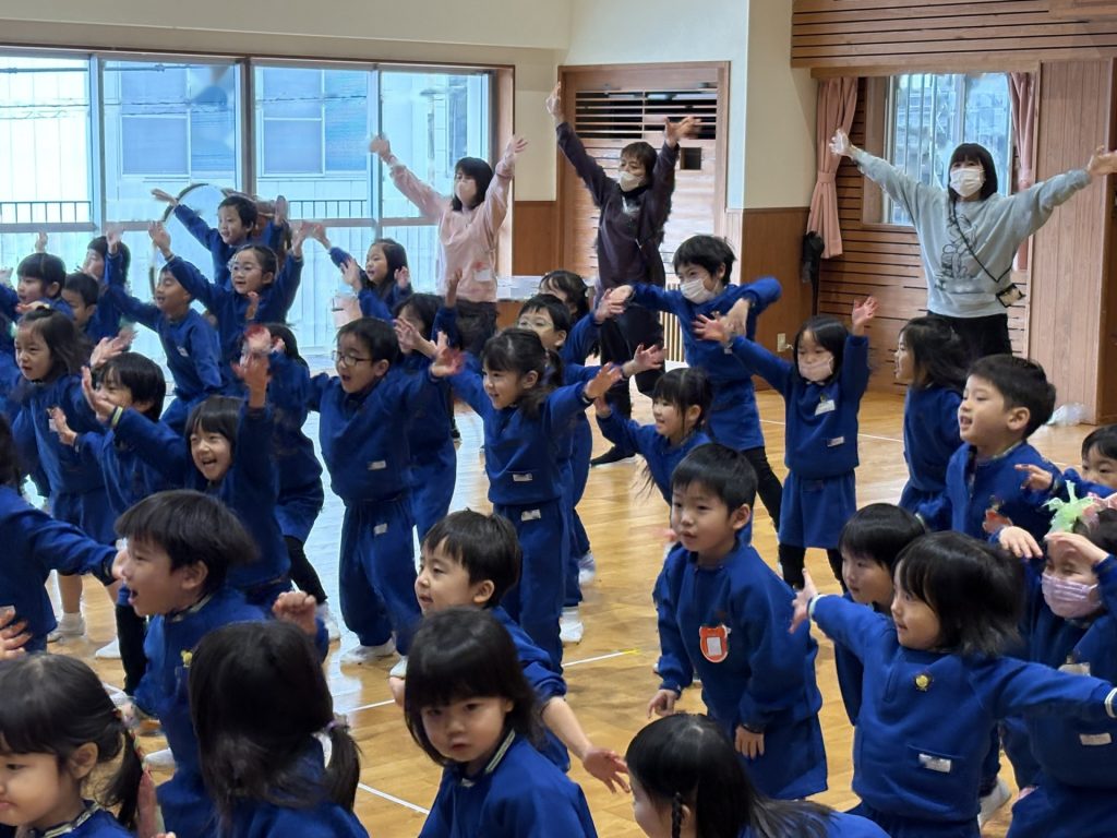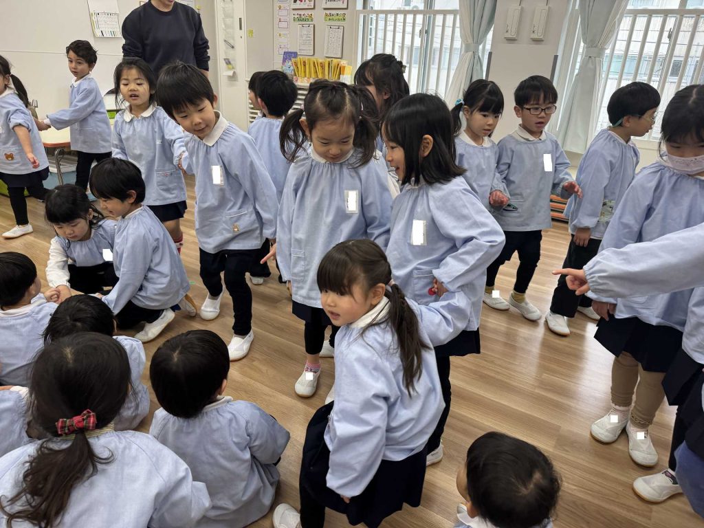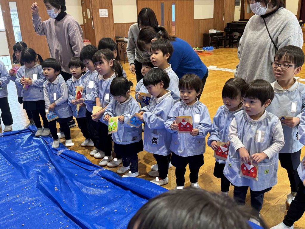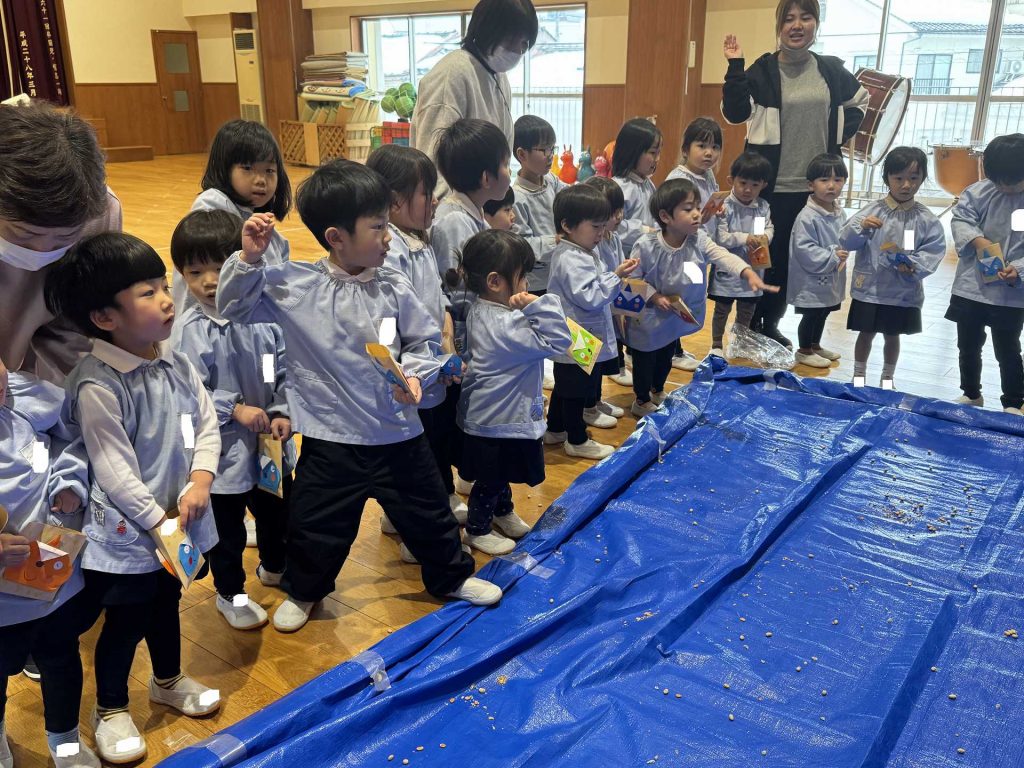 年中組と2歳児で一緒にまめまきを行いました!まめまきを行う前に、一緒に「まめまき」の歌を歌いました♪