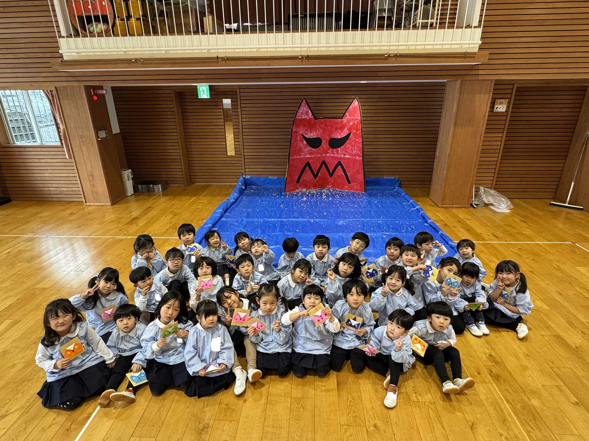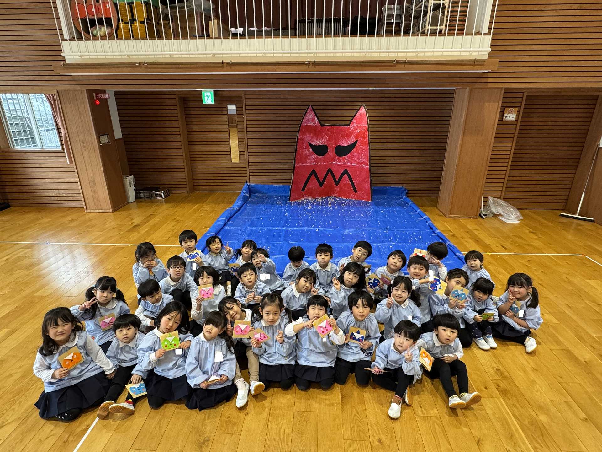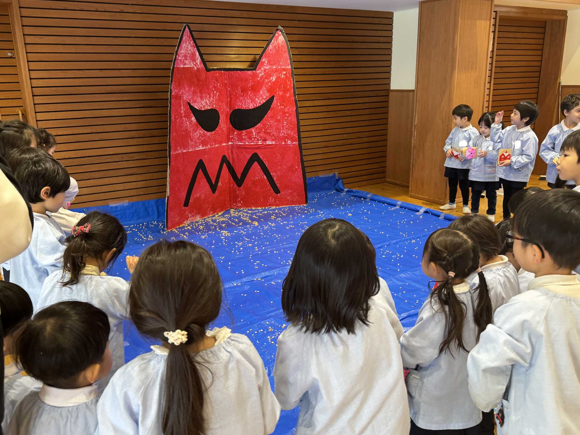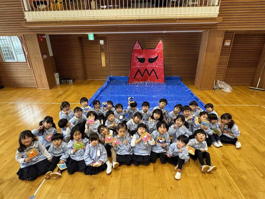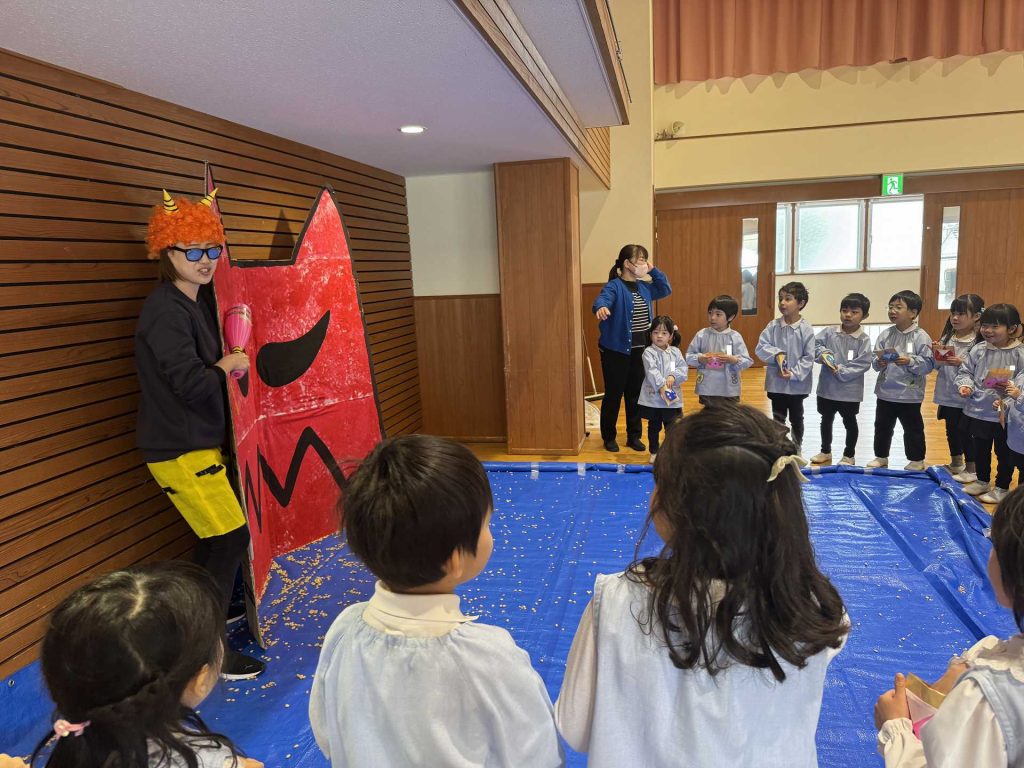 ホールには大きな鬼が!少しドキドキしていると・・・ちがう鬼が登場!!!子ども達はびっくり!!「おにはーそと!」「ふくはーうち!」とお腹の中にいる鬼とお別れするために大きな声でまめまきをし、鬼としっかりさようならできた子ども達でした☆