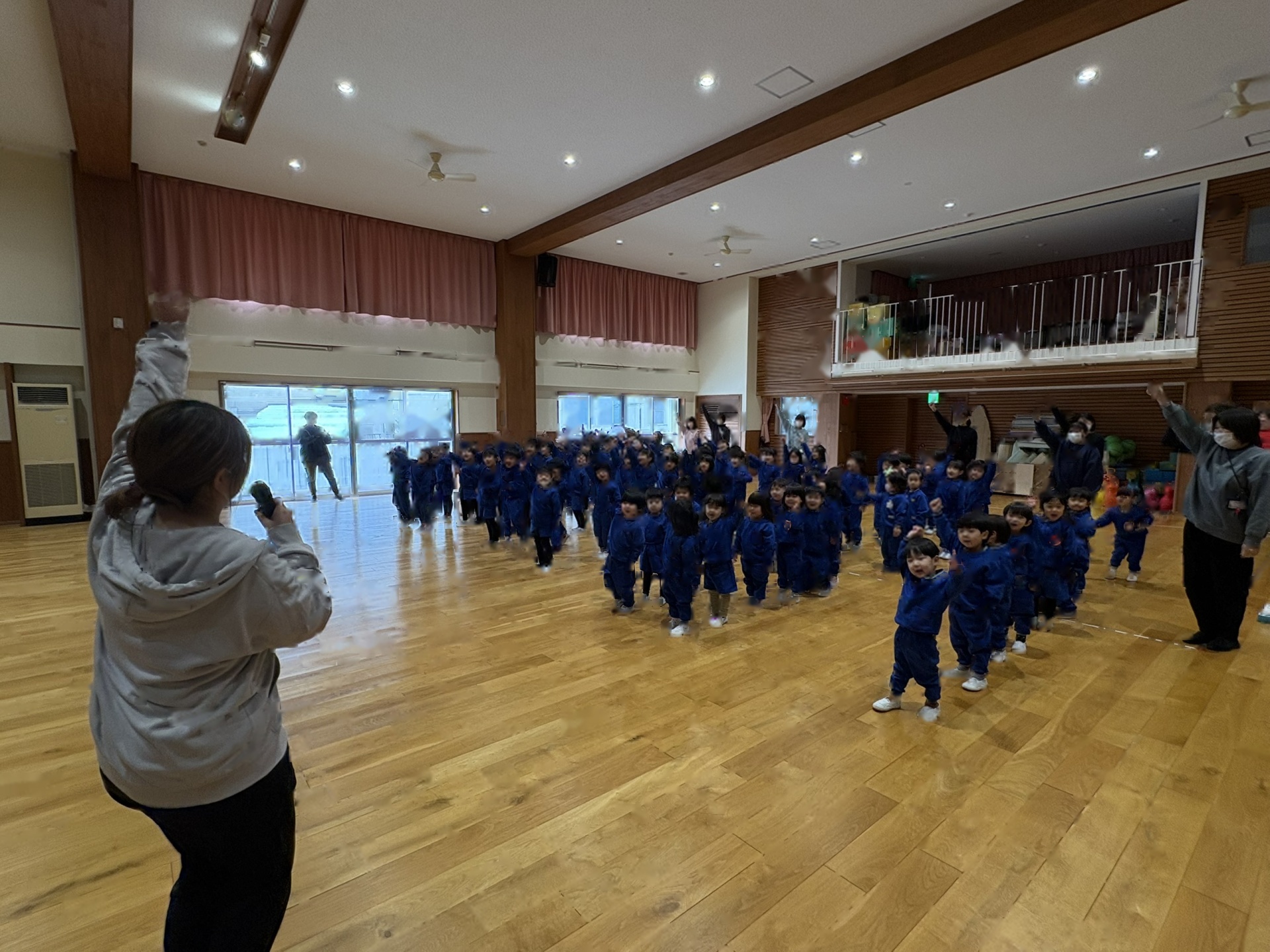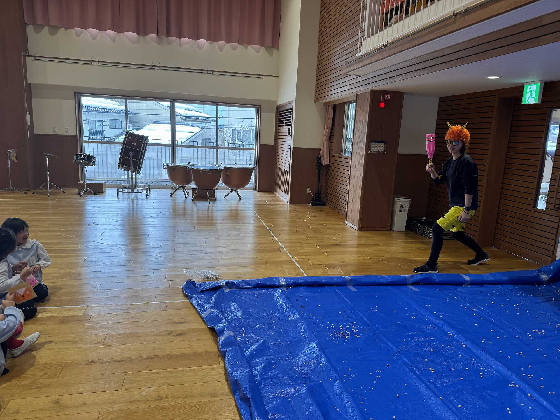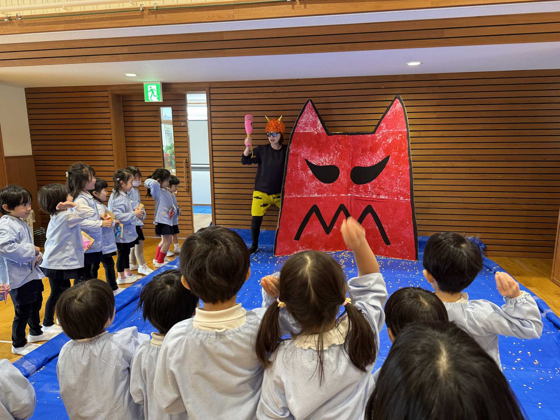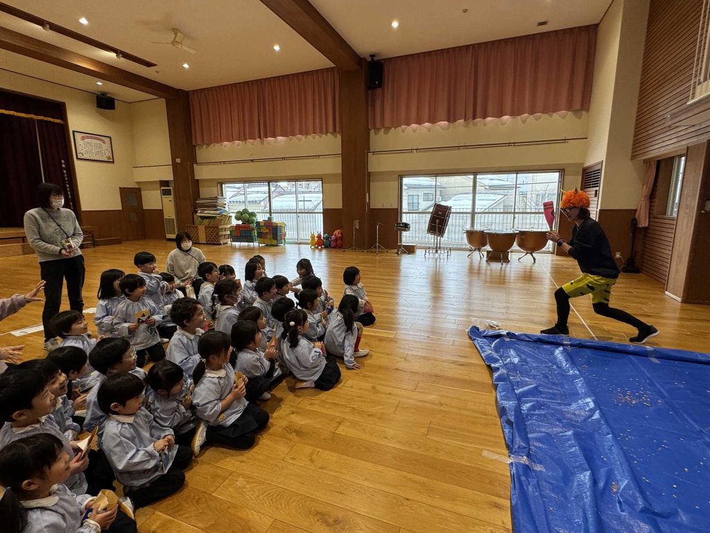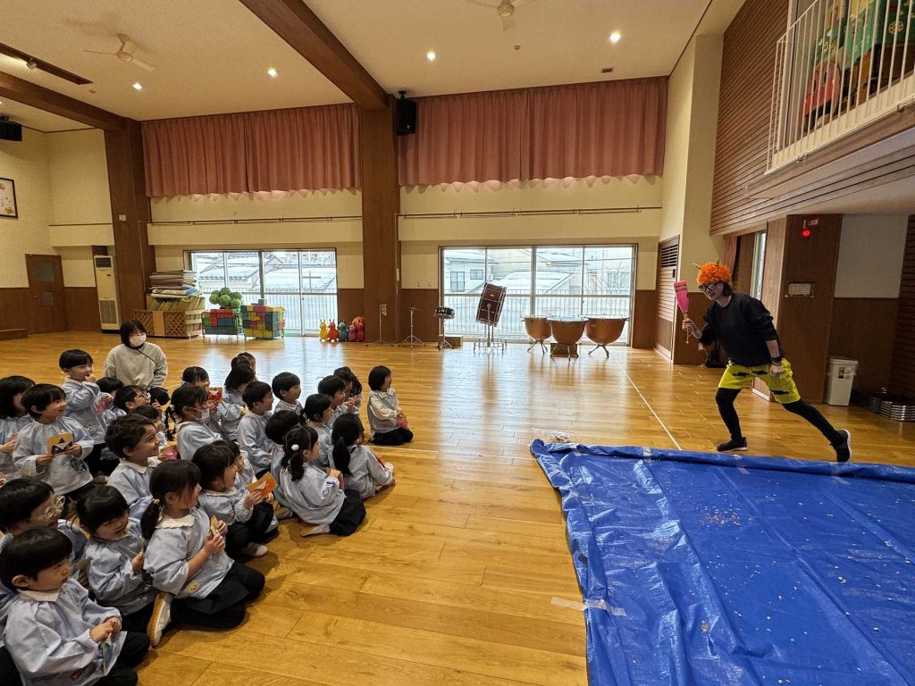 ホールには大きな鬼が!少しドキドキしていると・・・ちがう鬼が登場!!!子ども達はびっくり!!「おにはーそと!」「ふくはーうち!」とお腹の中にいる鬼とお別れするために大きな声でまめまきをし、鬼としっかりさようならできた子ども達でした☆