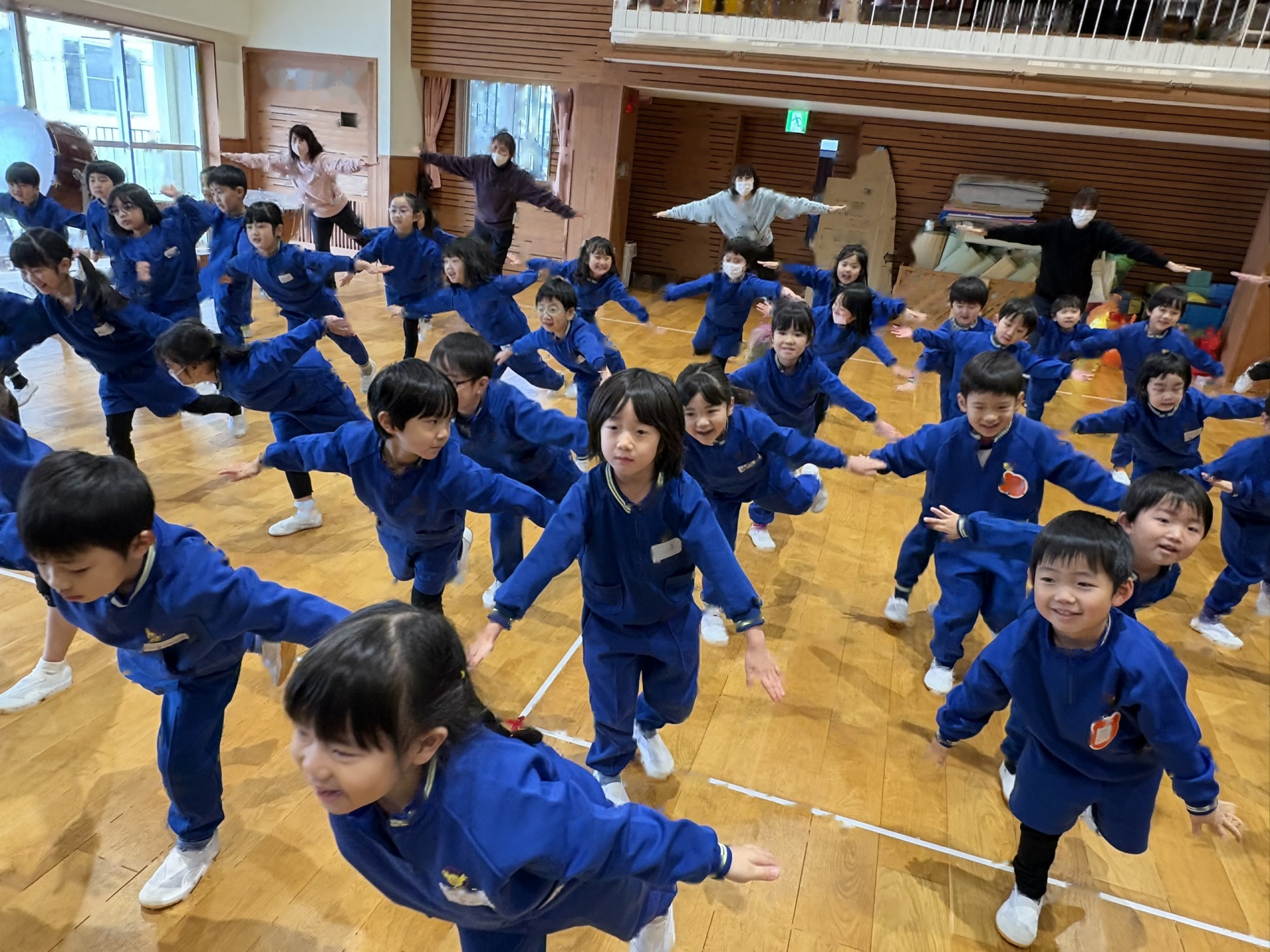 ★みんなで挑戦タイム!先生のだす指示を聞きながら、フラミンゴになったり、飛行機になったりと足をつけないように気をつけながら楽しく活動しました。「グラグラする~」と大盛り上がりの子ども達でした。