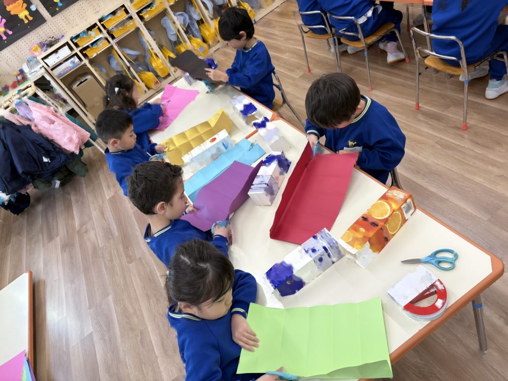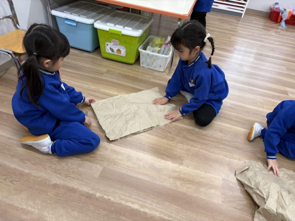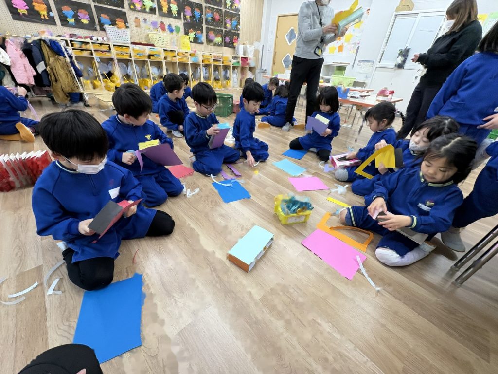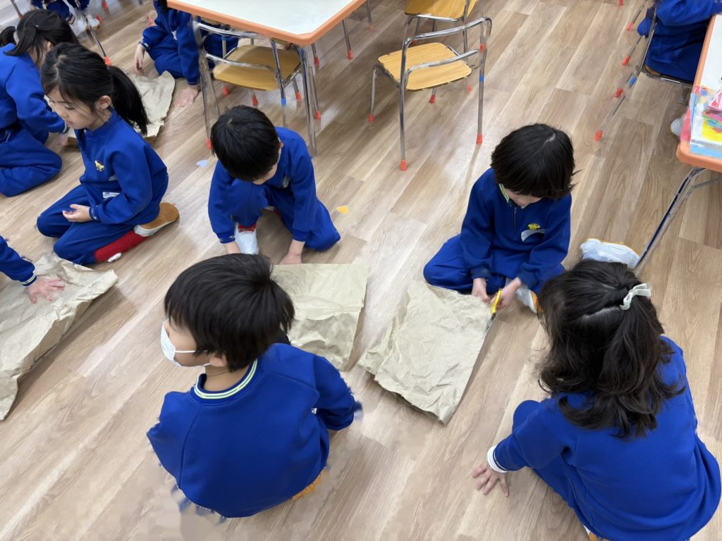 次は「三匹のこぶた」のペープサートのはじまりはじまり・・・年長組の子ども達が作ったかわいいペープサートにとても興味津々で、おおかみと一緒にフ―!!と息を吹いたり、おおかみから逃げる場面ではハラハラしたり・・・と三匹のこぶたの世界に入り込んでいました。